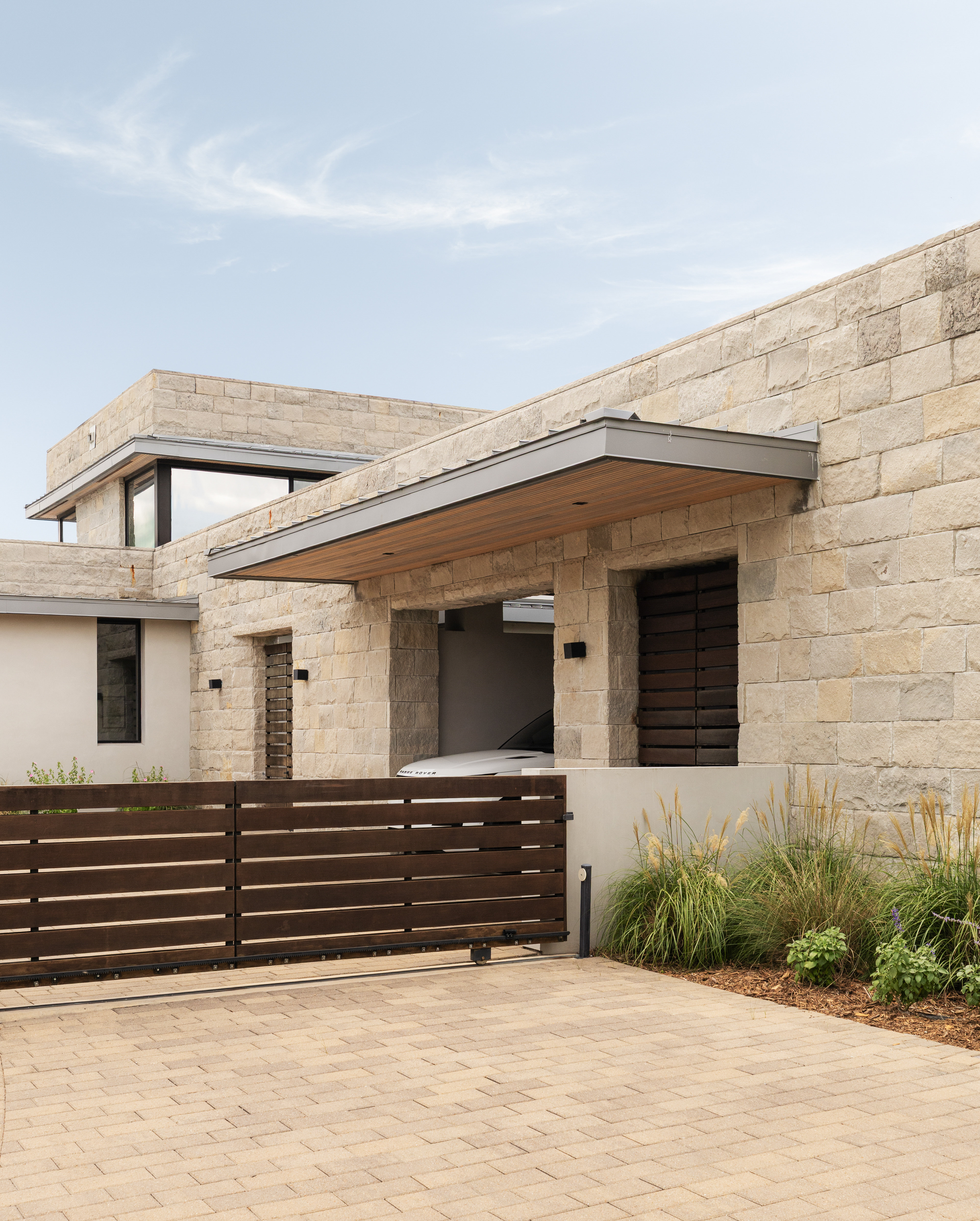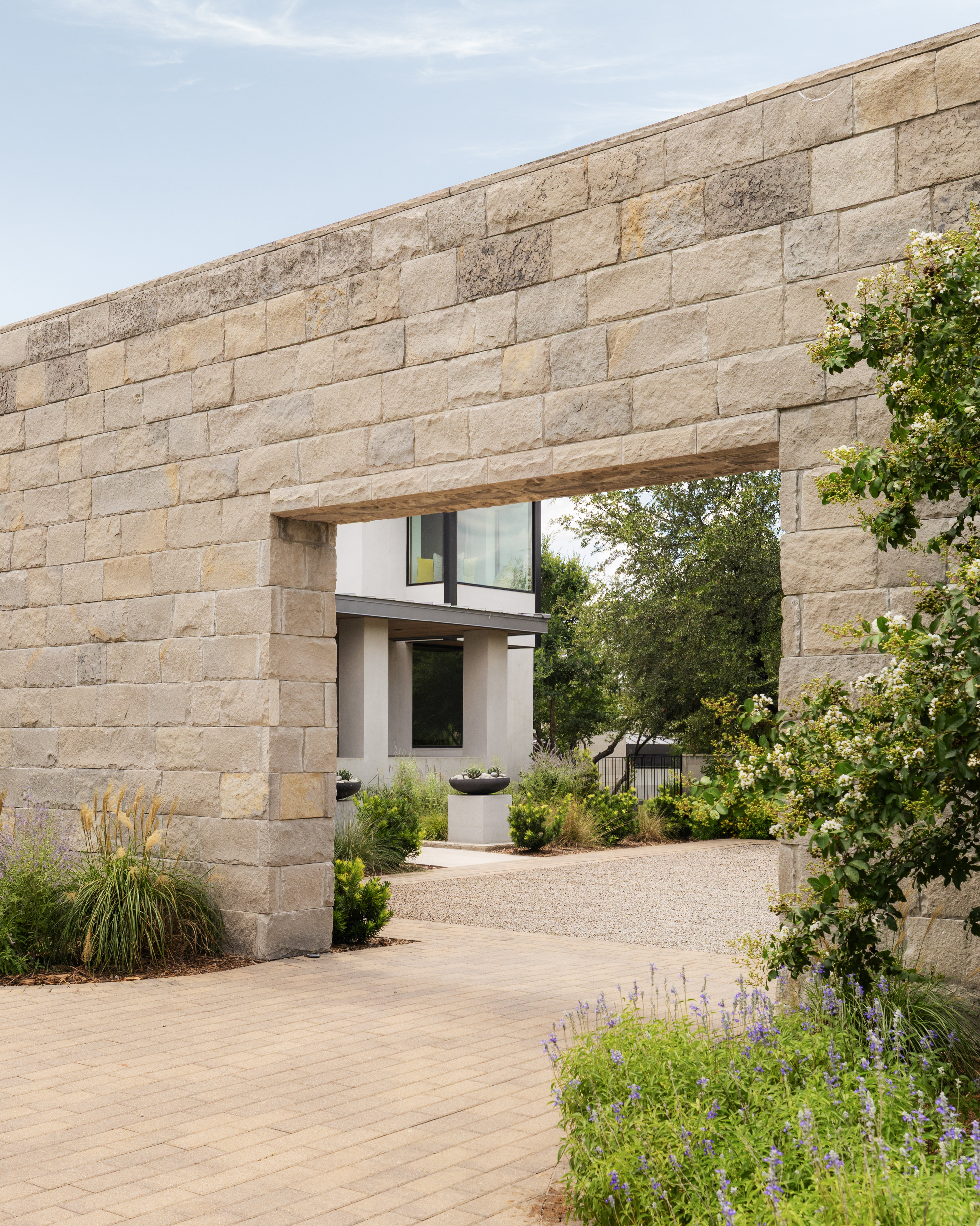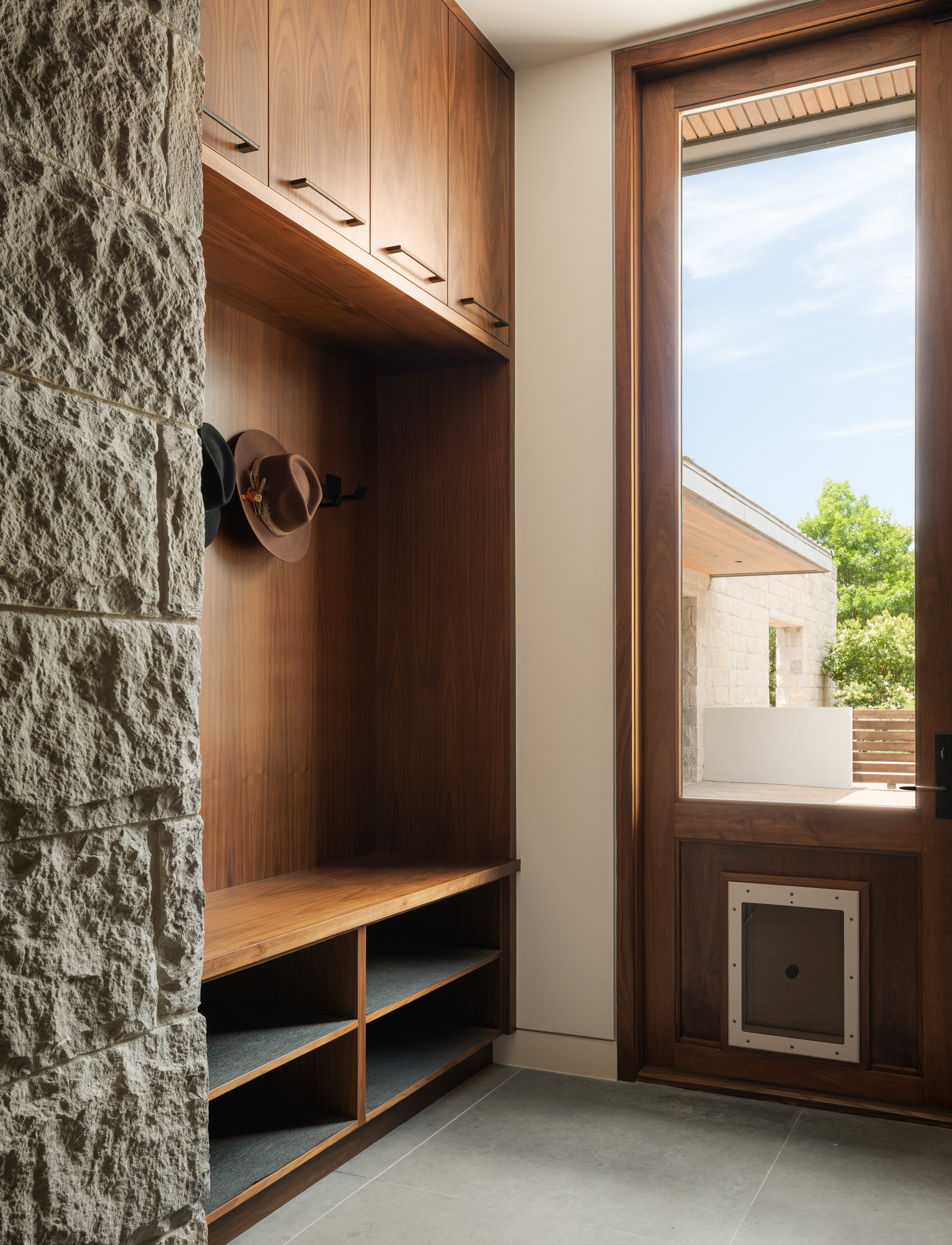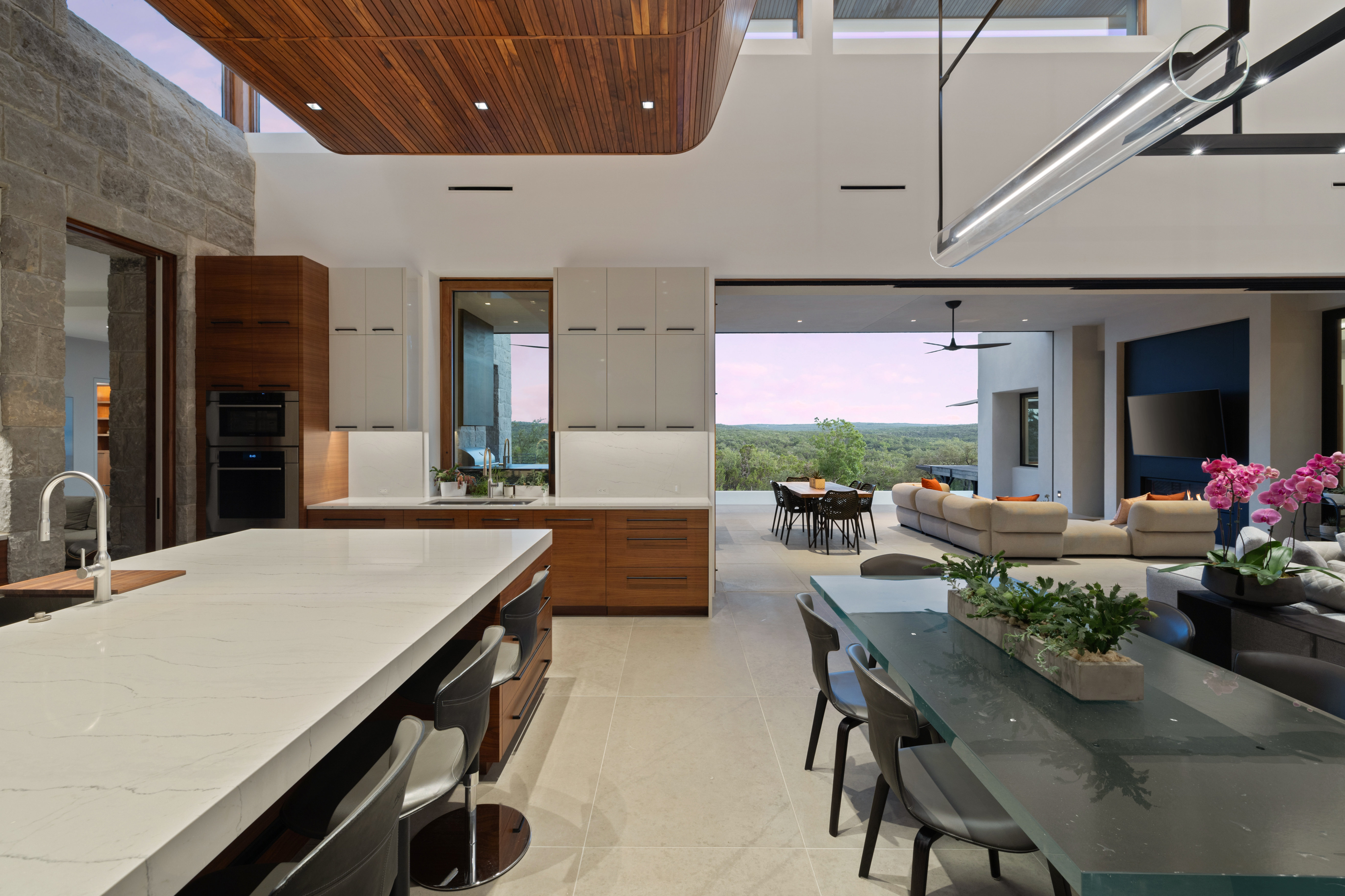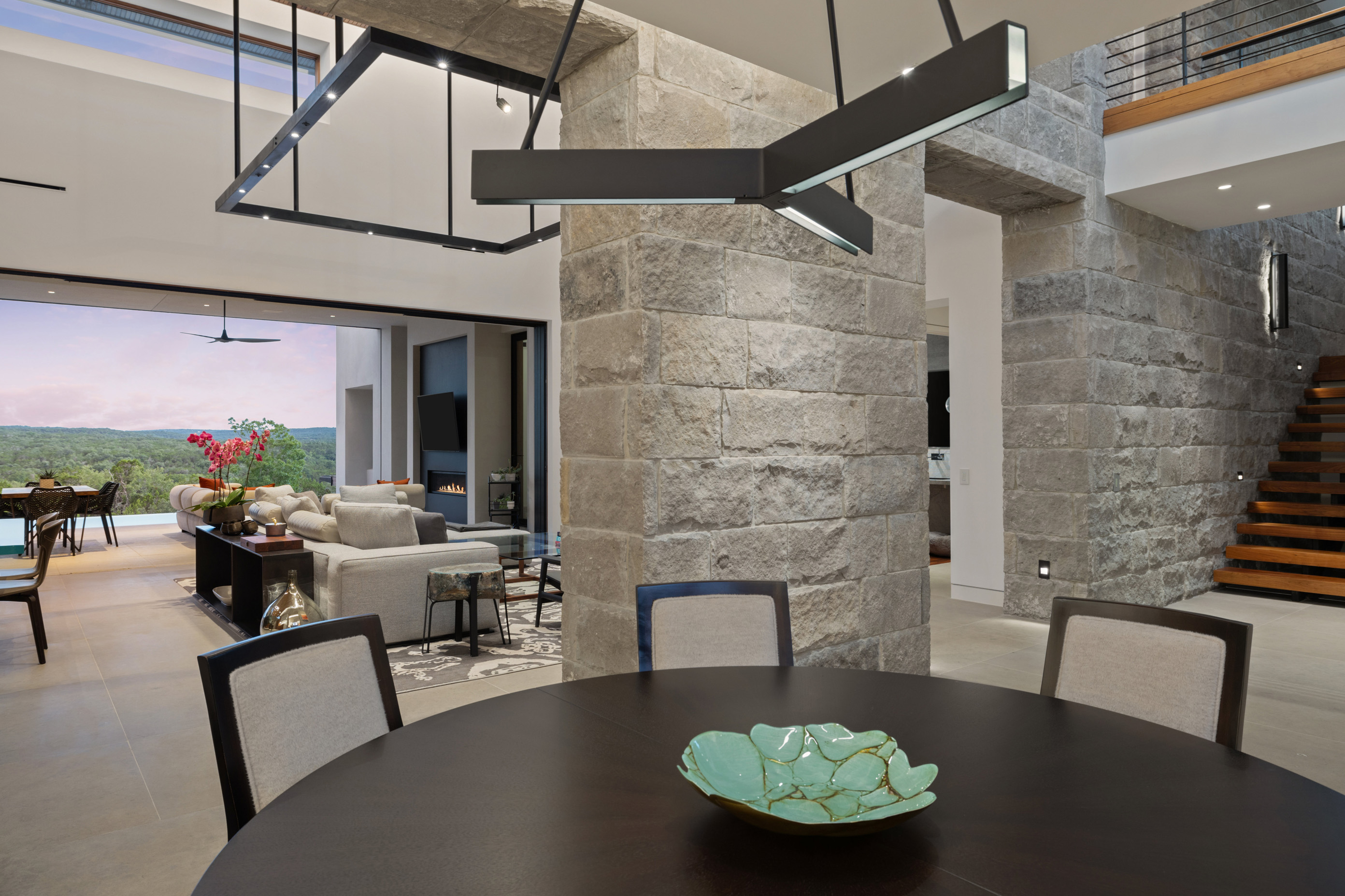 Floors and walls are wrapped in gray Leuders limestone, locally sourced from Leuders, TX, and paired with quartz countertops, custom lacquer cabinetry, and warm walnut millwork throughout. The entire home is equipped with high-efficiency LED lighting (all lights are 95+ CRI, 3000K color temperature) for consistent ambiance and visual comfort.