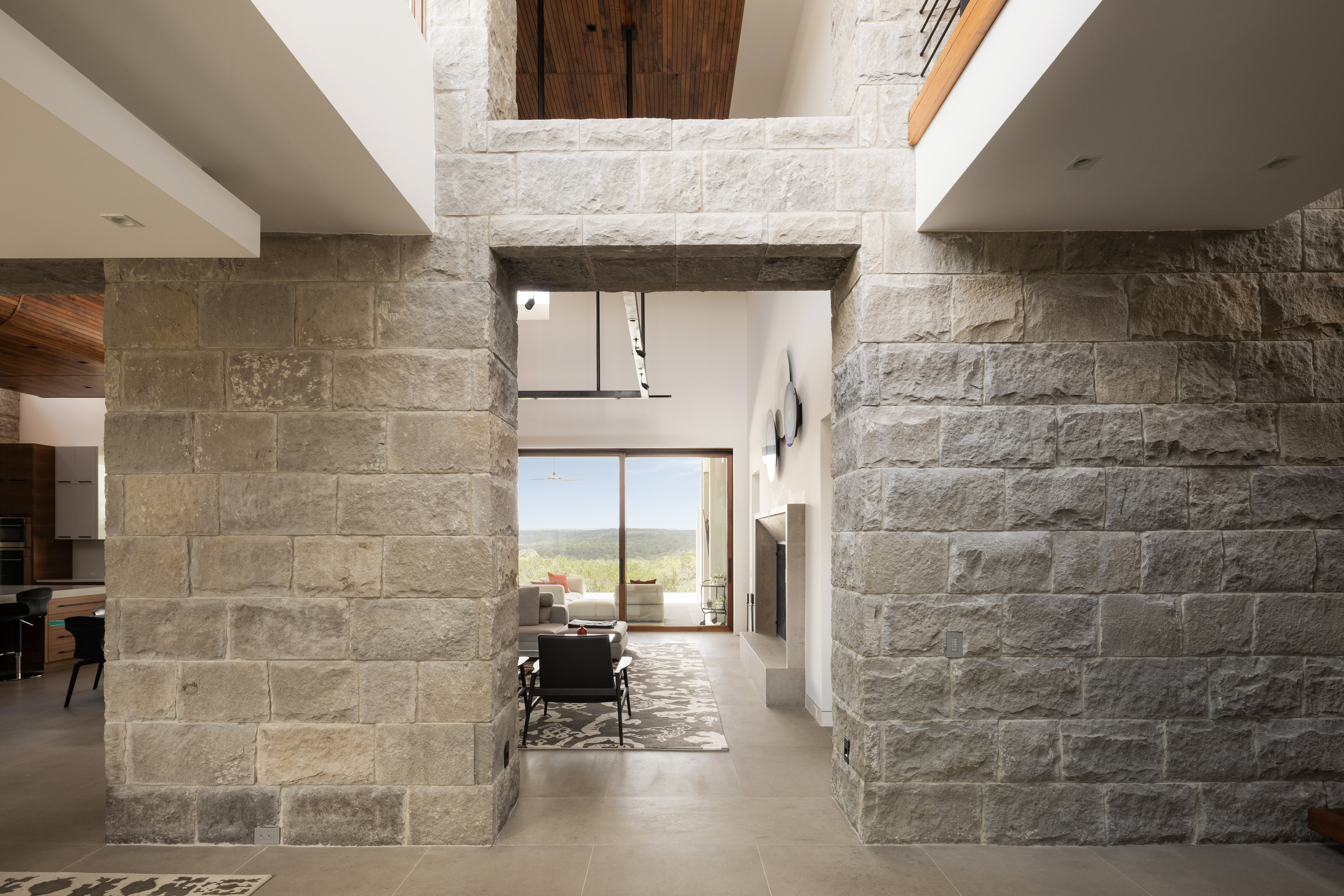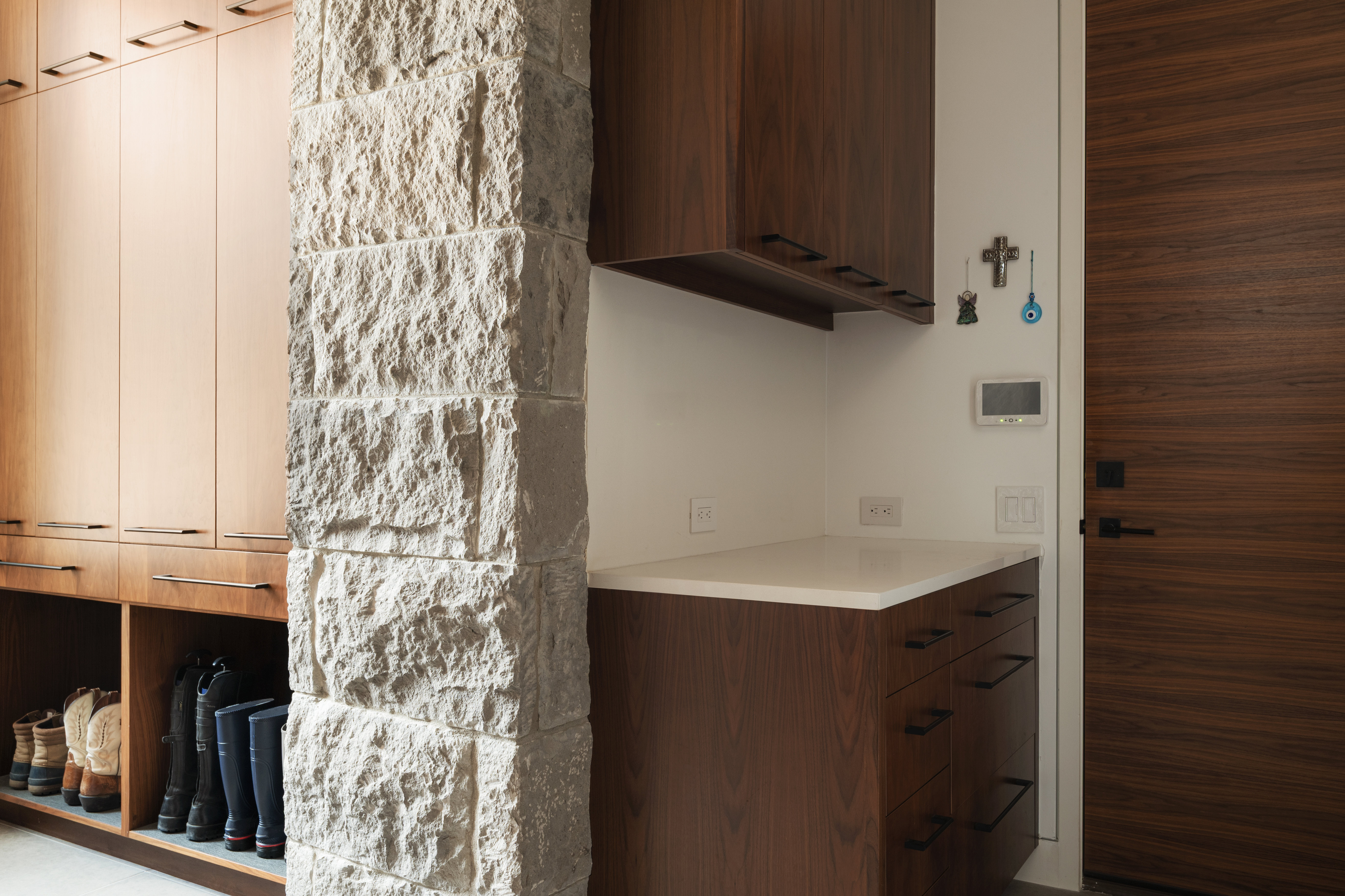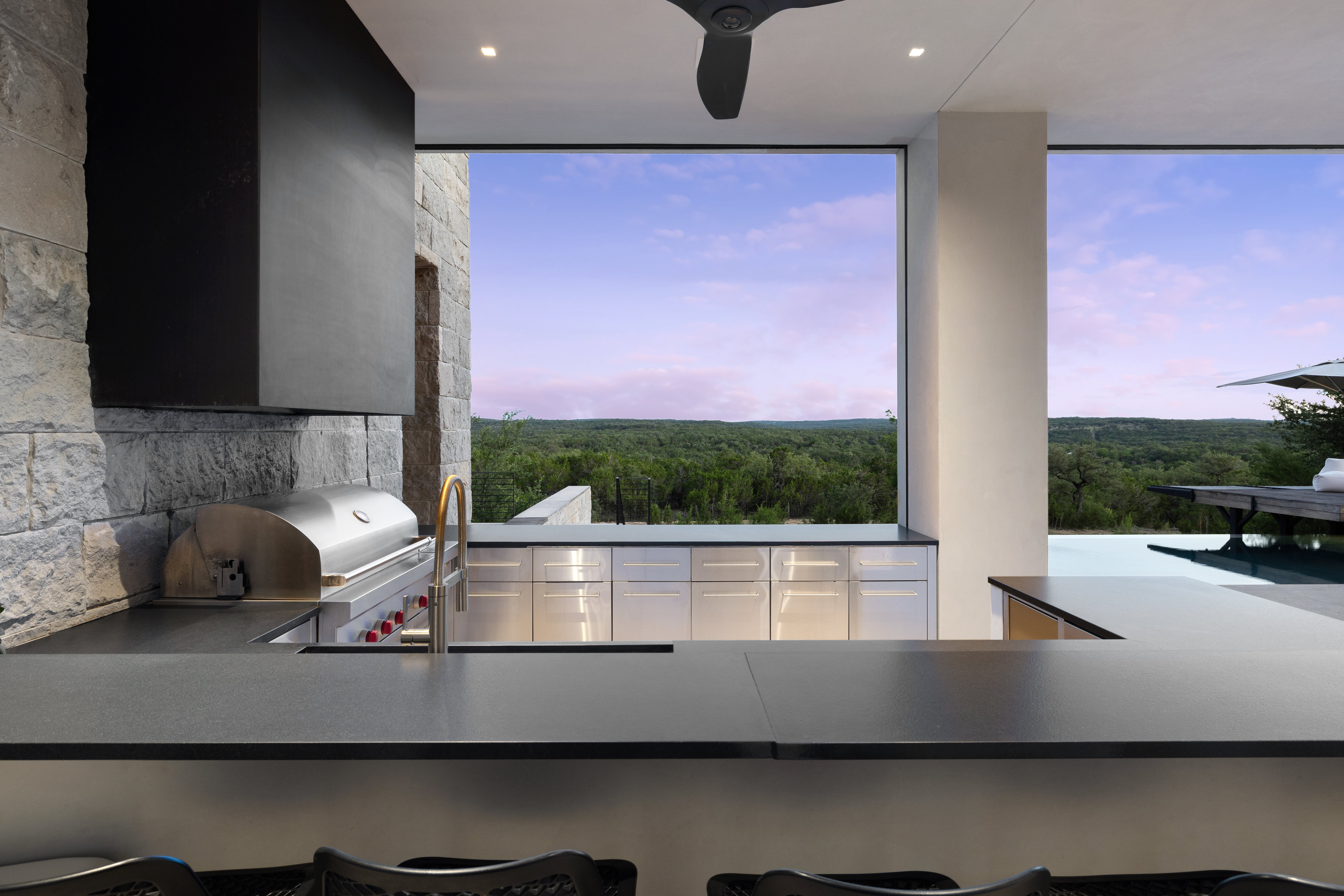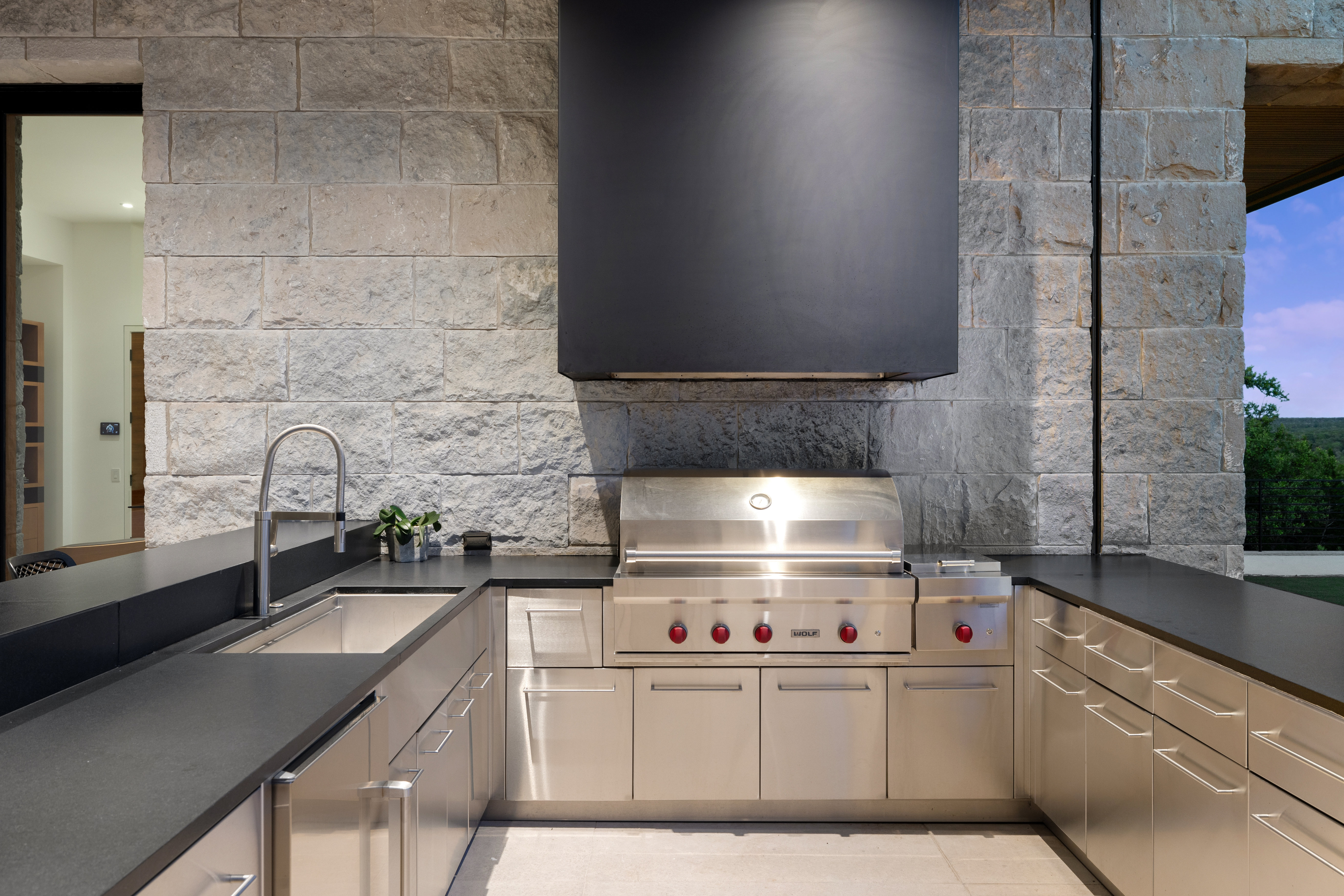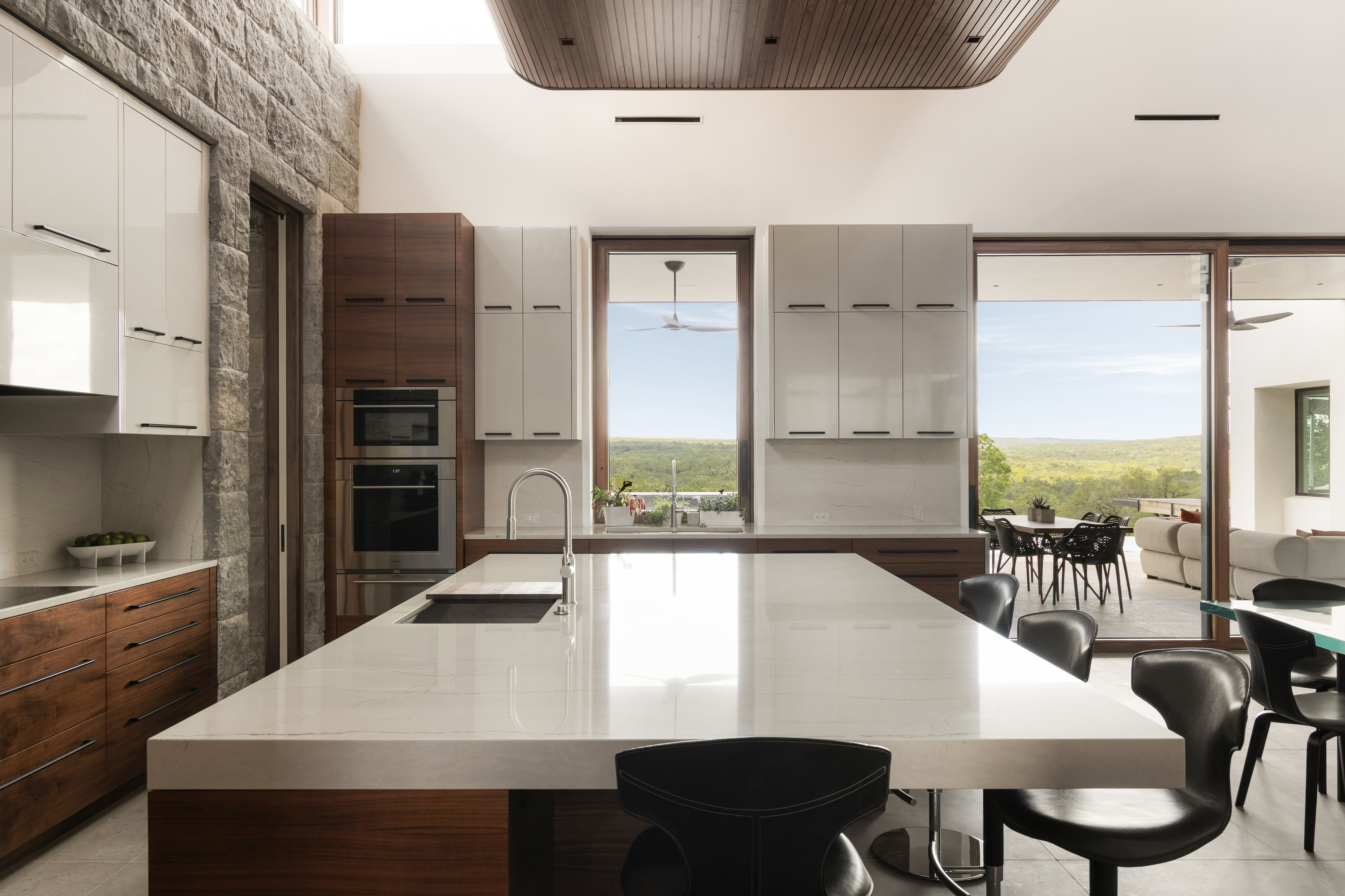 Floors and walls are wrapped in gray Leuders limestone, locally sourced from Leuders, TX, and paired with quartz countertops, custom lacquer cabinetry, and warm walnut millwork throughout. The entire home is equipped with high-efficiency LED lighting (all lights are 95+ CRI, 3000K color temperature) for consistent ambiance and visual comfort.