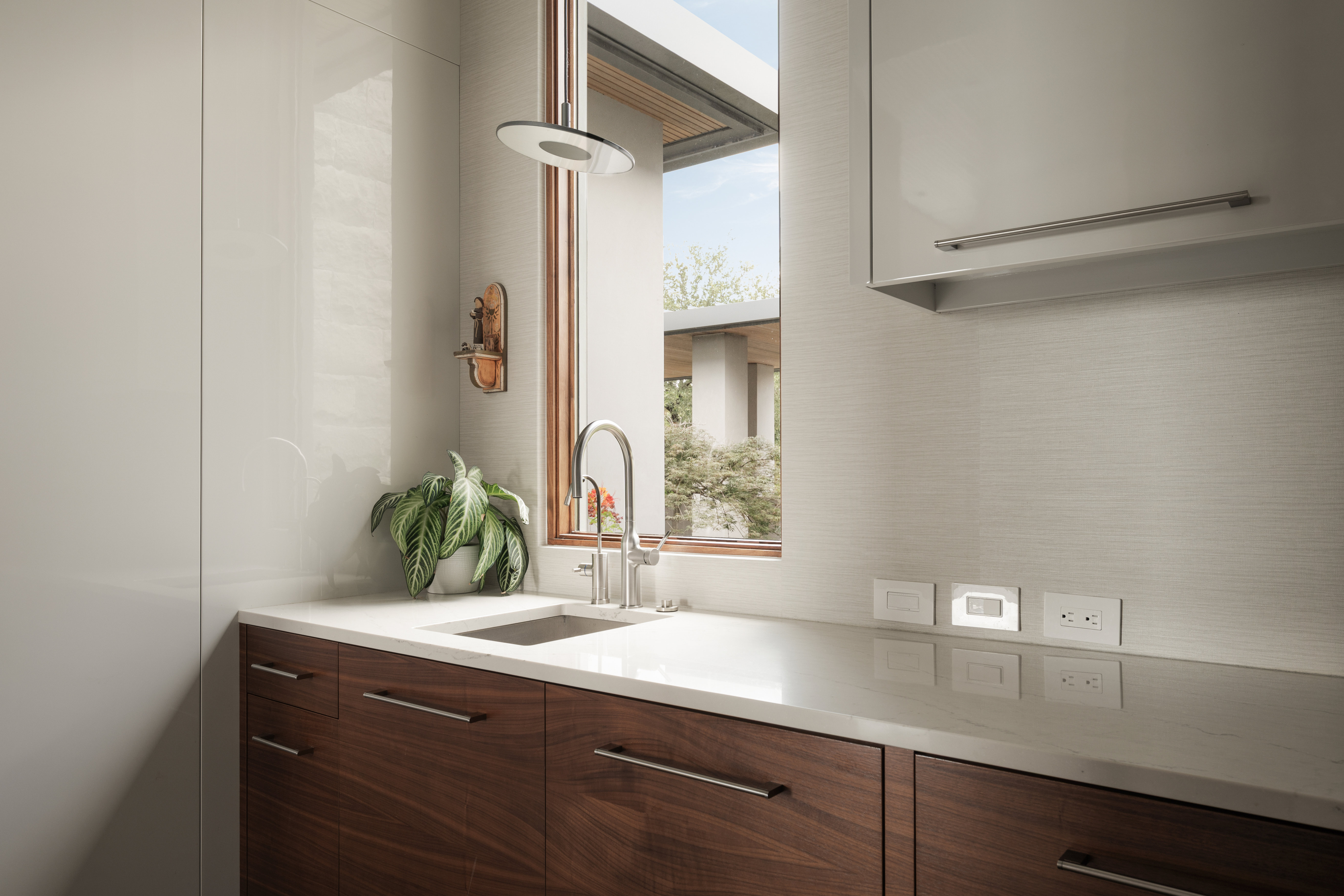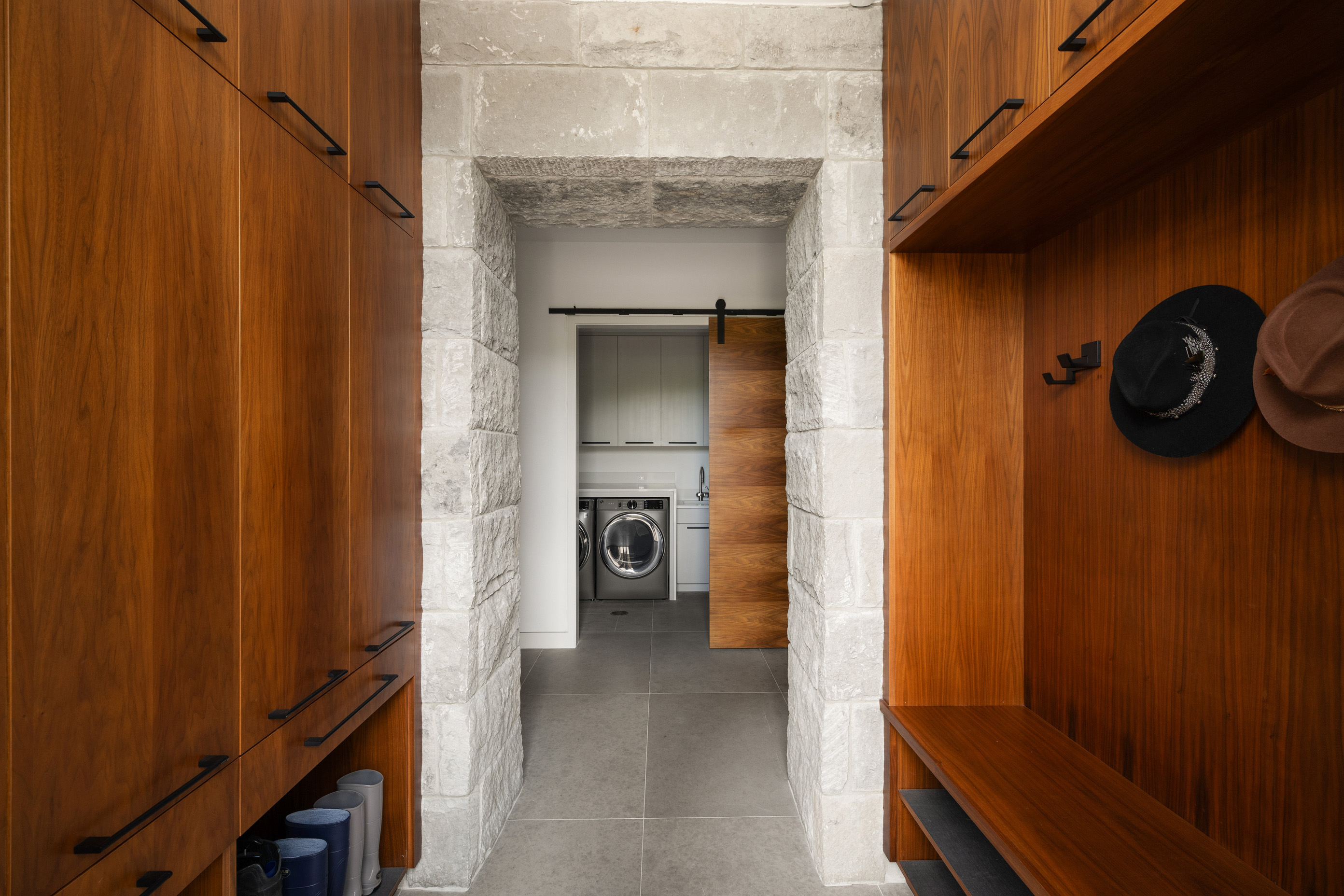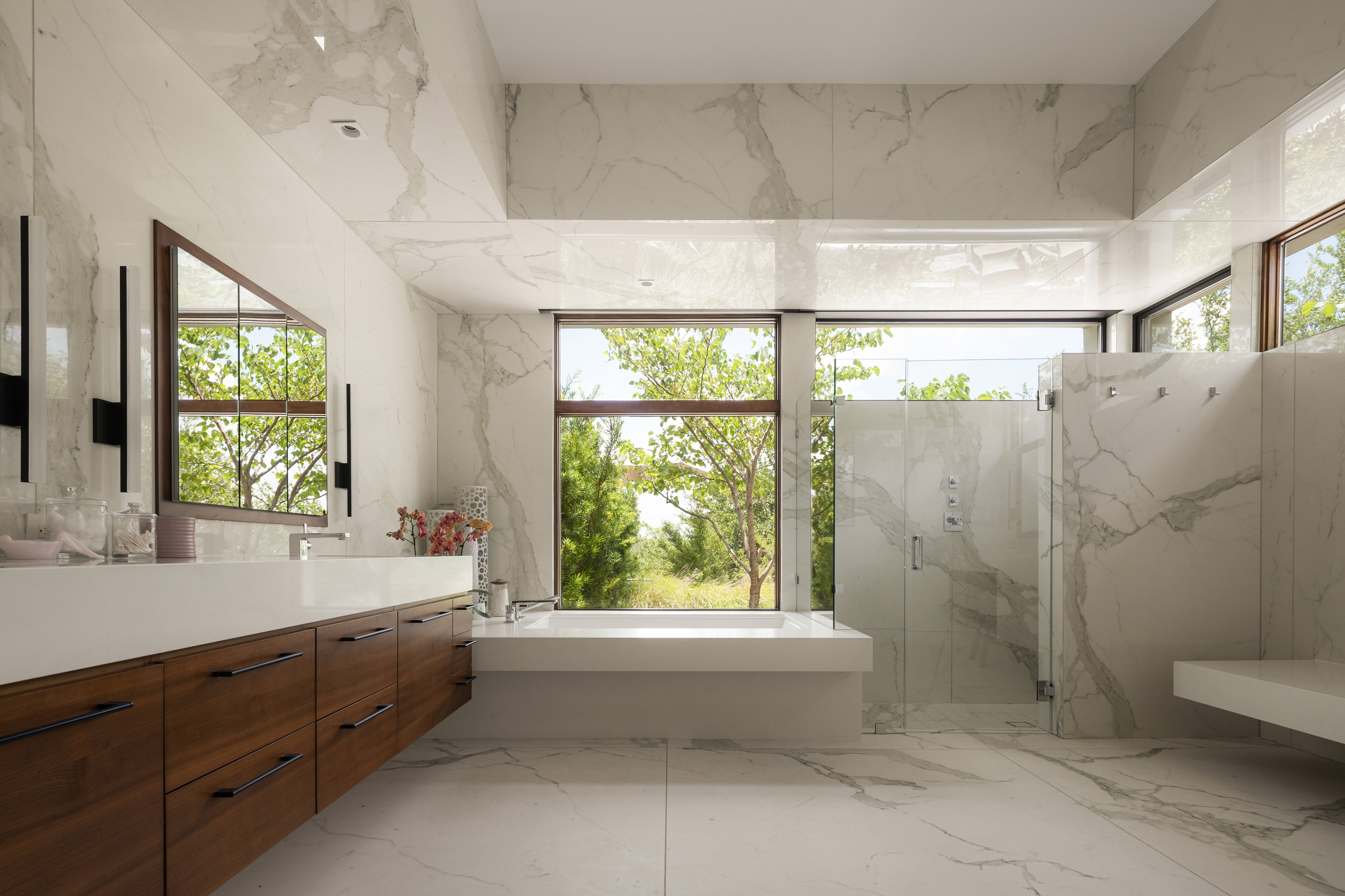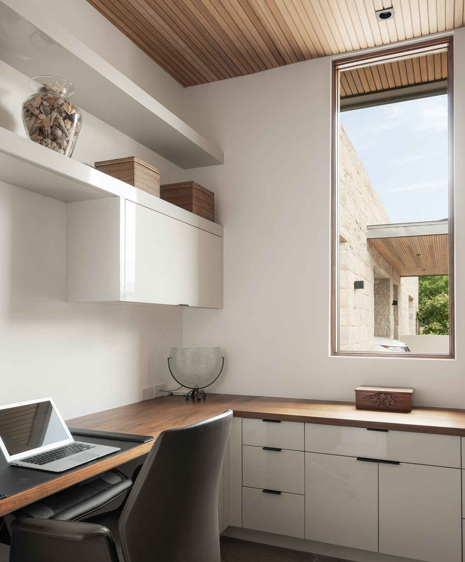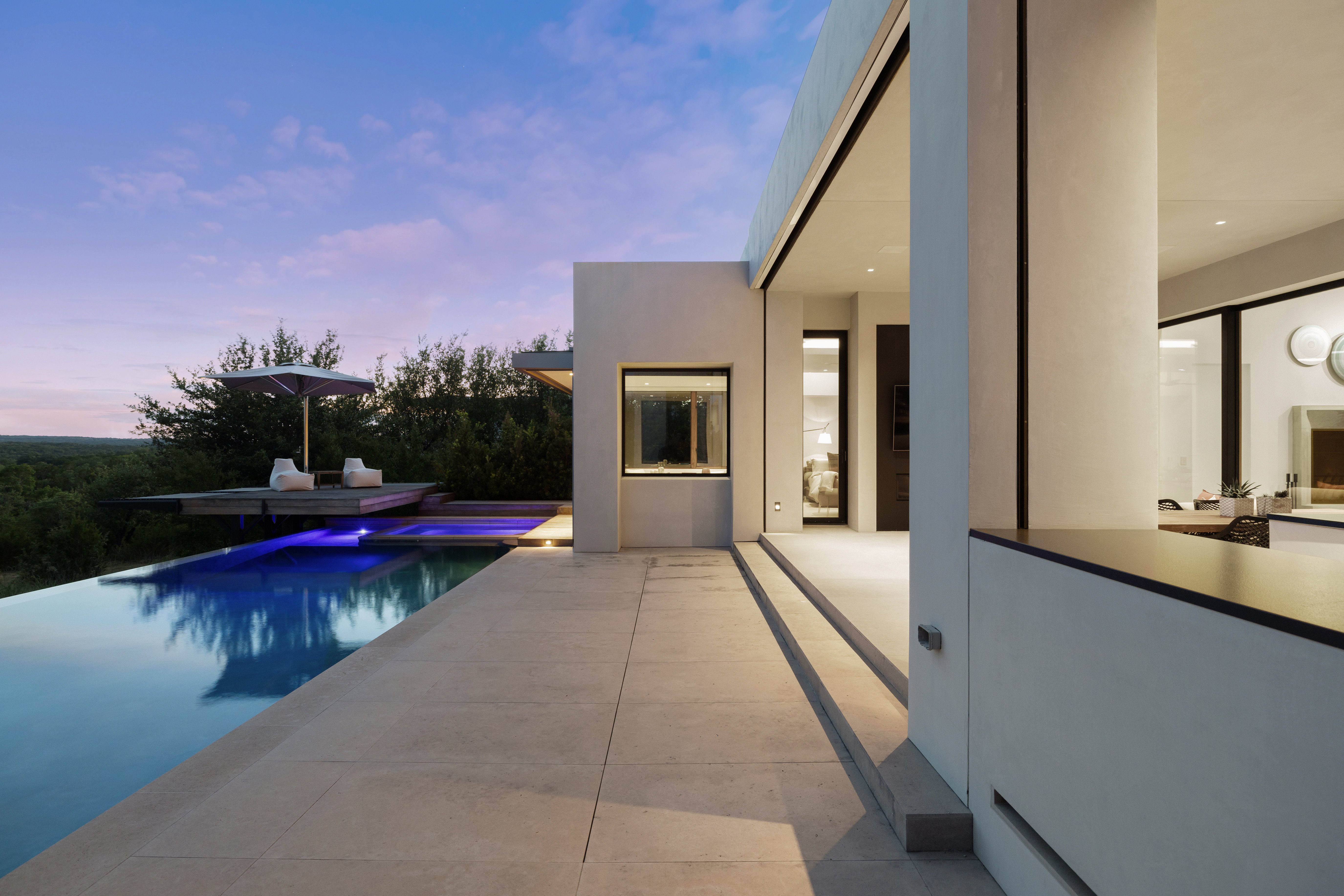 Floors and walls are wrapped in gray Leuders limestone, locally sourced from Leuders, TX, and paired with quartz countertops, custom lacquer cabinetry, and warm walnut millwork throughout. The entire home is equipped with high-efficiency LED lighting (all lights are 95+ CRI, 3000K color temperature) for consistent ambiance and visual comfort.