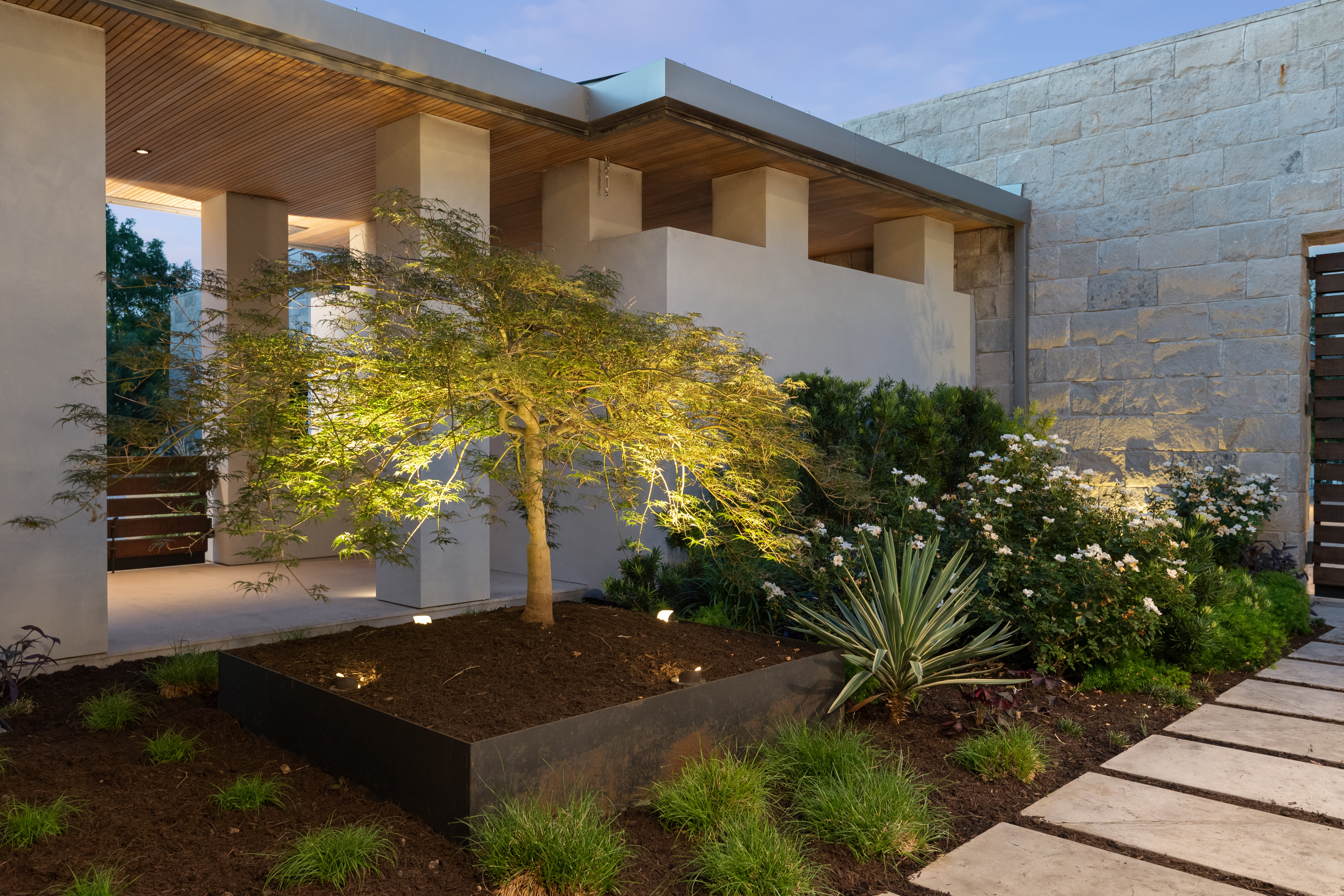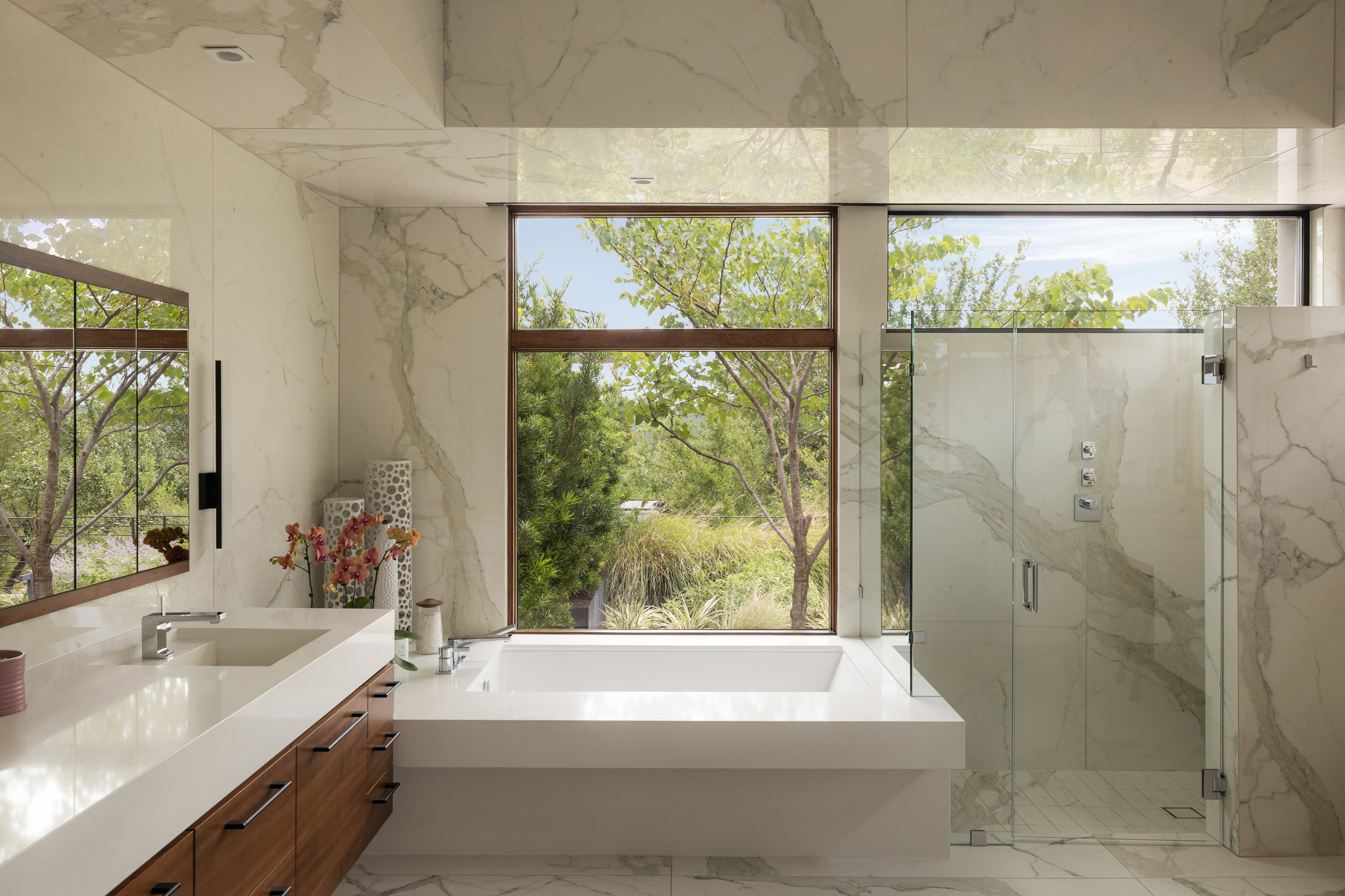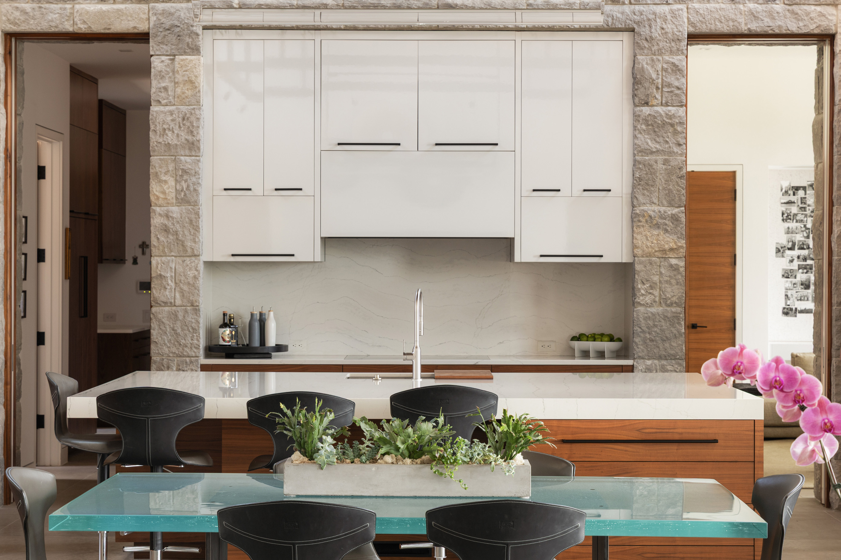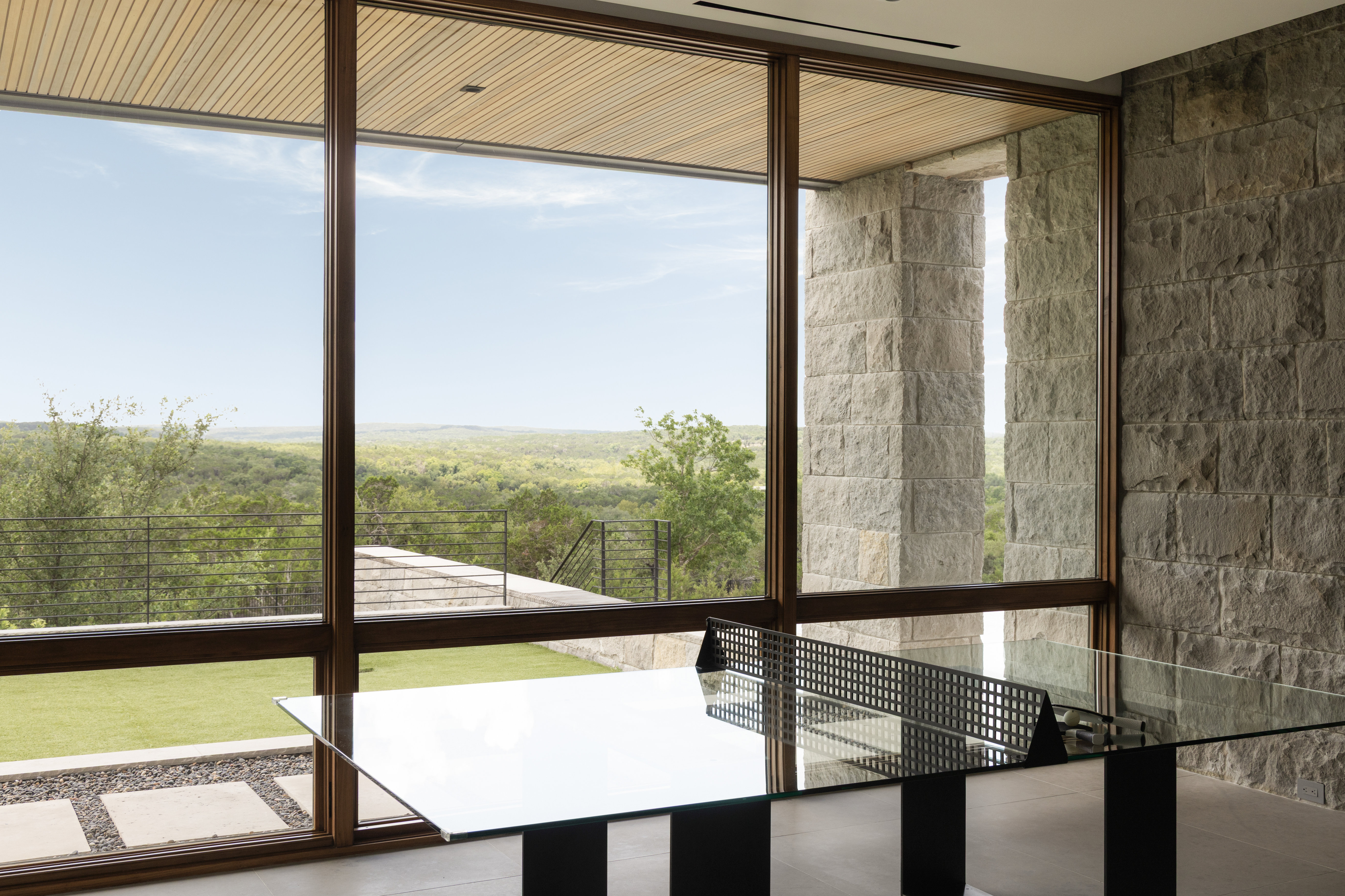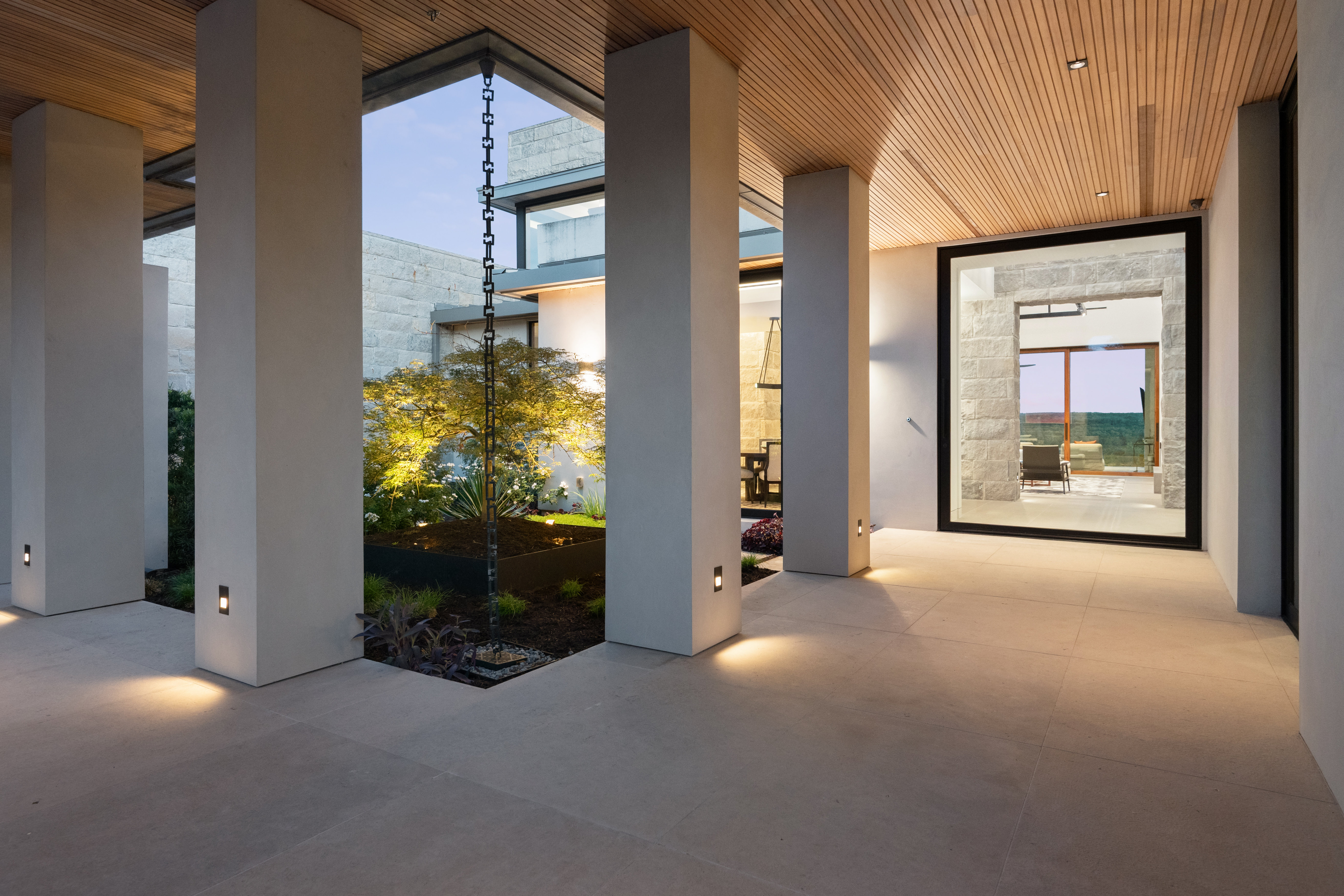 Floors and walls are wrapped in gray Leuders limestone, locally sourced from Leuders, TX, and paired with quartz countertops, custom lacquer cabinetry, and warm walnut millwork throughout. The entire home is equipped with high-efficiency LED lighting (all lights are 95+ CRI, 3000K color temperature) for consistent ambiance and visual comfort.