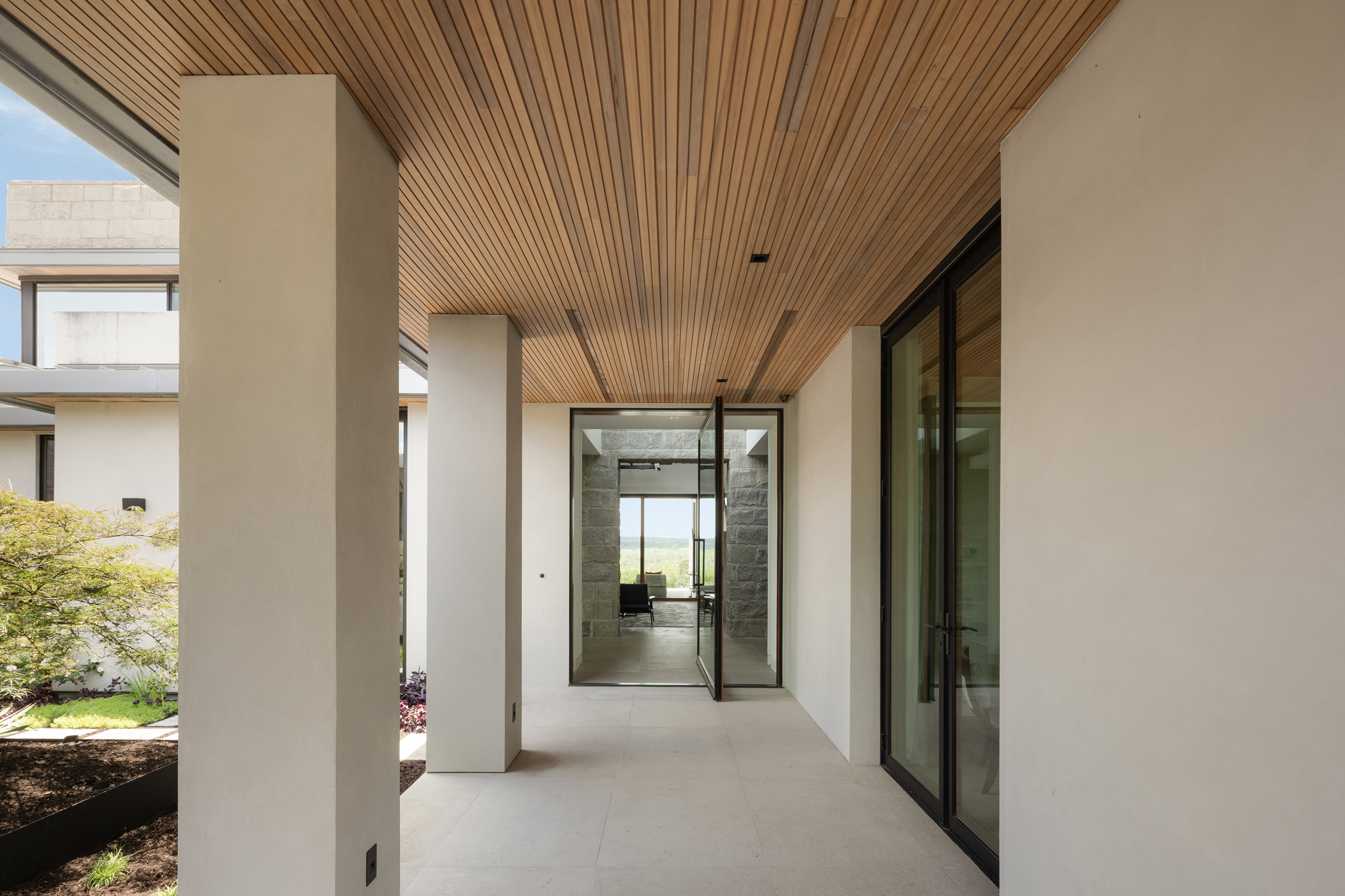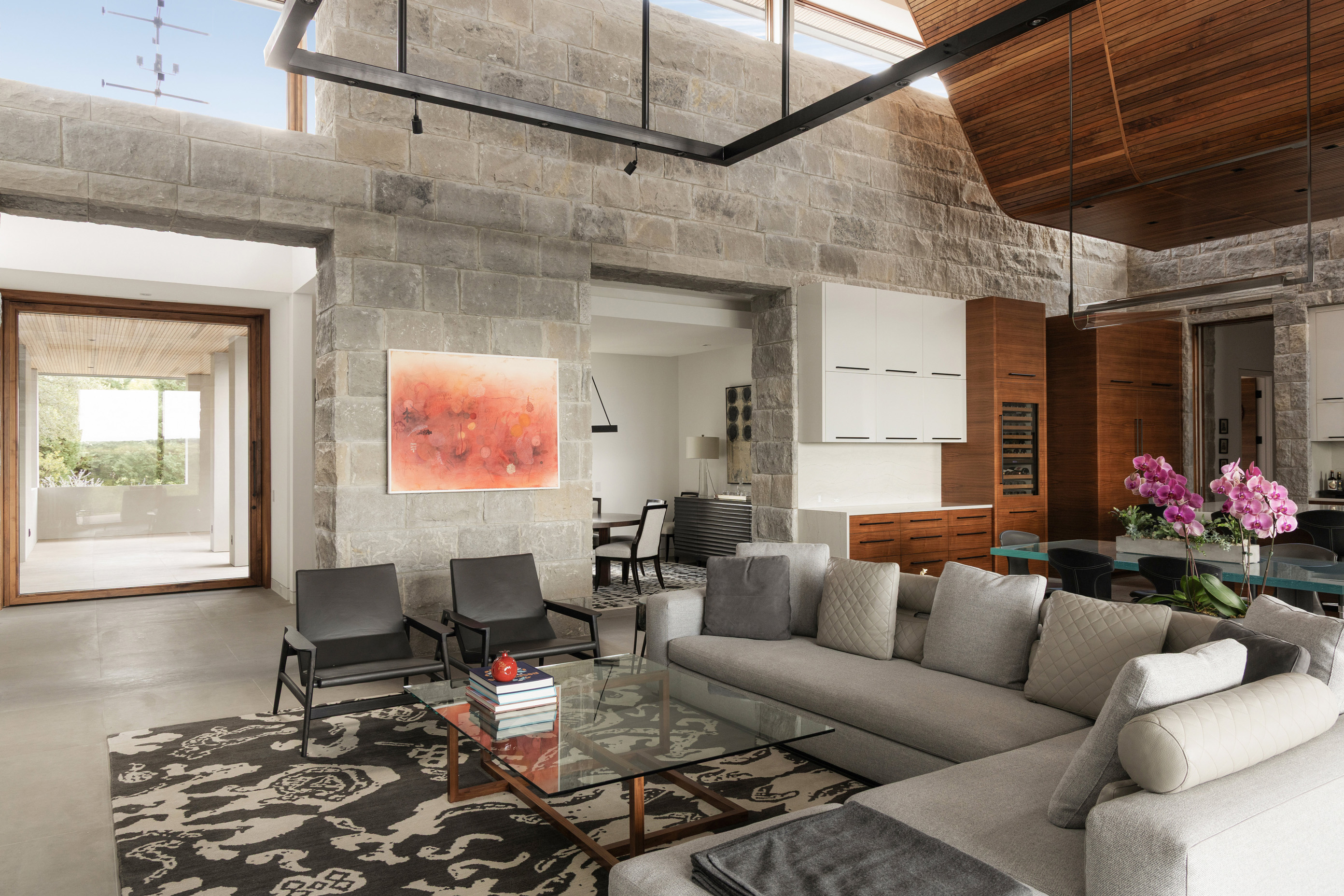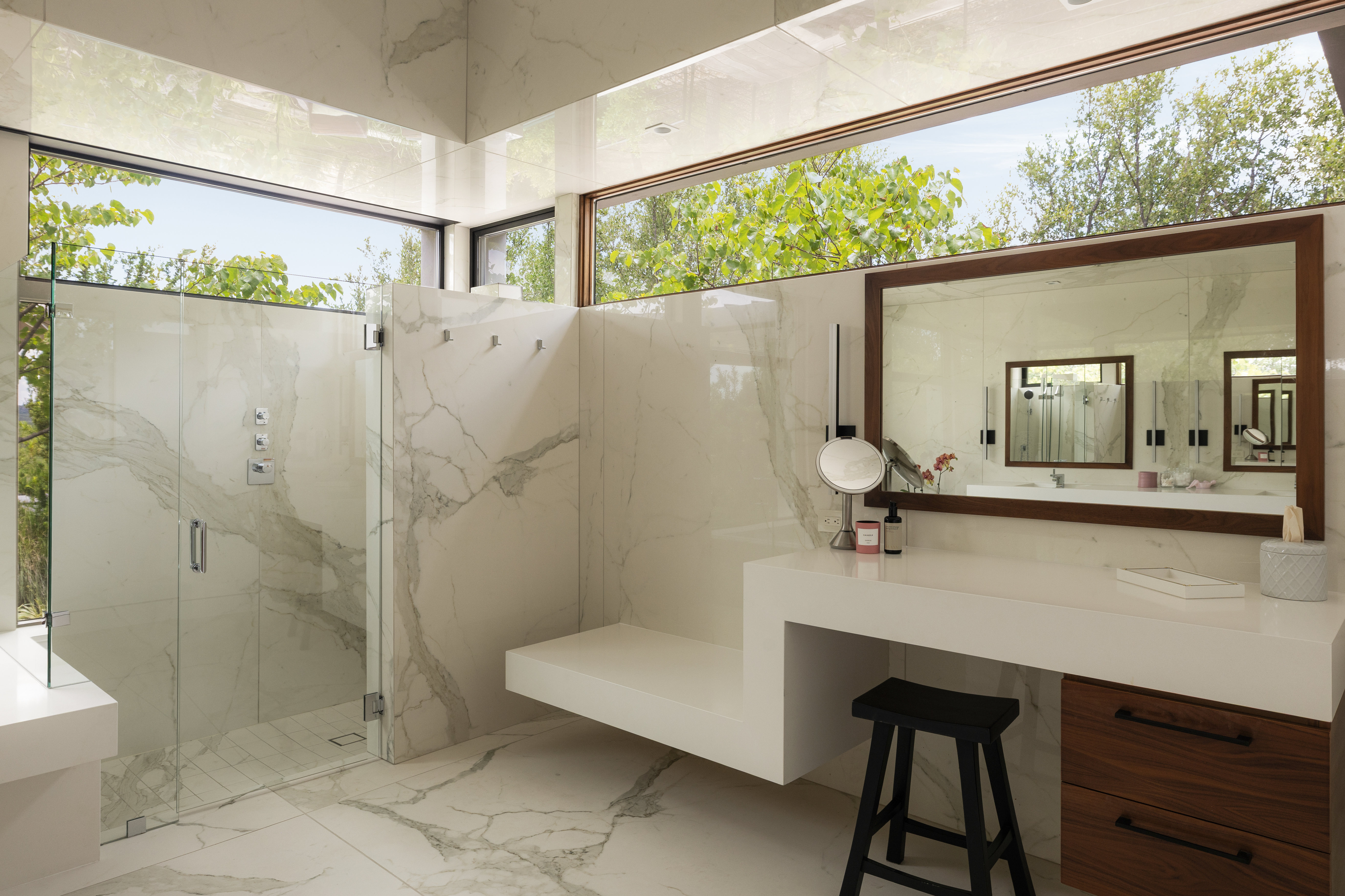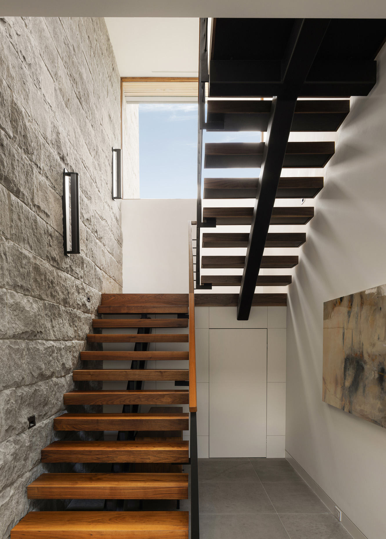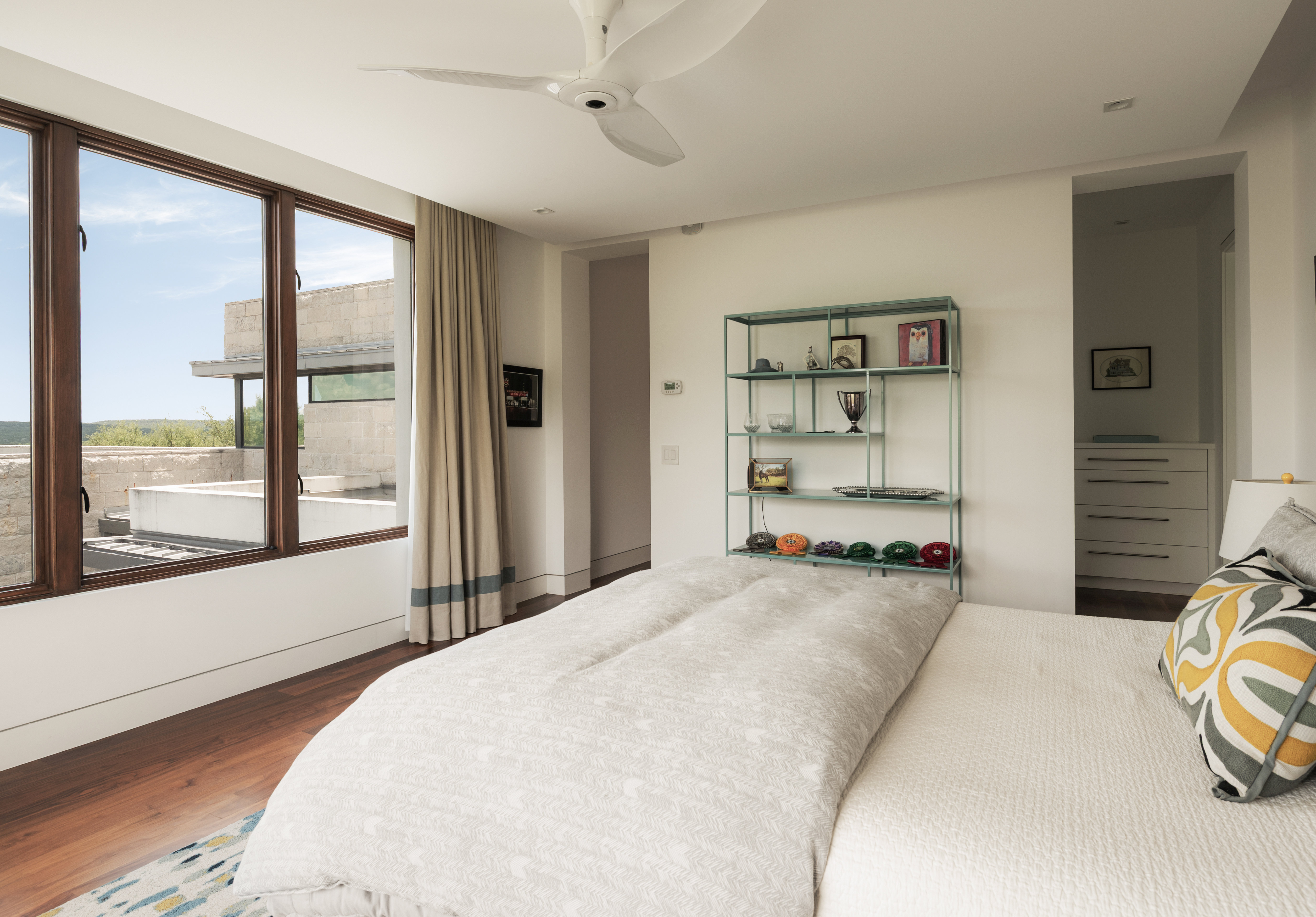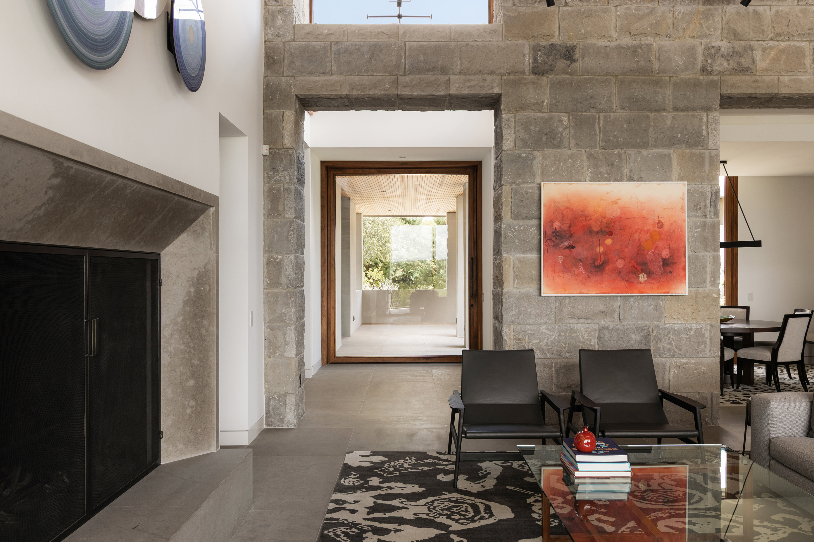 Floors and walls are wrapped in gray Leuders limestone, locally sourced from Leuders, TX, and paired with quartz countertops, custom lacquer cabinetry, and warm walnut millwork throughout. The entire home is equipped with high-efficiency LED lighting (all lights are 95+ CRI, 3000K color temperature) for consistent ambiance and visual comfort.