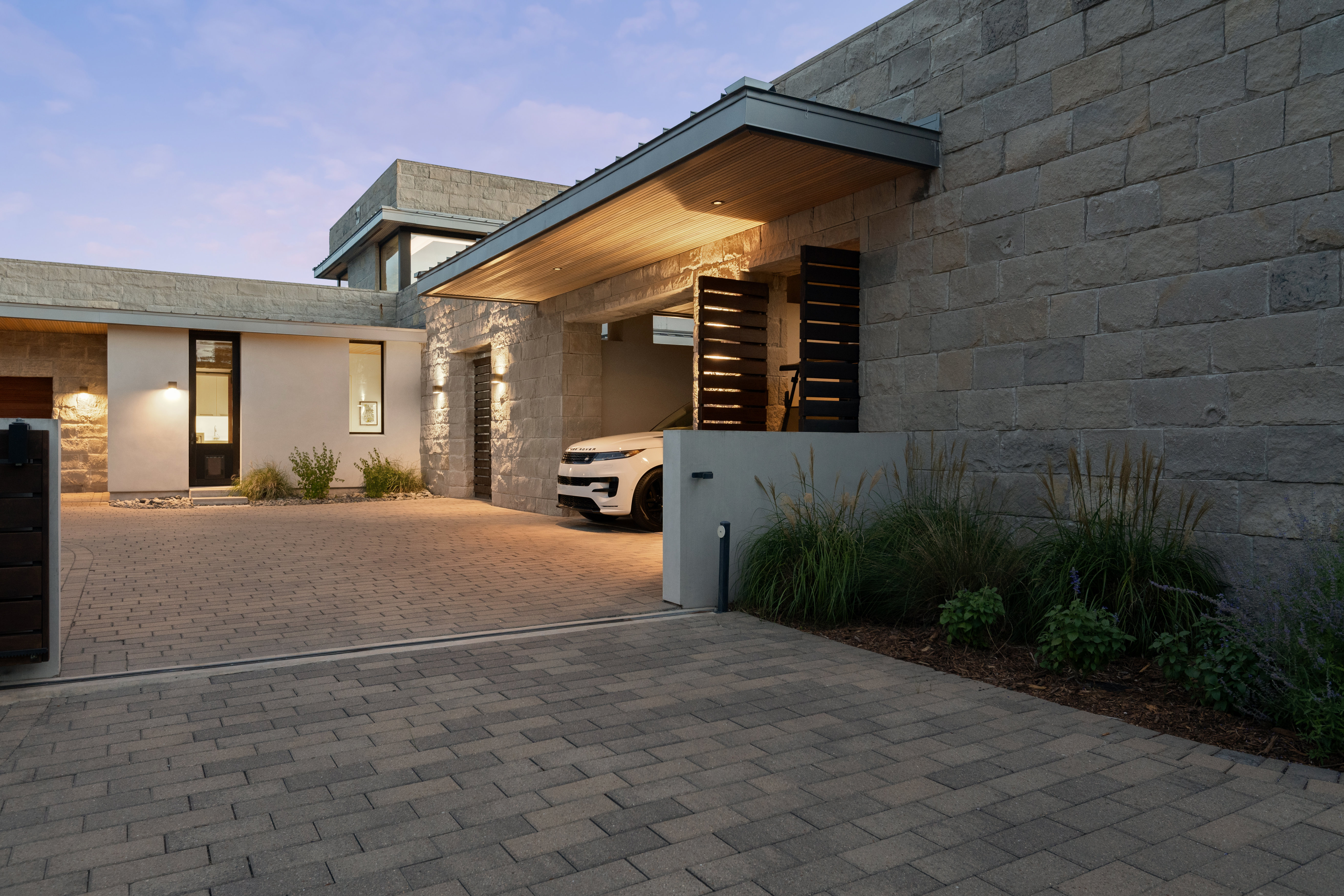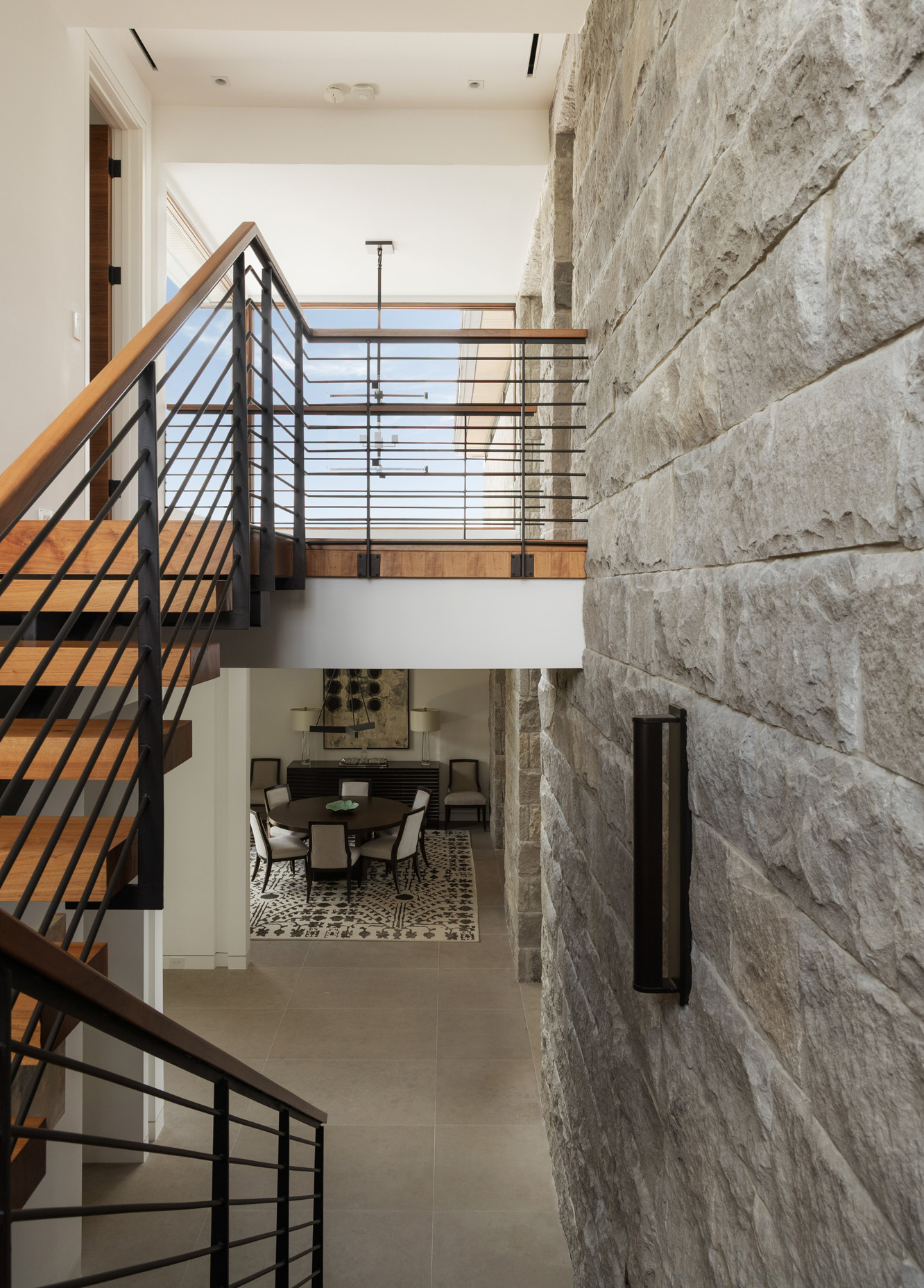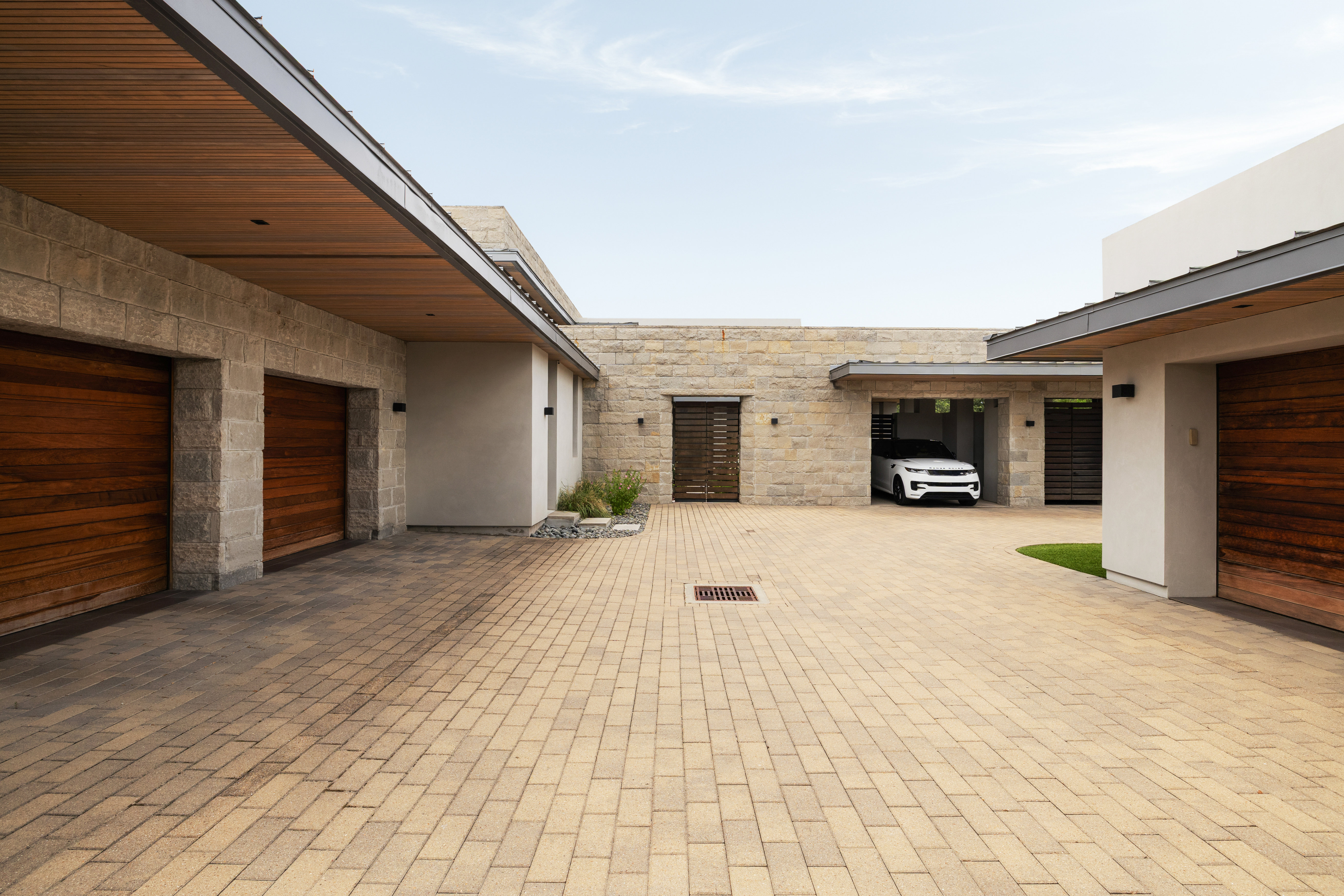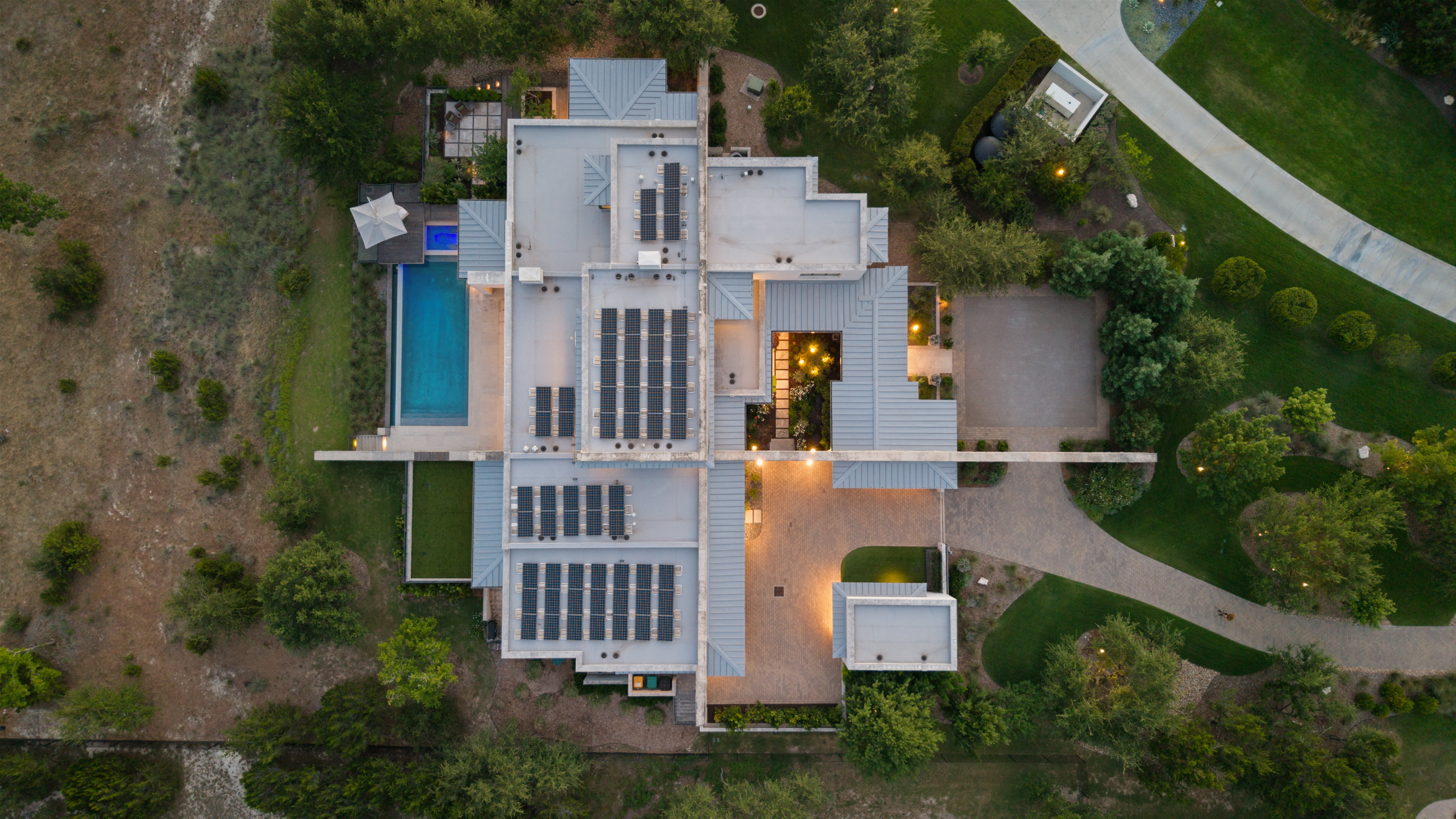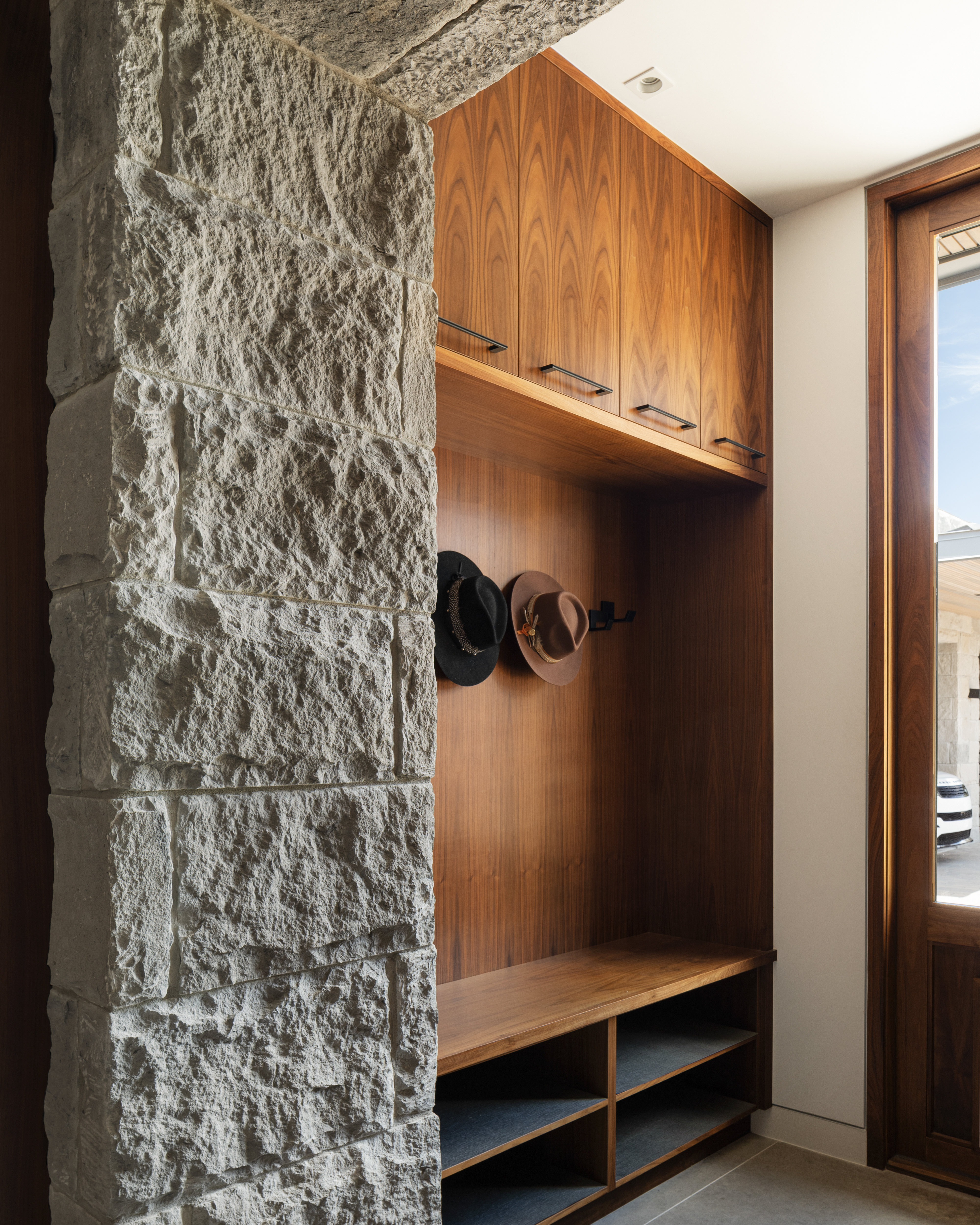 Floors and walls are wrapped in gray Leuders limestone, locally sourced from Leuders, TX, and paired with quartz countertops, custom lacquer cabinetry, and warm walnut millwork throughout. The entire home is equipped with high-efficiency LED lighting (all lights are 95+ CRI, 3000K color temperature) for consistent ambiance and visual comfort.