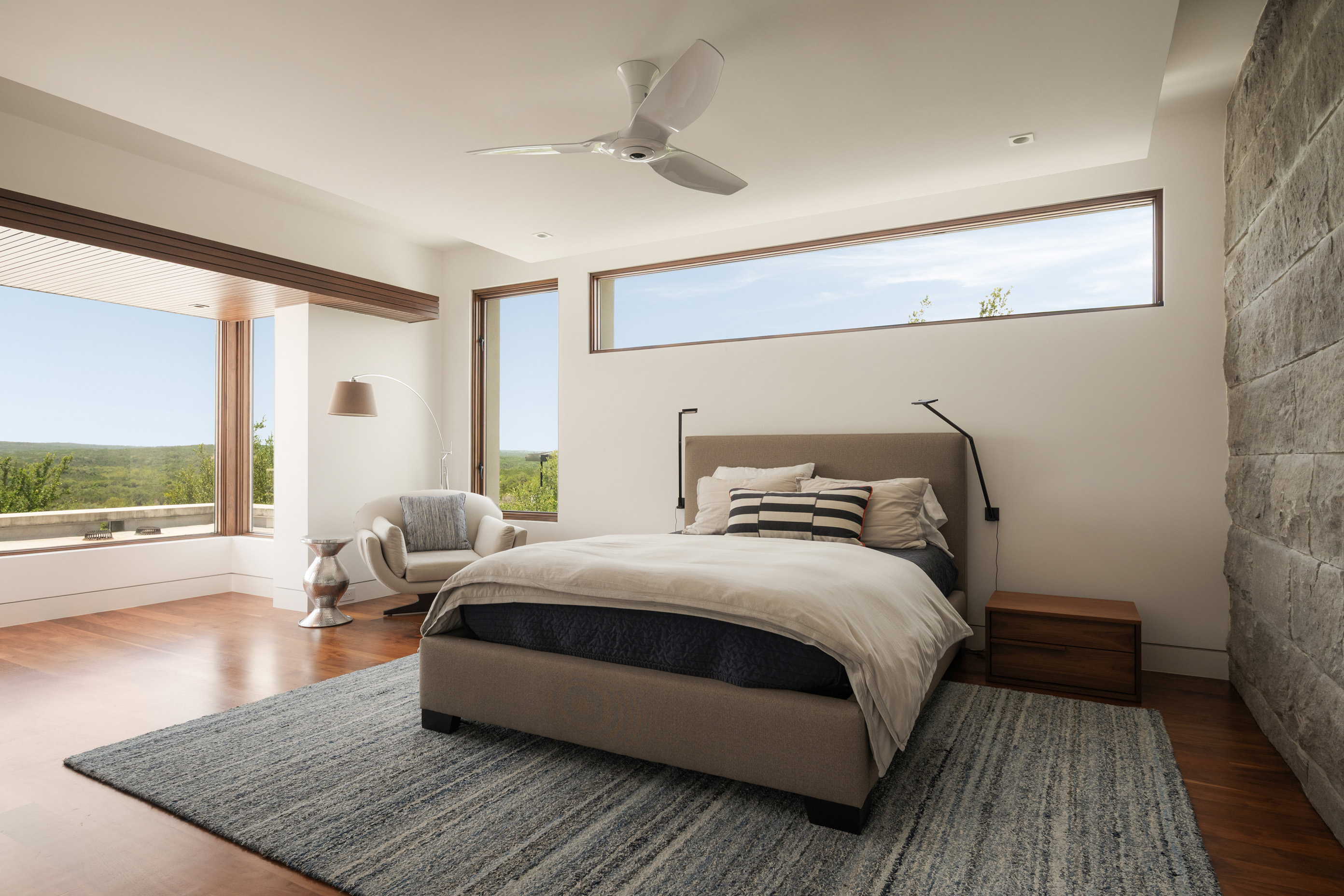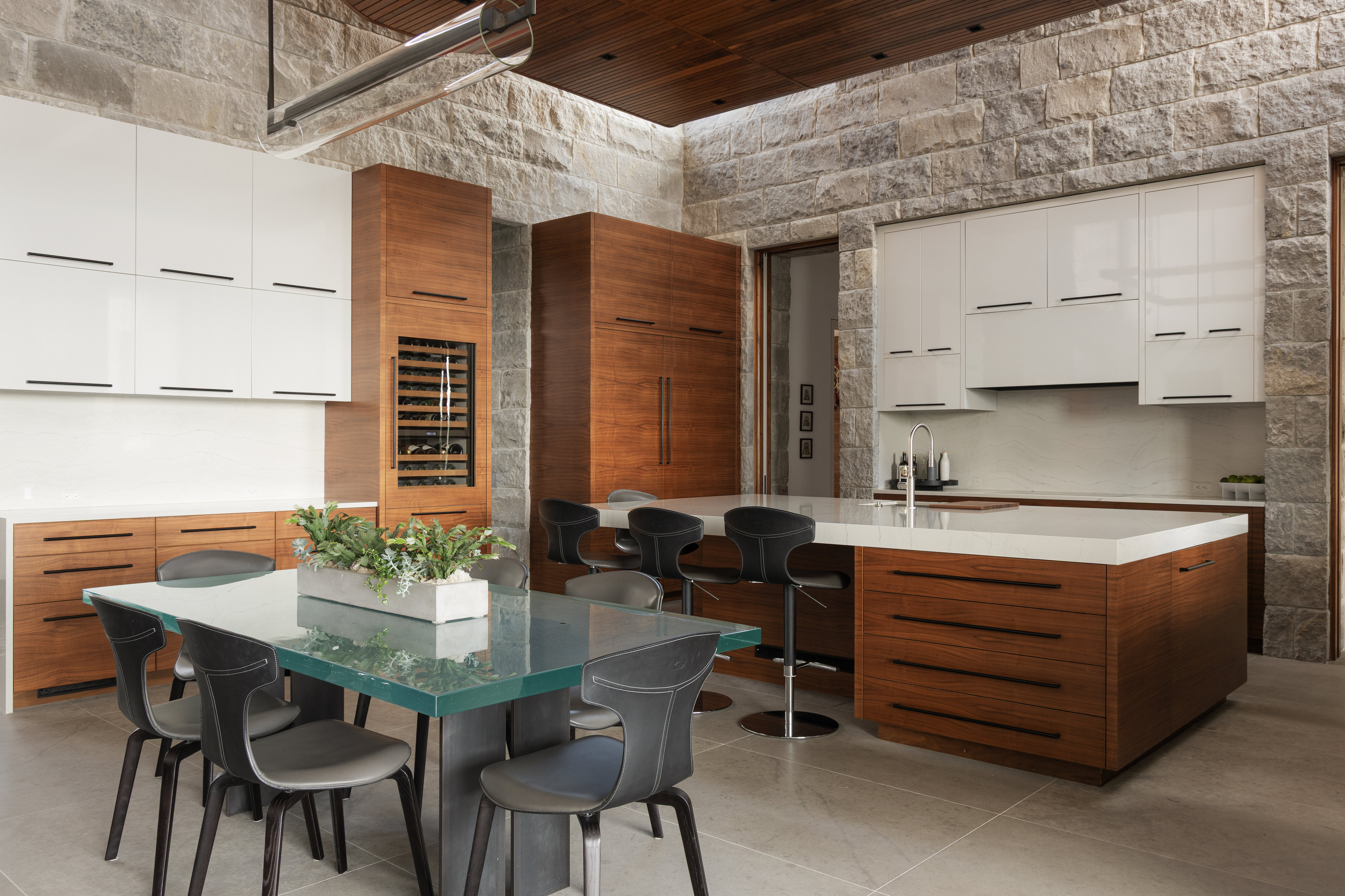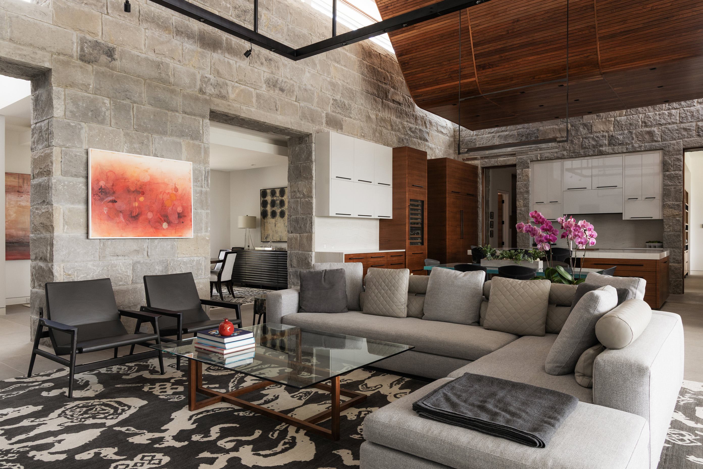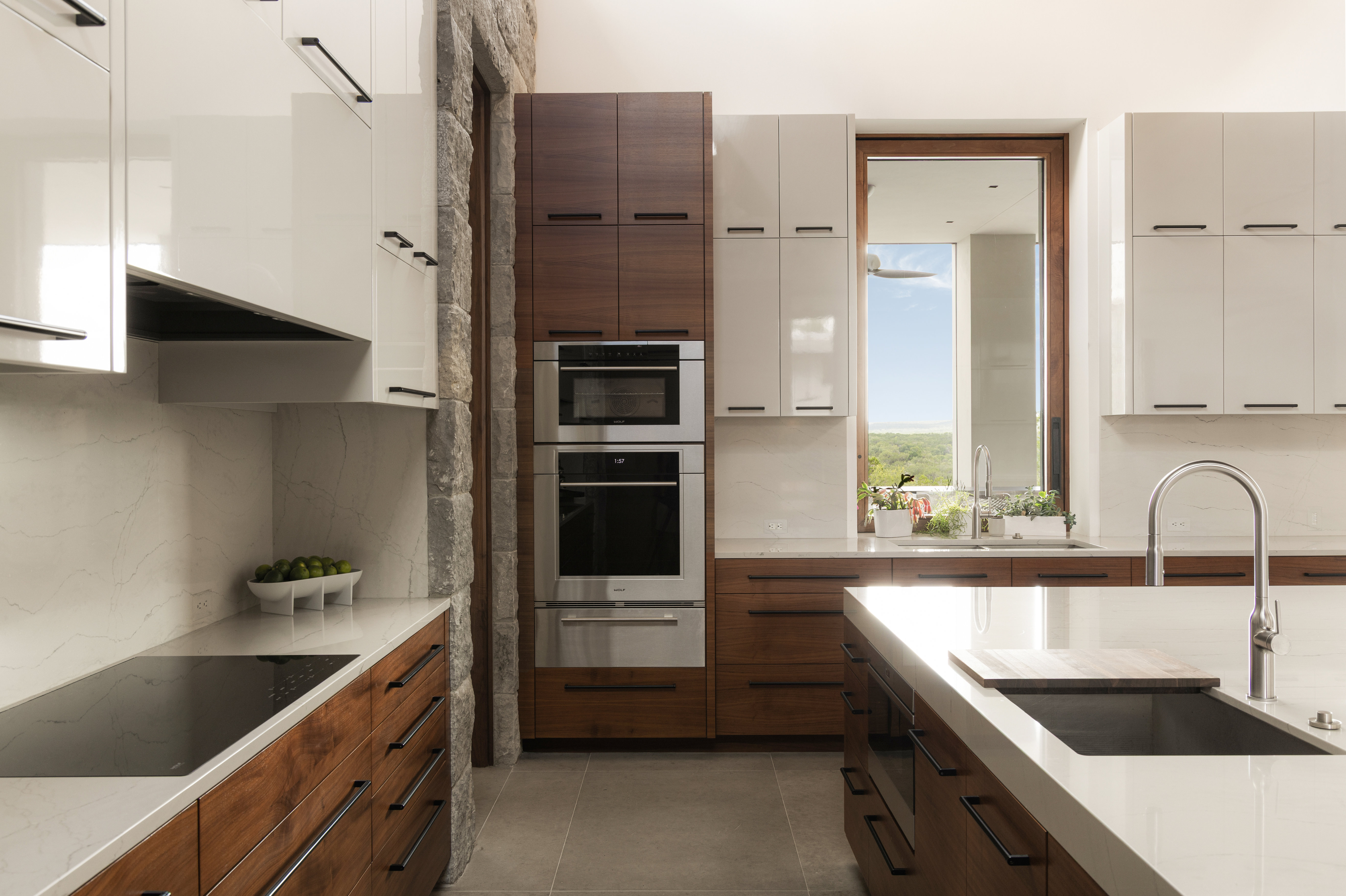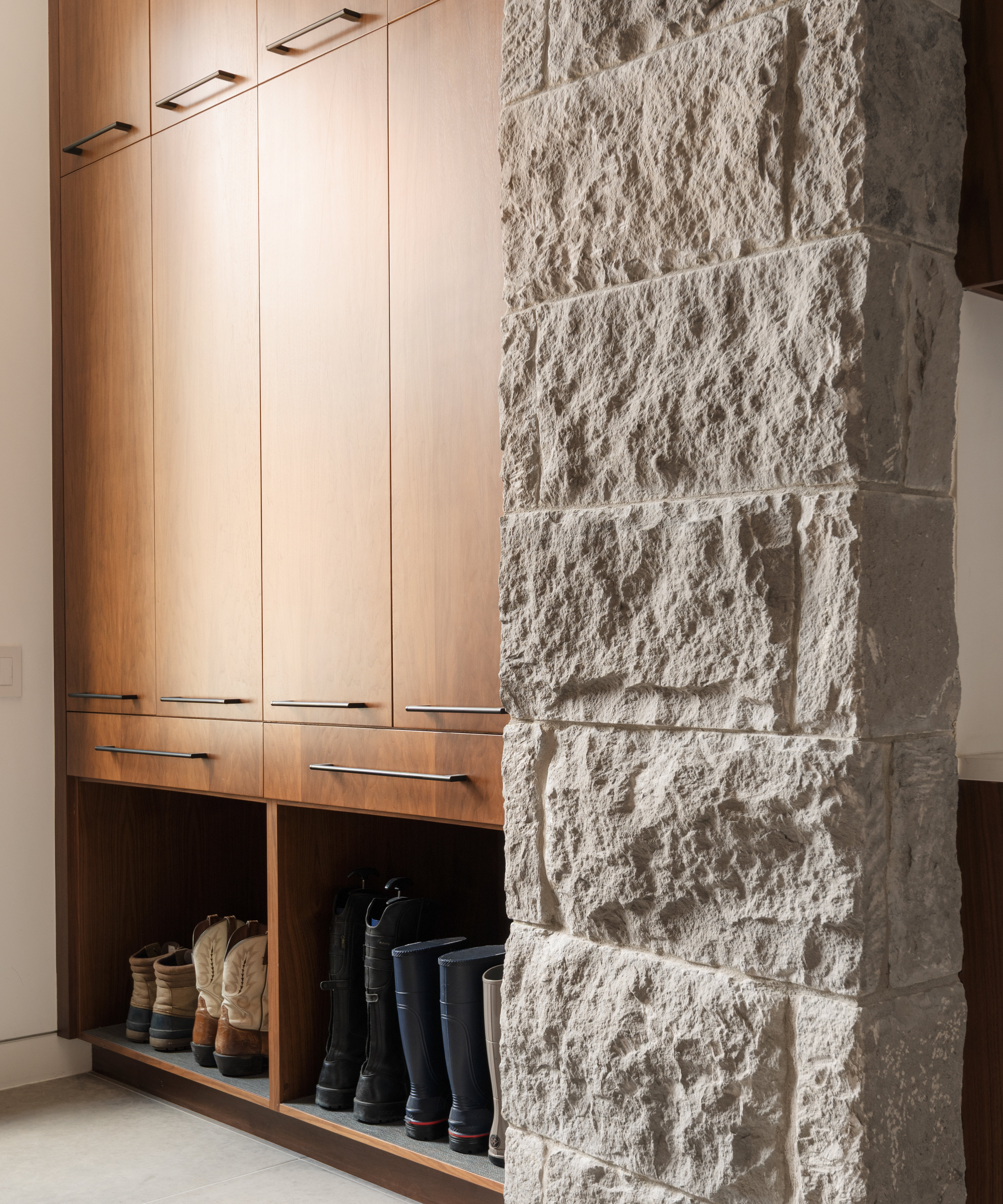 Floors and walls are wrapped in gray Leuders limestone, locally sourced from Leuders, TX, and paired with quartz countertops, custom lacquer cabinetry, and warm walnut millwork throughout. The entire home is equipped with high-efficiency LED lighting (all lights are 95+ CRI, 3000K color temperature) for consistent ambiance and visual comfort.
