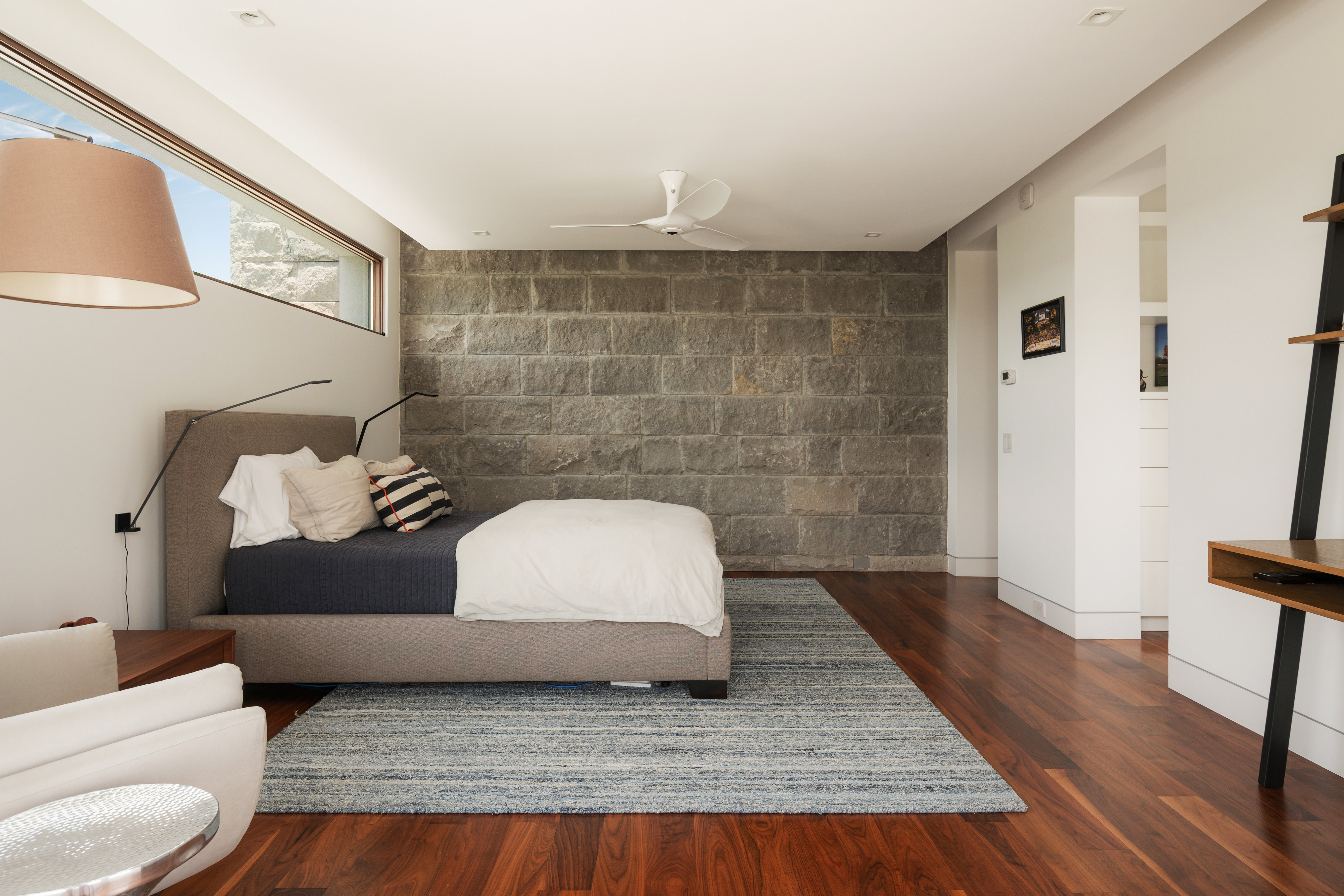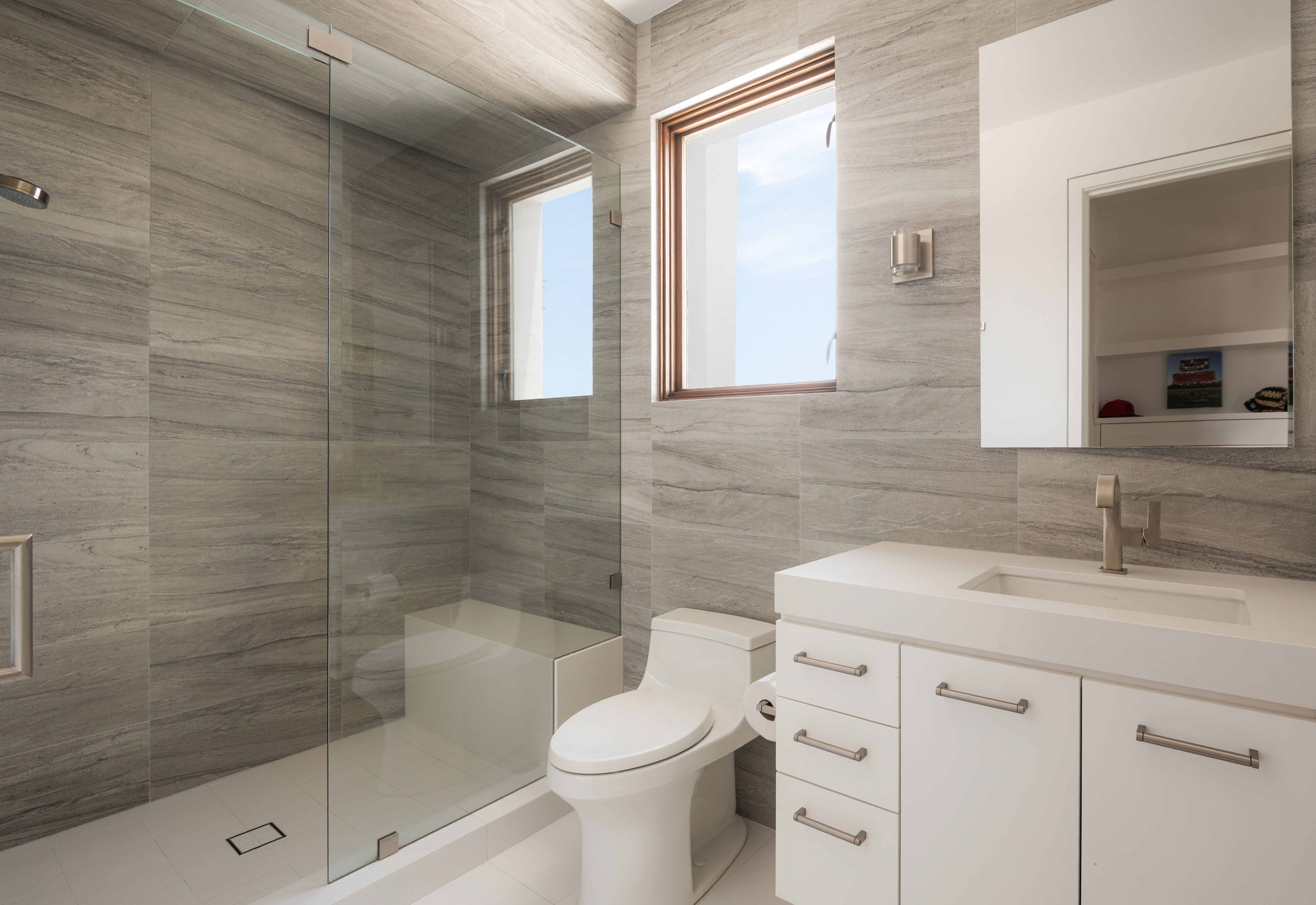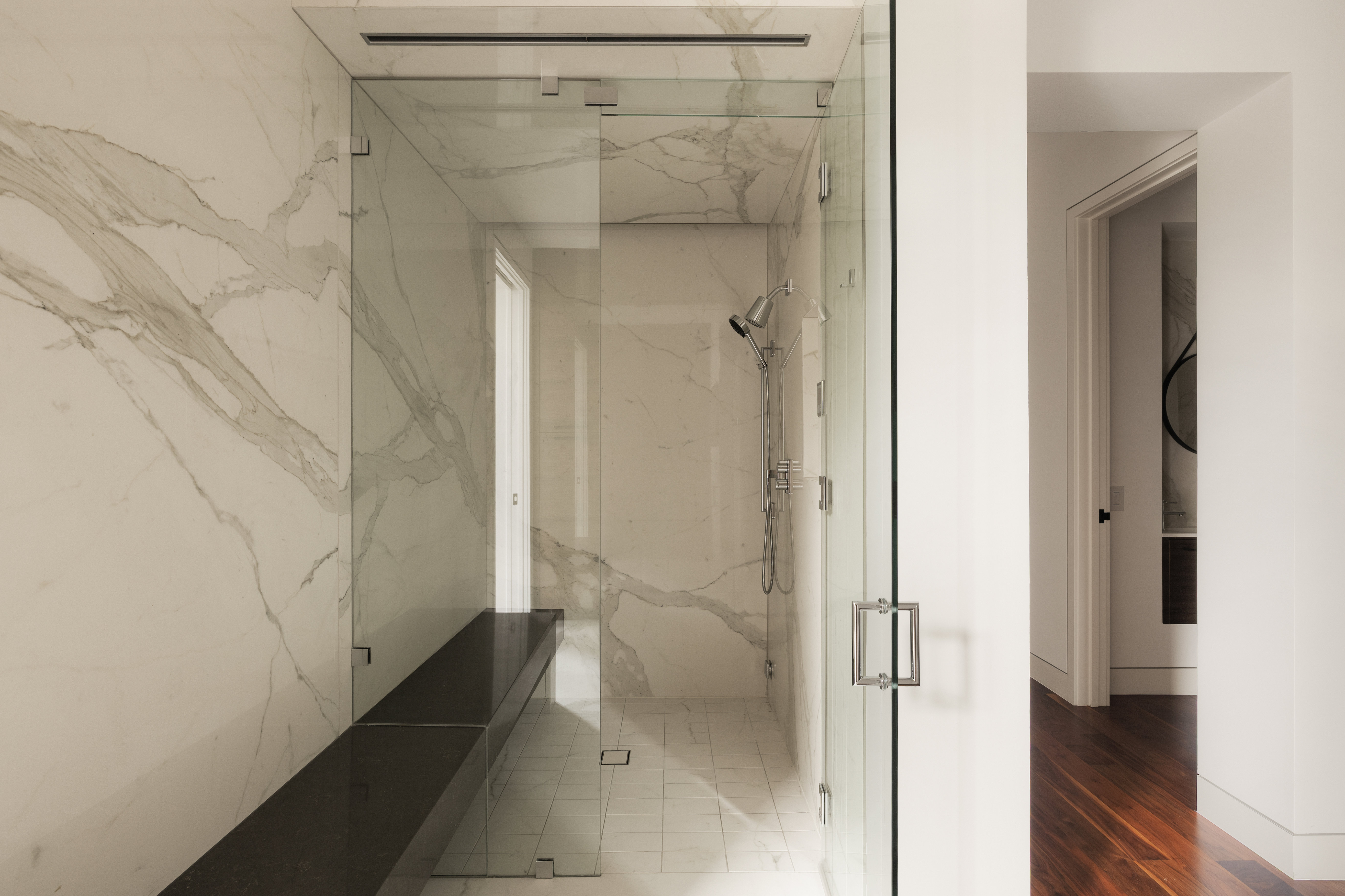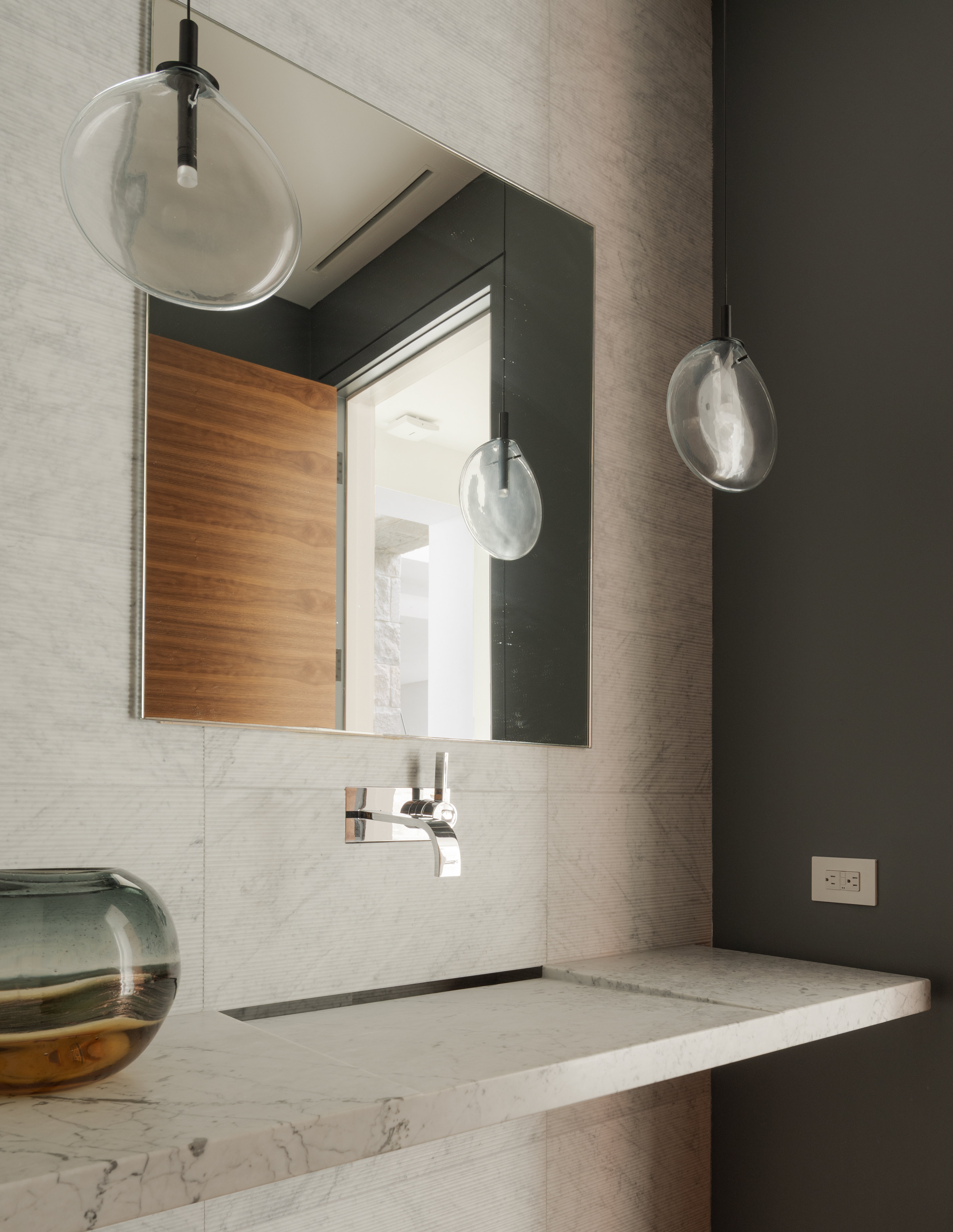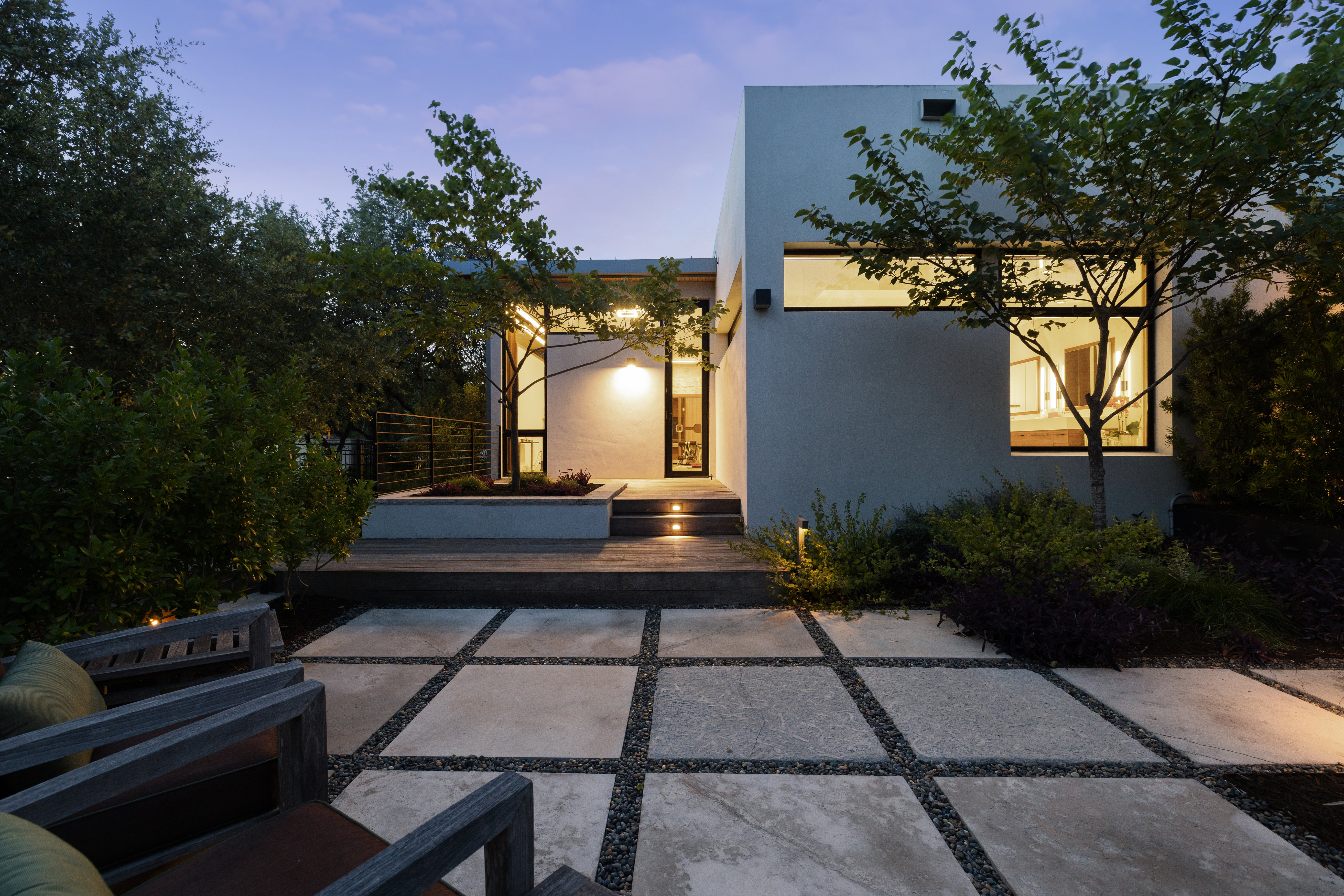 Floors and walls are wrapped in gray Leuders limestone, locally sourced from Leuders, TX, and paired with quartz countertops, custom lacquer cabinetry, and warm walnut millwork throughout. The entire home is equipped with high-efficiency LED lighting (all lights are 95+ CRI, 3000K color temperature) for consistent ambiance and visual comfort.