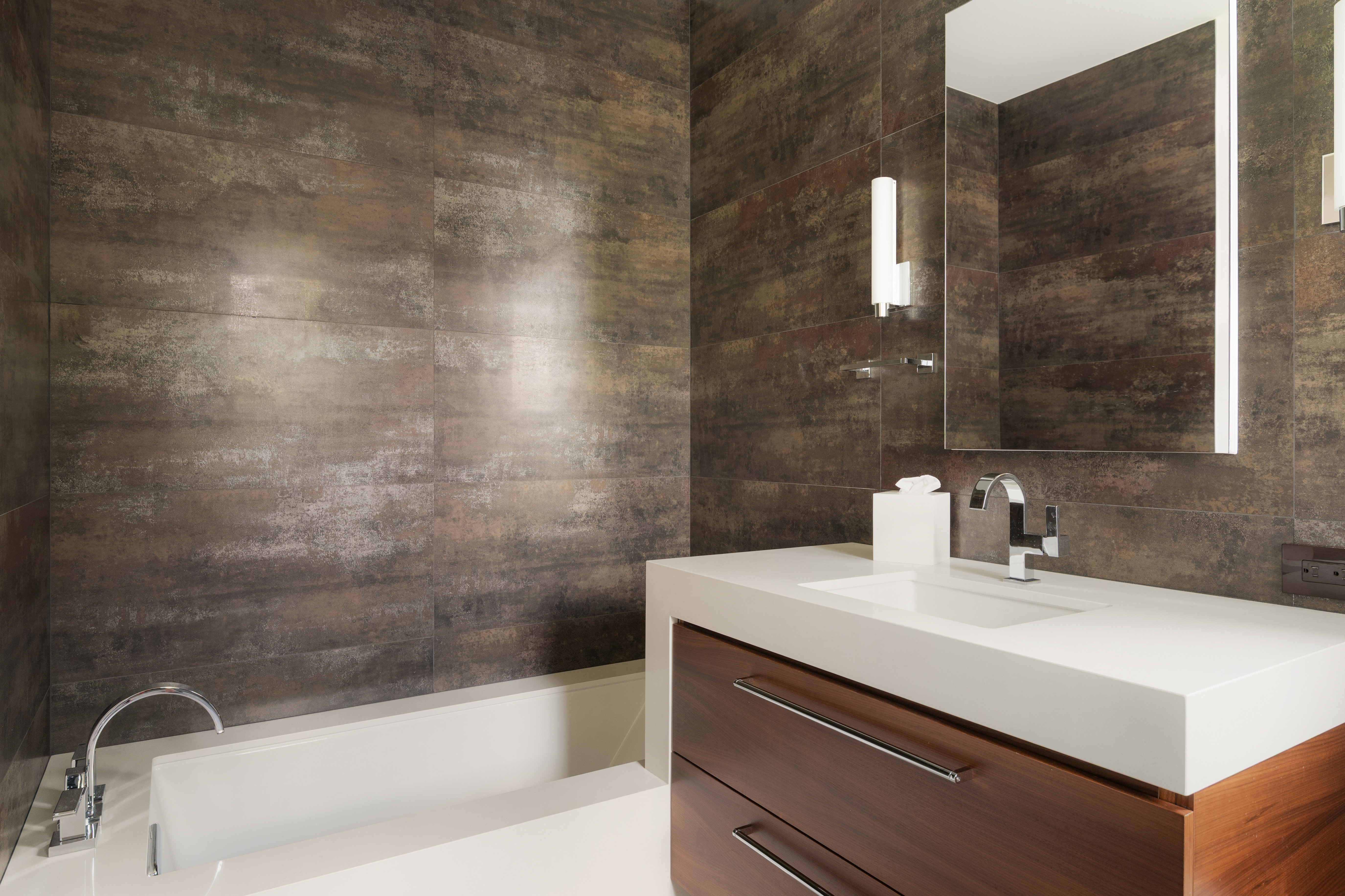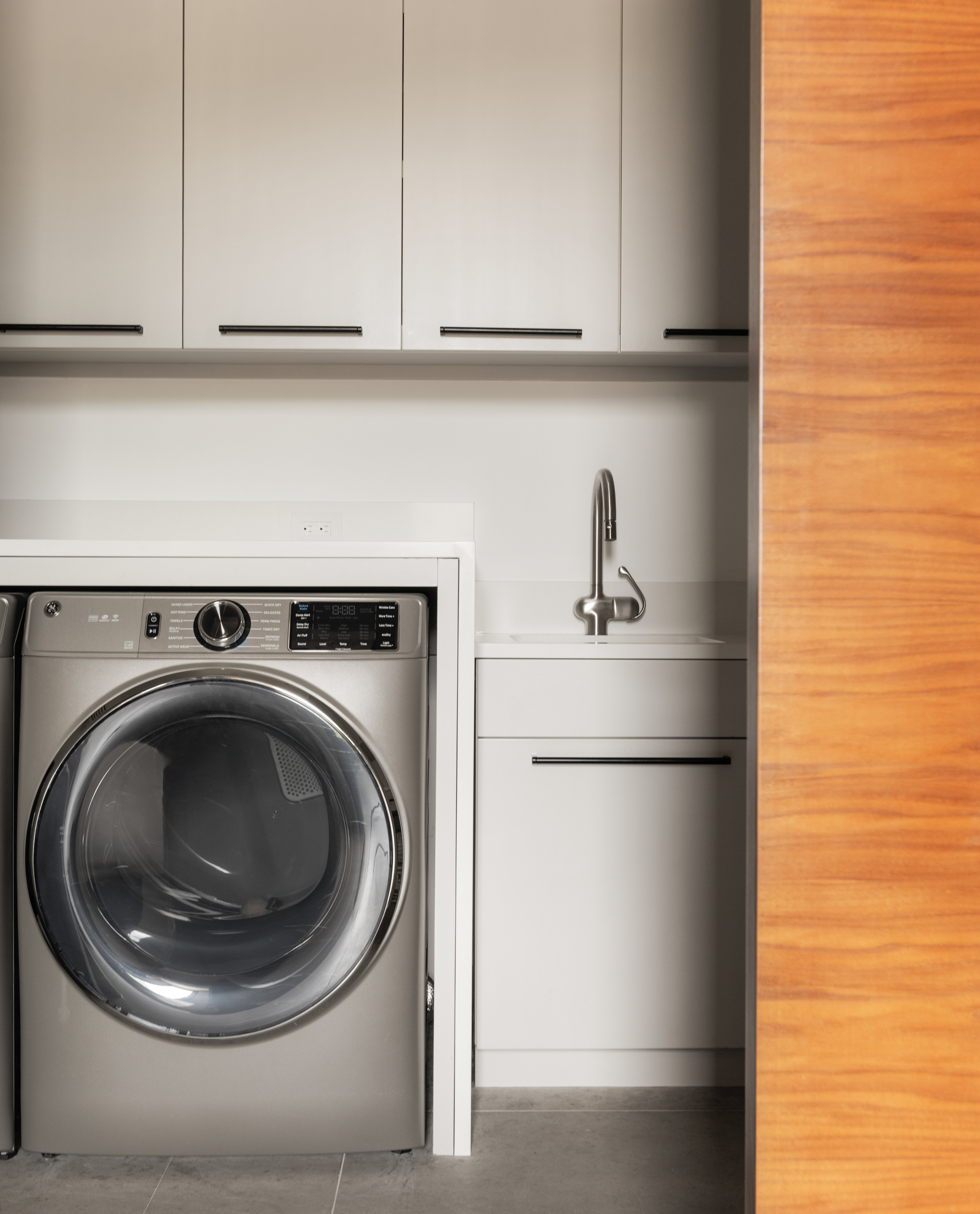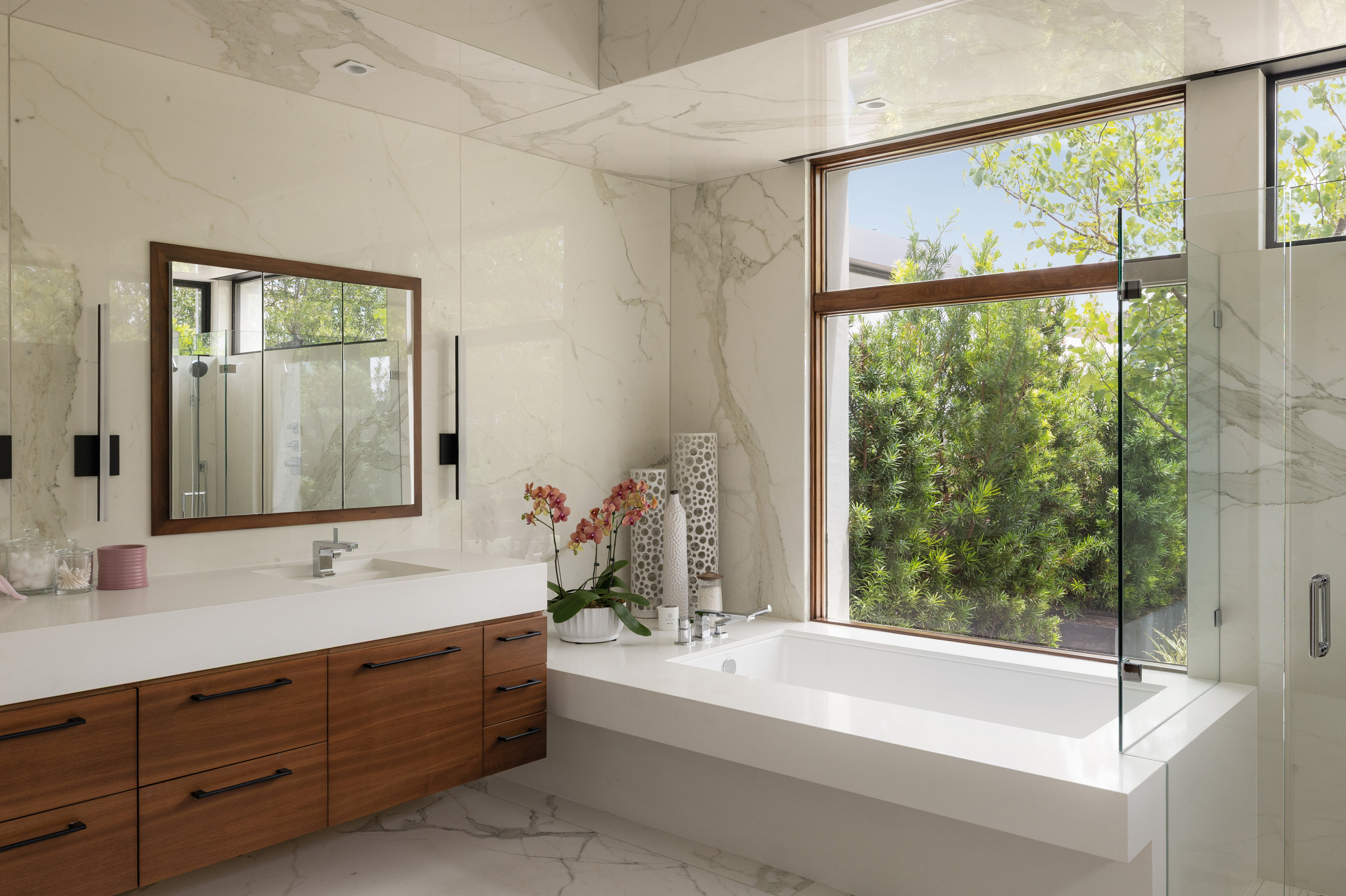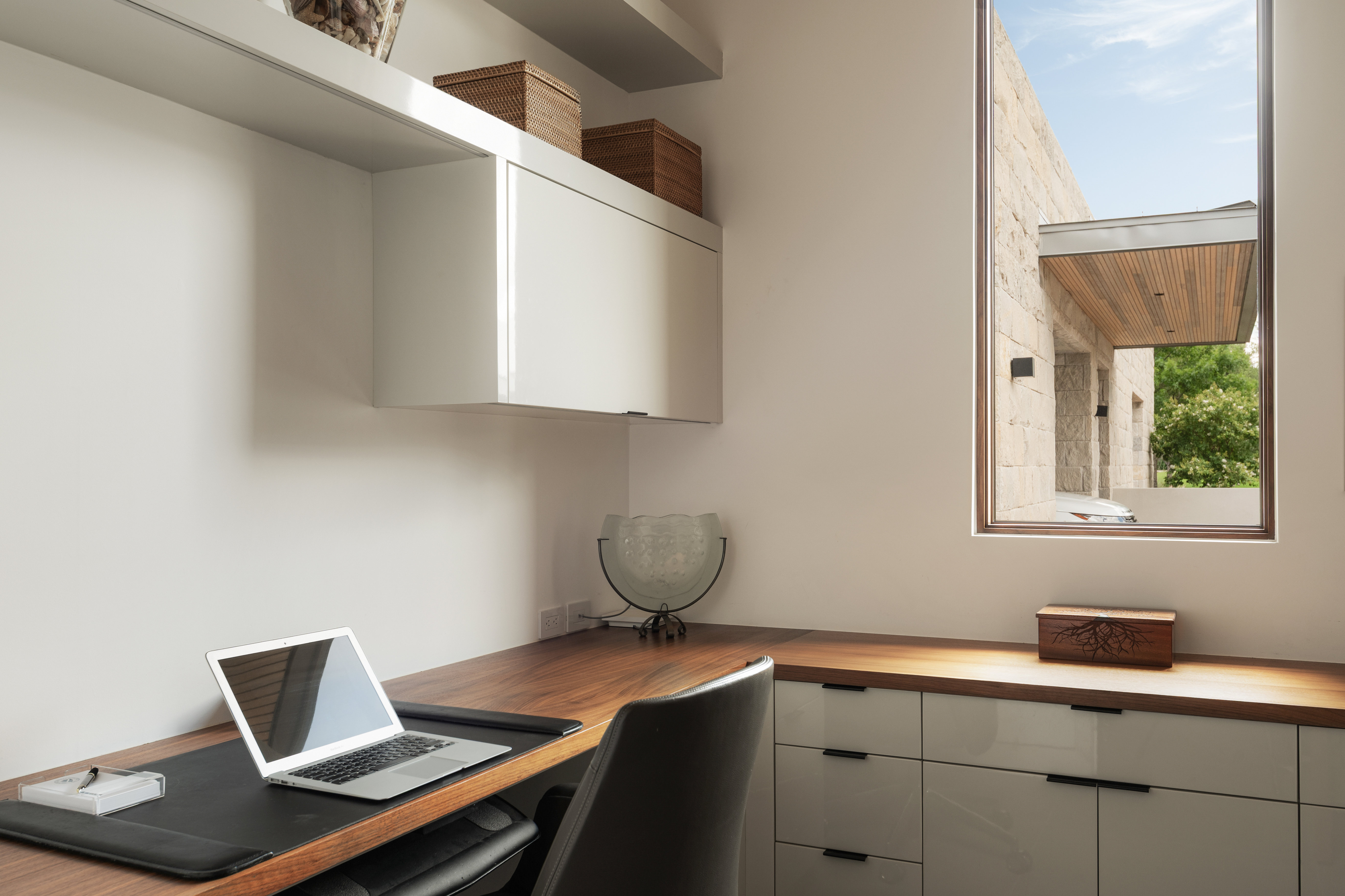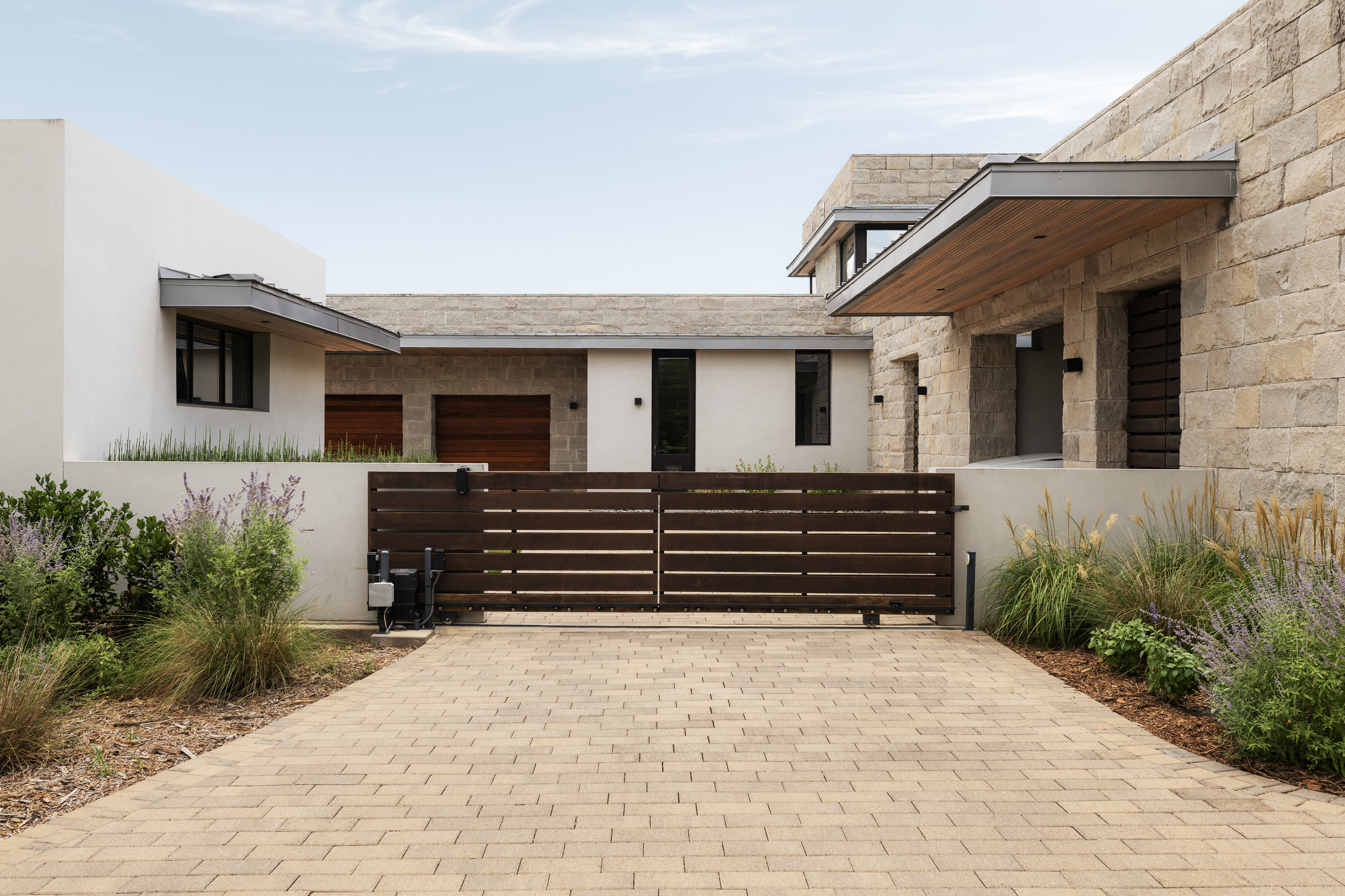 Floors and walls are wrapped in gray Leuders limestone, locally sourced from Leuders, TX, and paired with quartz countertops, custom lacquer cabinetry, and warm walnut millwork throughout. The entire home is equipped with high-efficiency LED lighting (all lights are 95+ CRI, 3000K color temperature) for consistent ambiance and visual comfort.