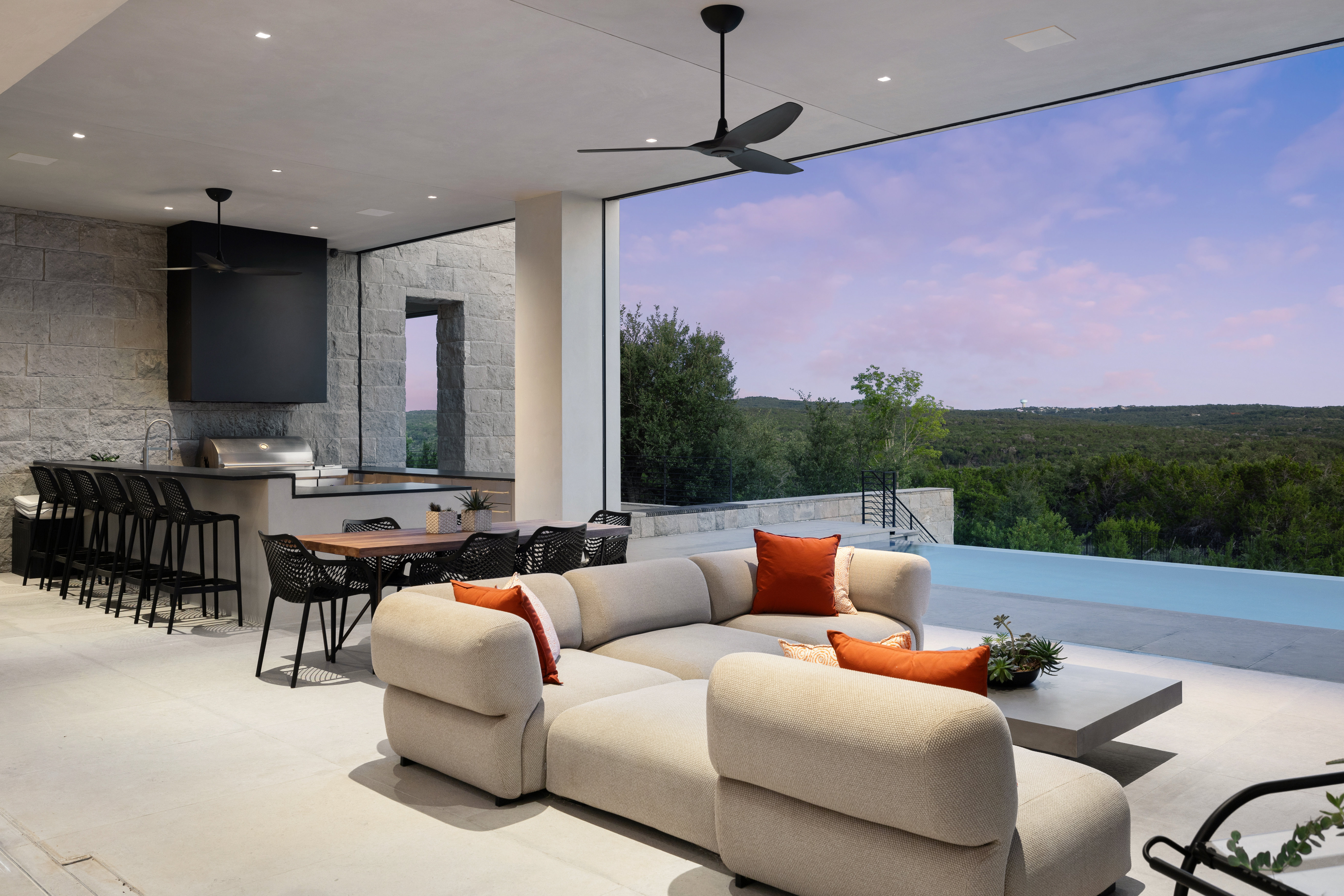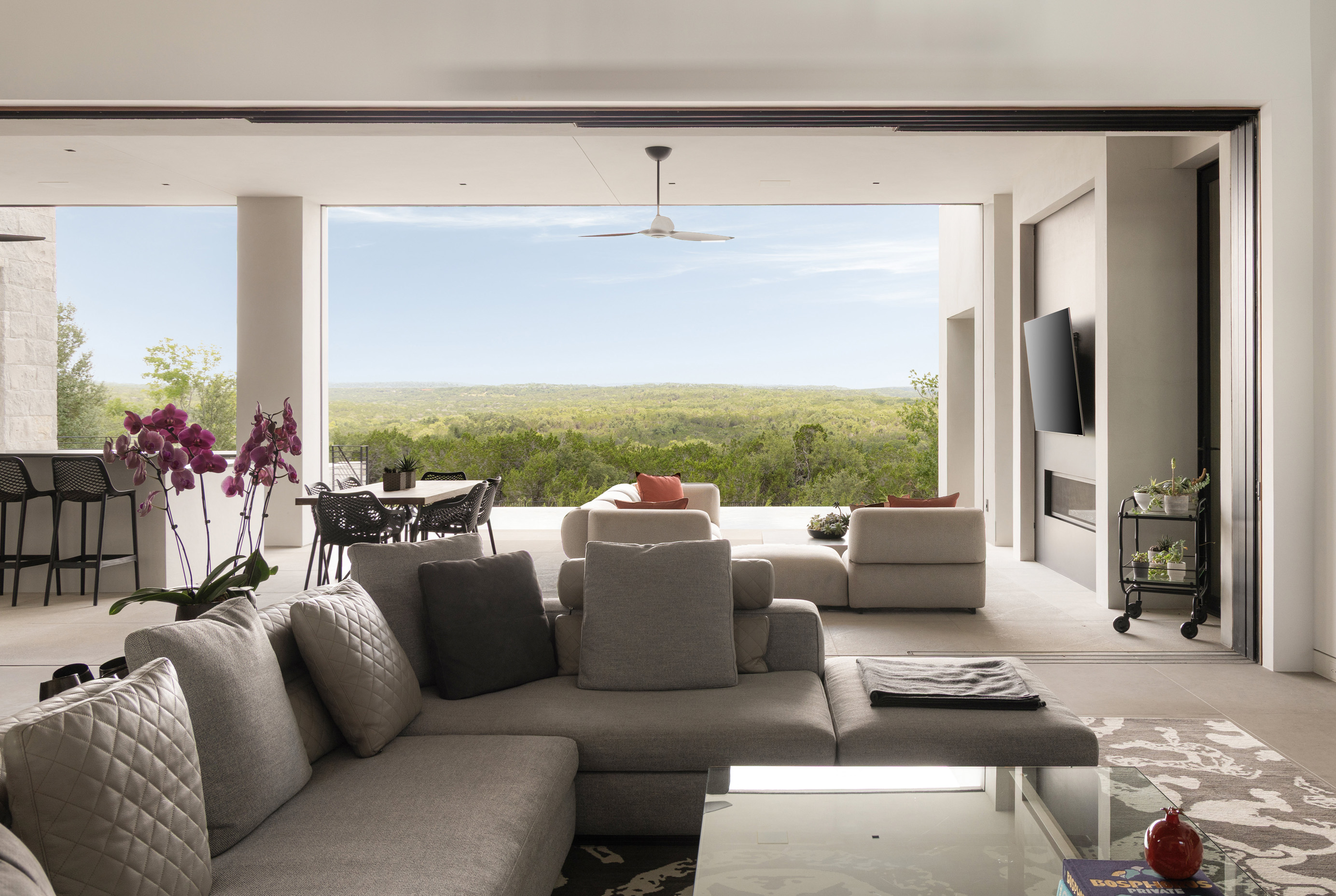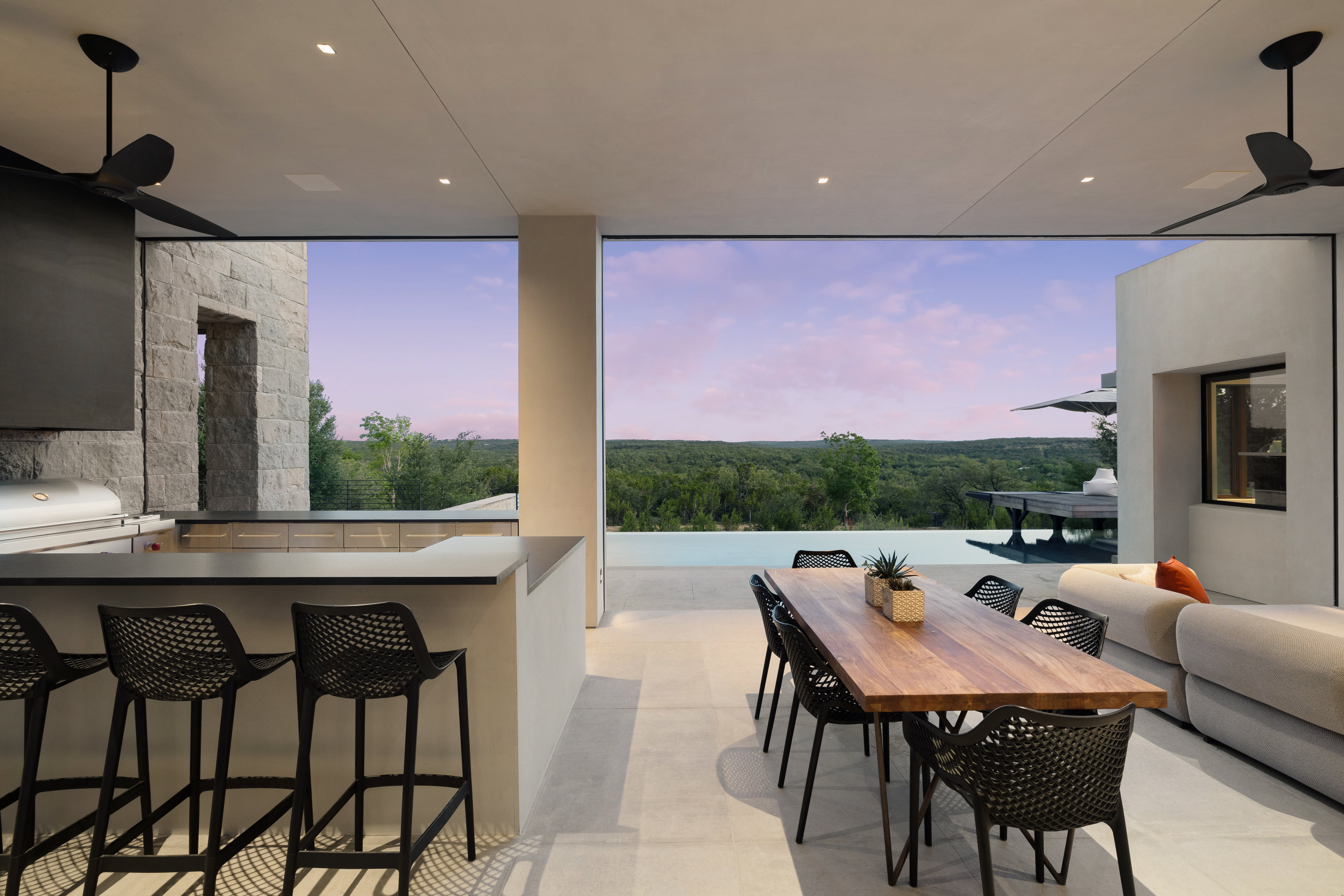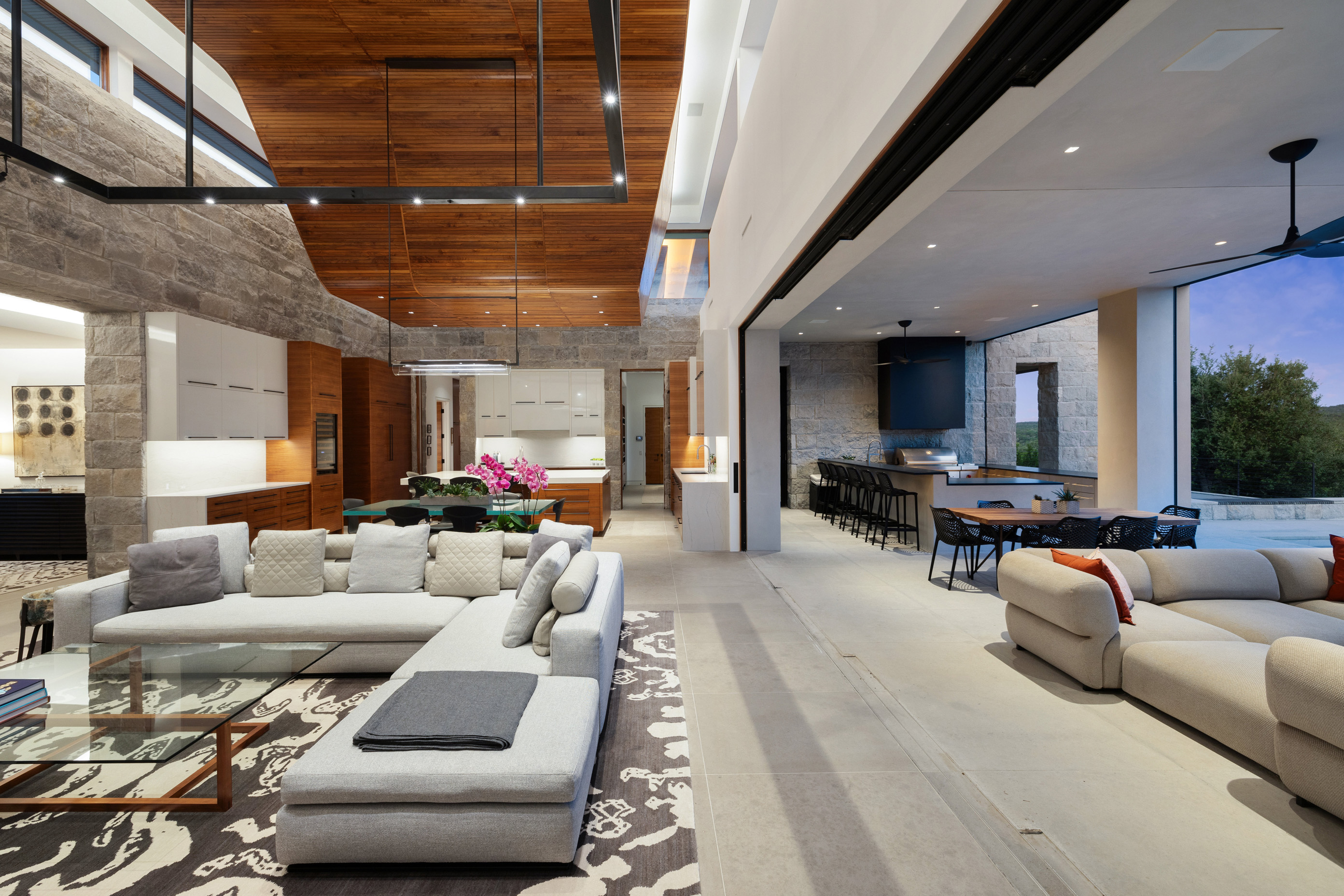 Four massive Weiland sliding glass doors (5.5’ x 9’ each) fully disappear into the walls, creating a seamless indoor-outdoor living experience.