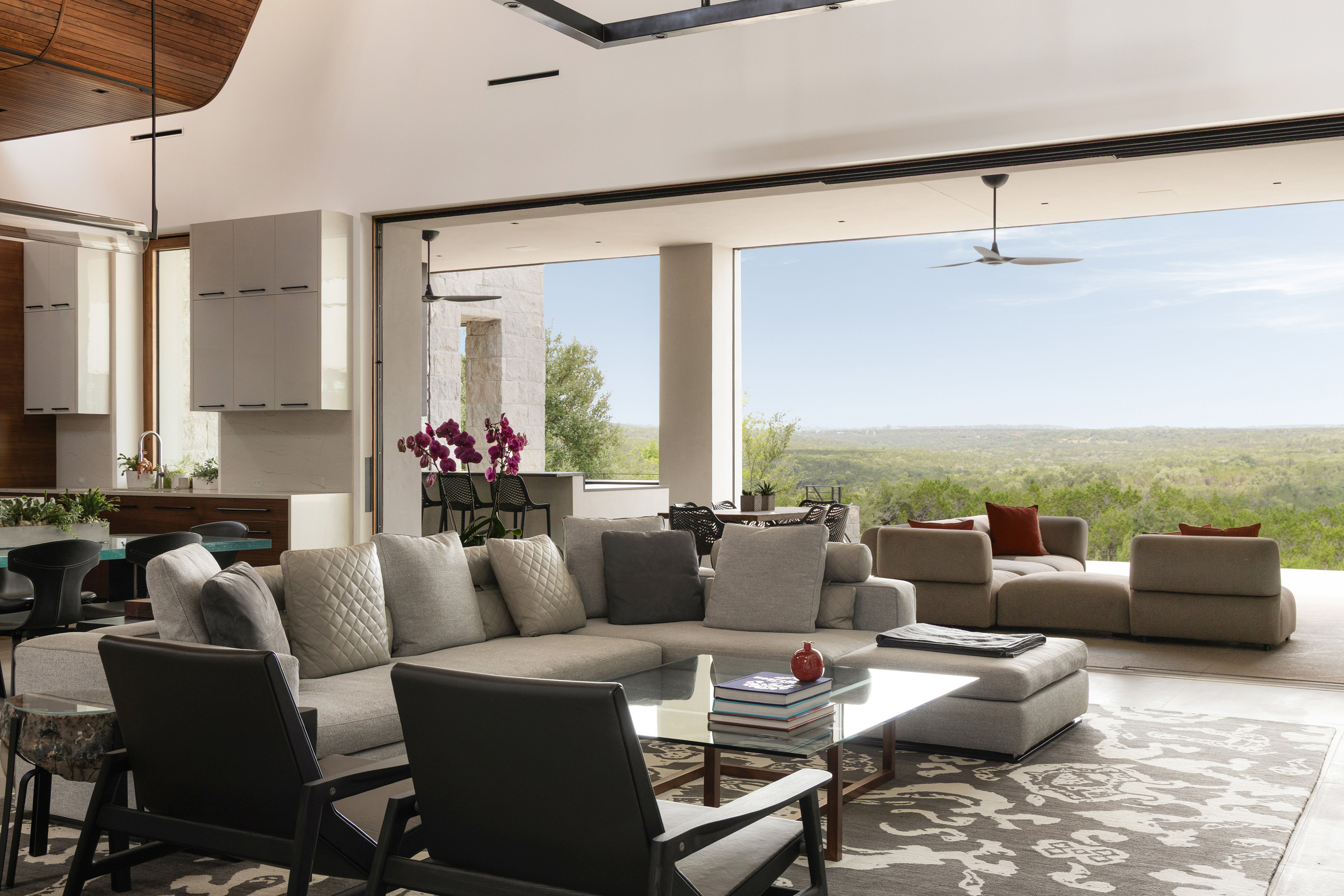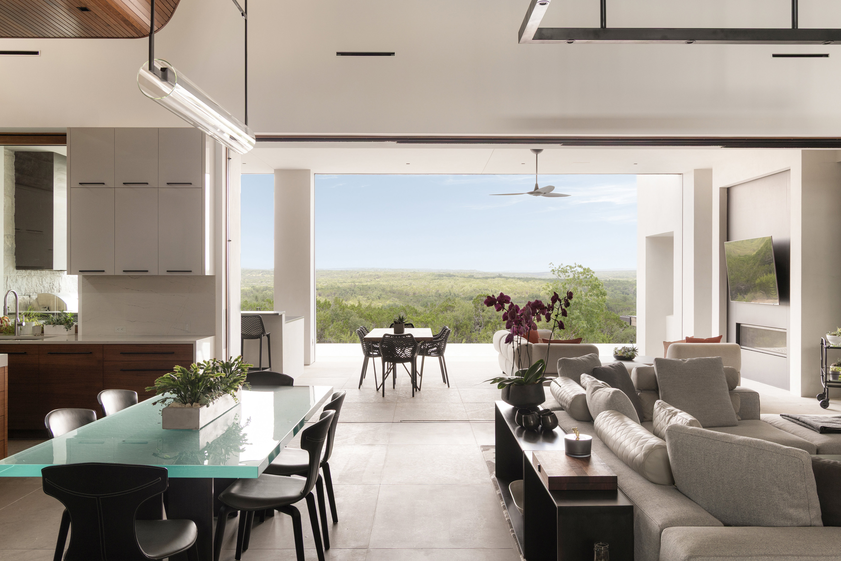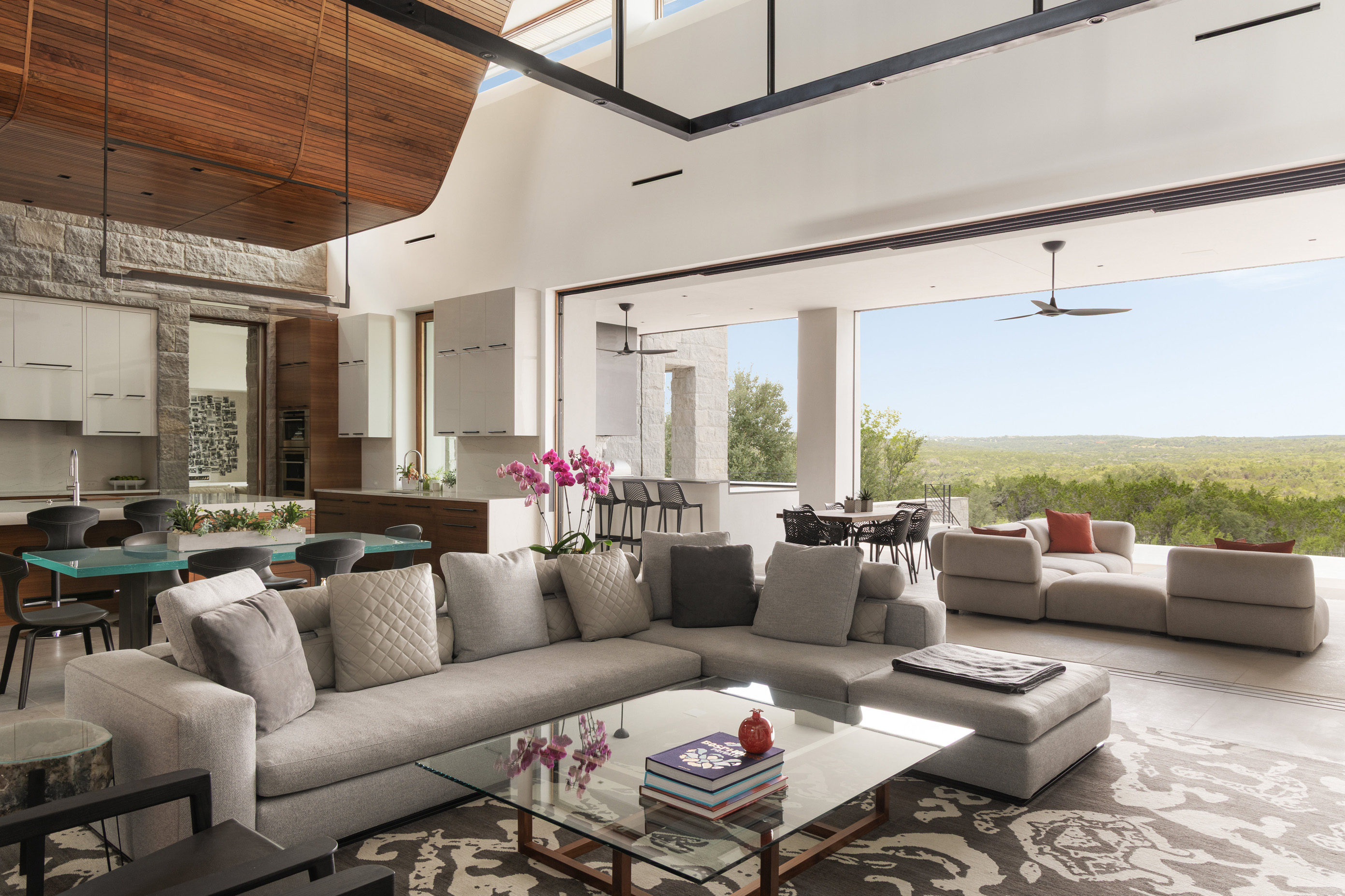Four massive Weiland sliding glass doors (5.5’ x 9’ each) fully disappear into the walls, creating a seamless indoor-outdoor living experience.