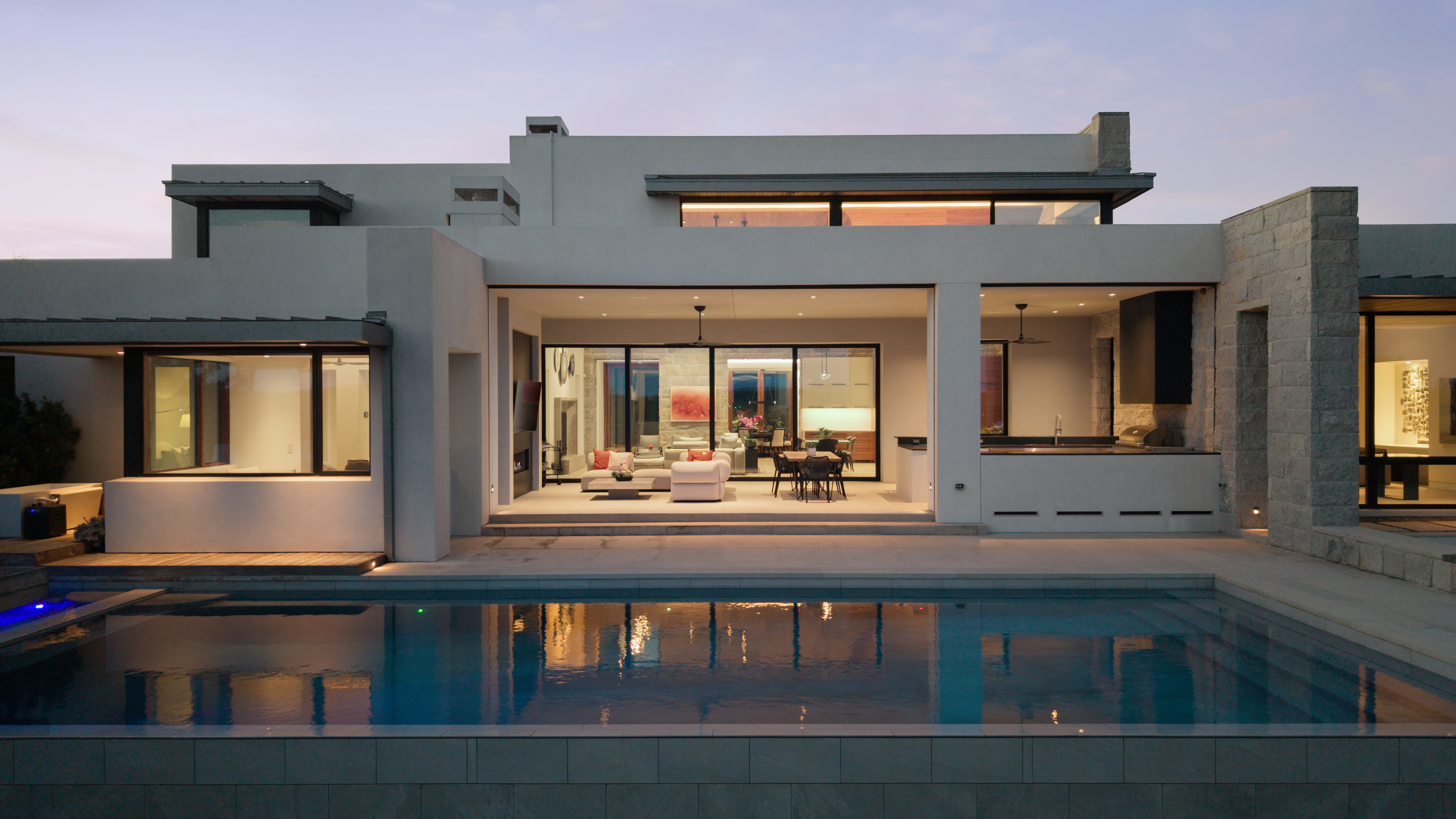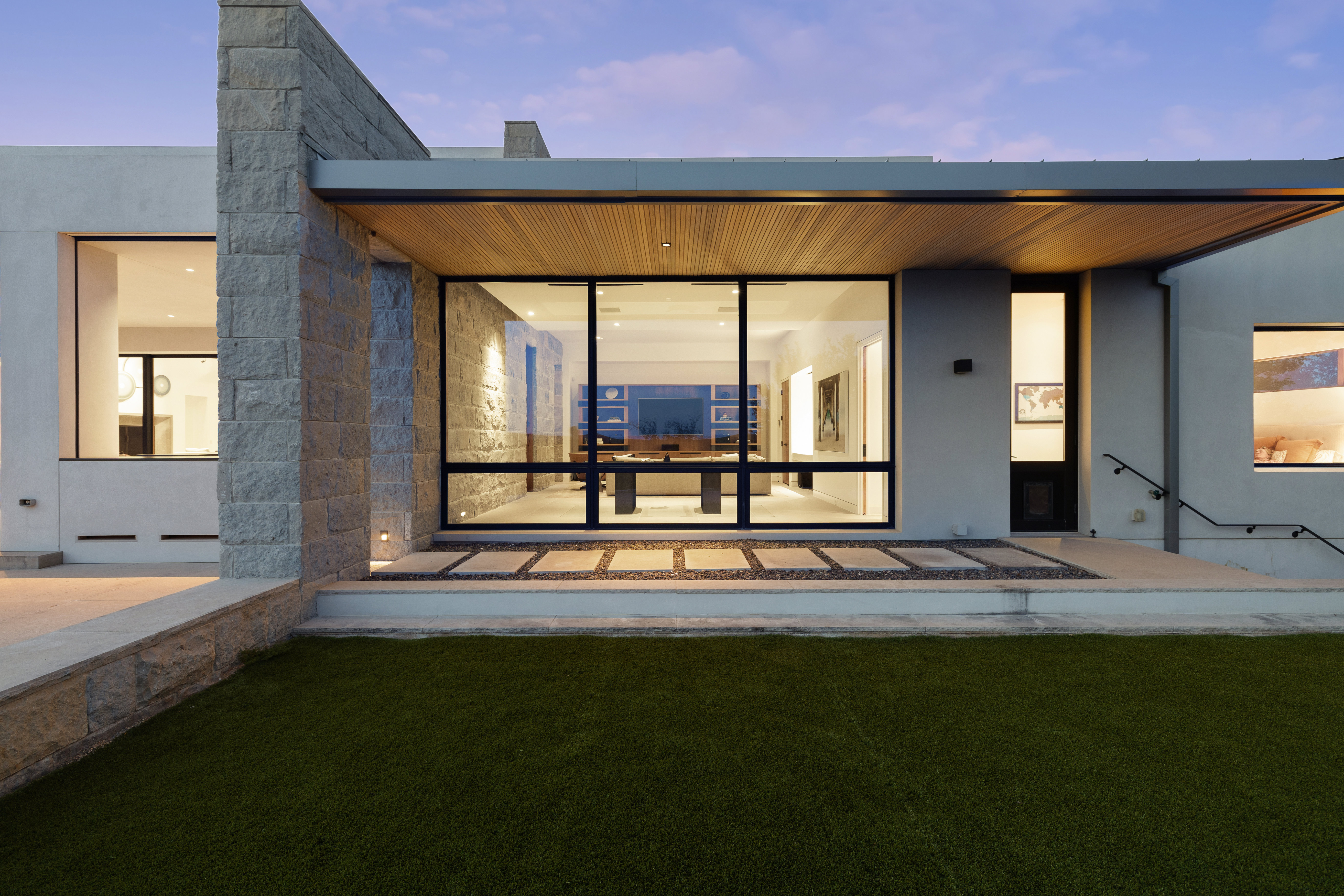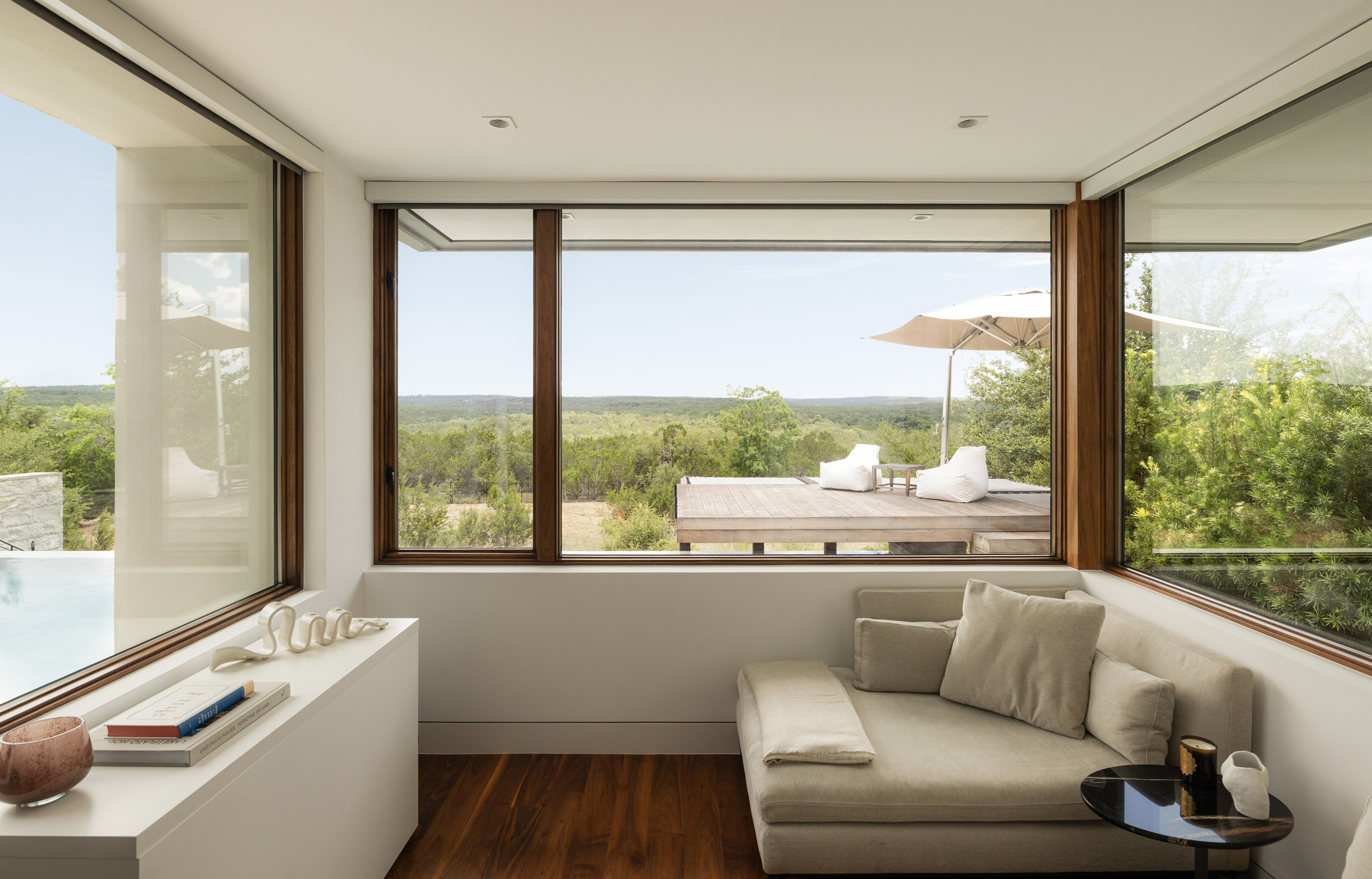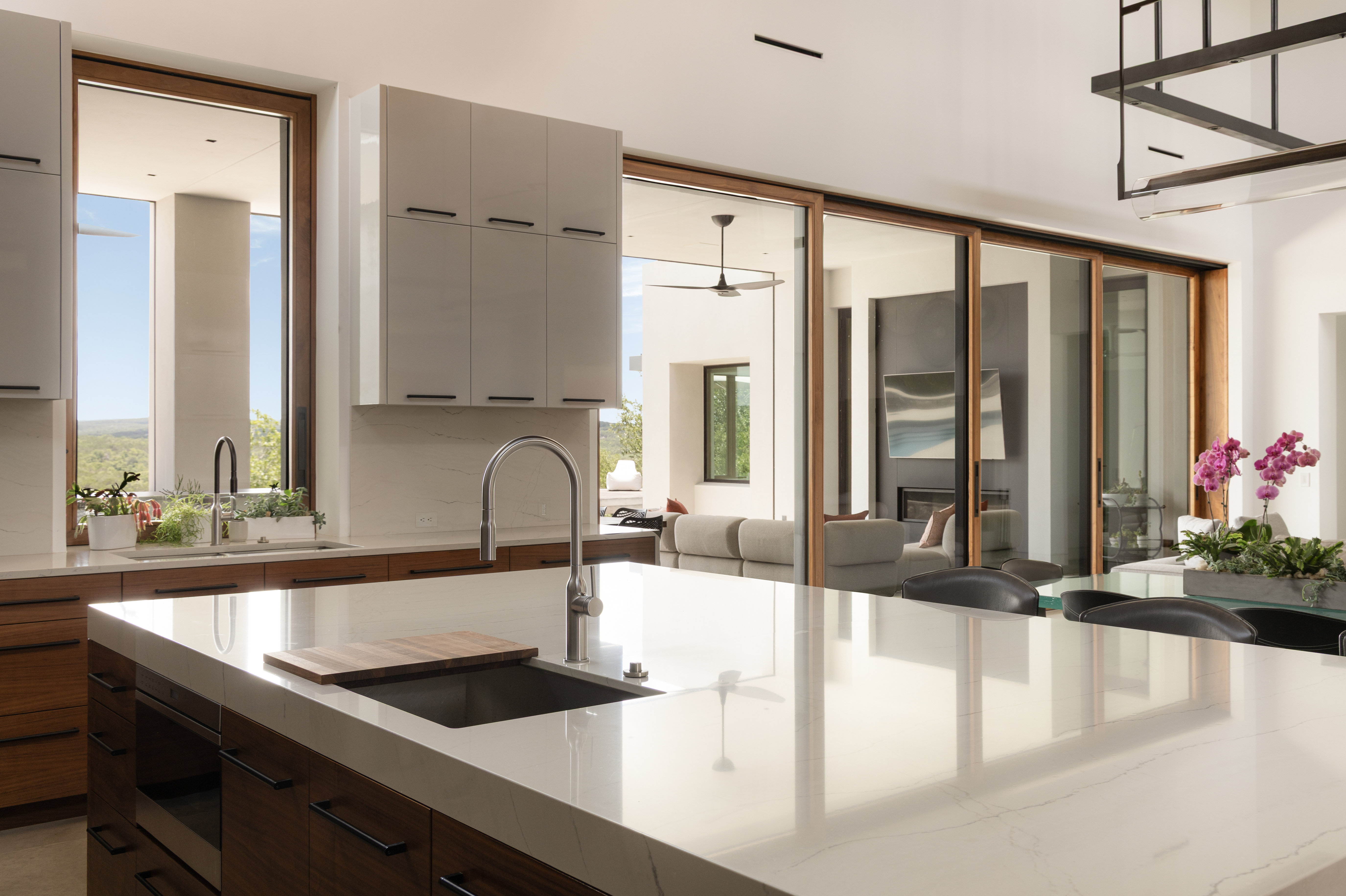 Four massive Weiland sliding glass doors (5.5’ x 9’ each) fully disappear into the walls, creating a seamless indoor-outdoor living experience.