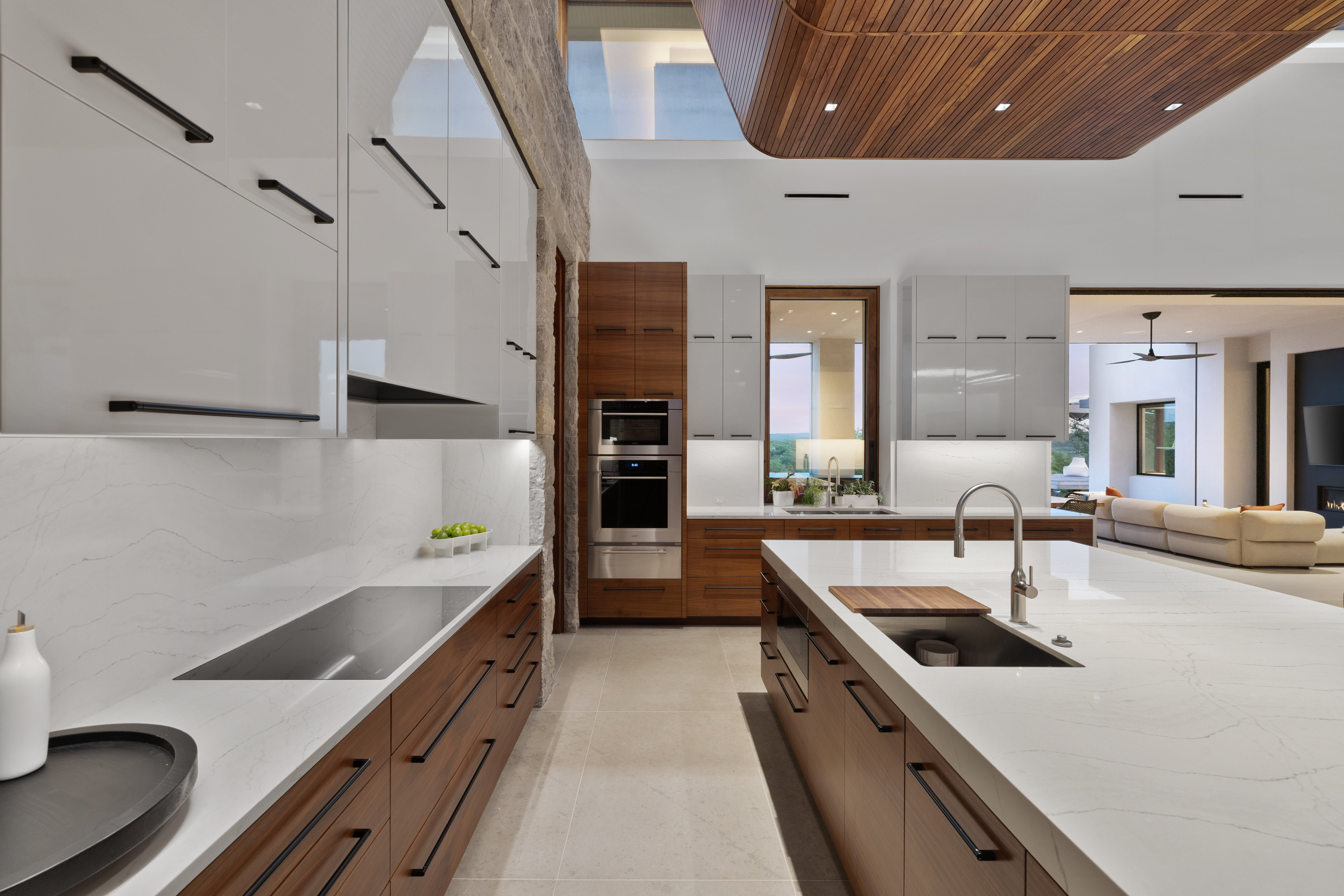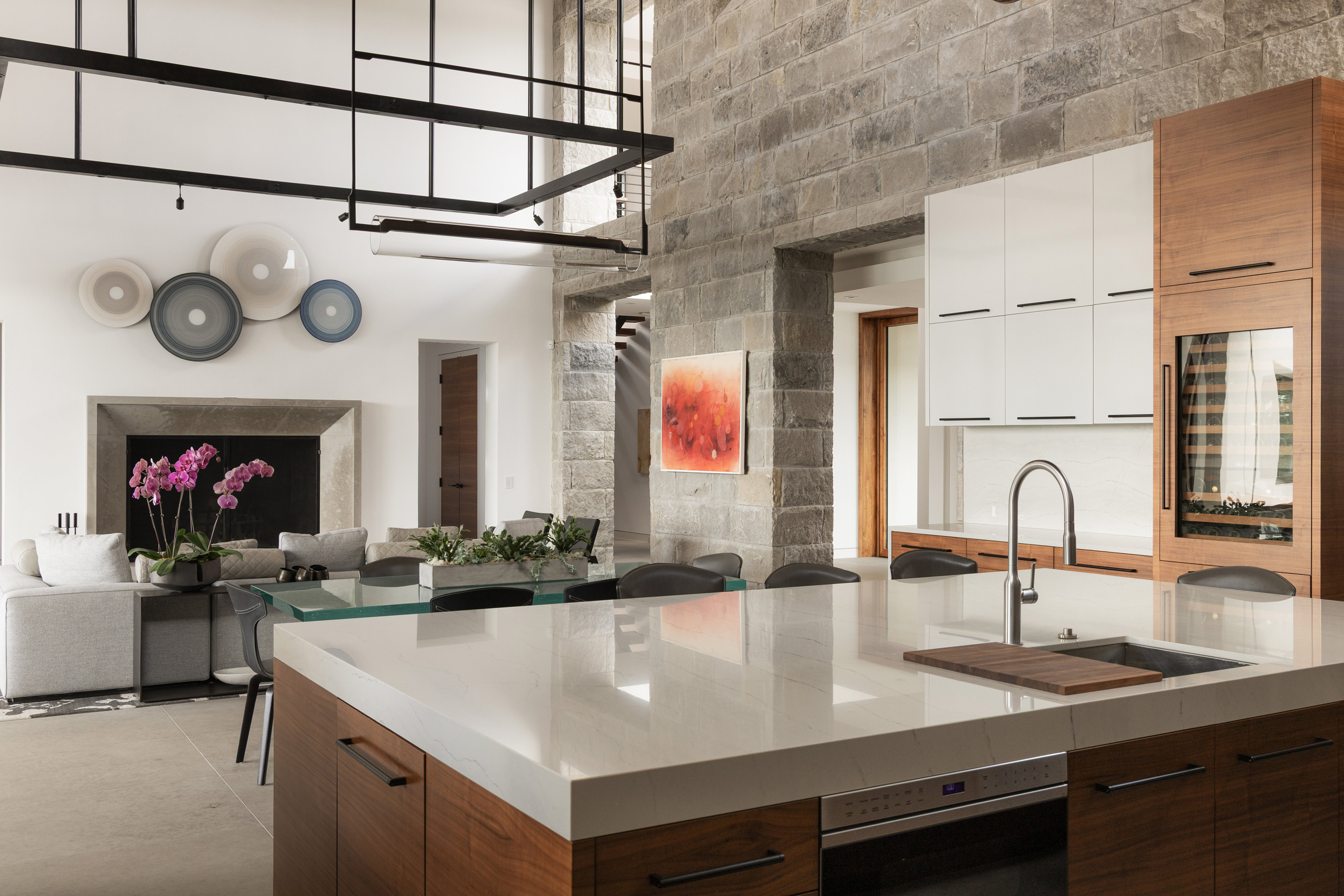 The main kitchen is a statement in both form and function — with 3.5” Cambria Quartz waterfall counters, book-matched walnut cabinetry, and a sleek, fully integrated appliance suite featuring: