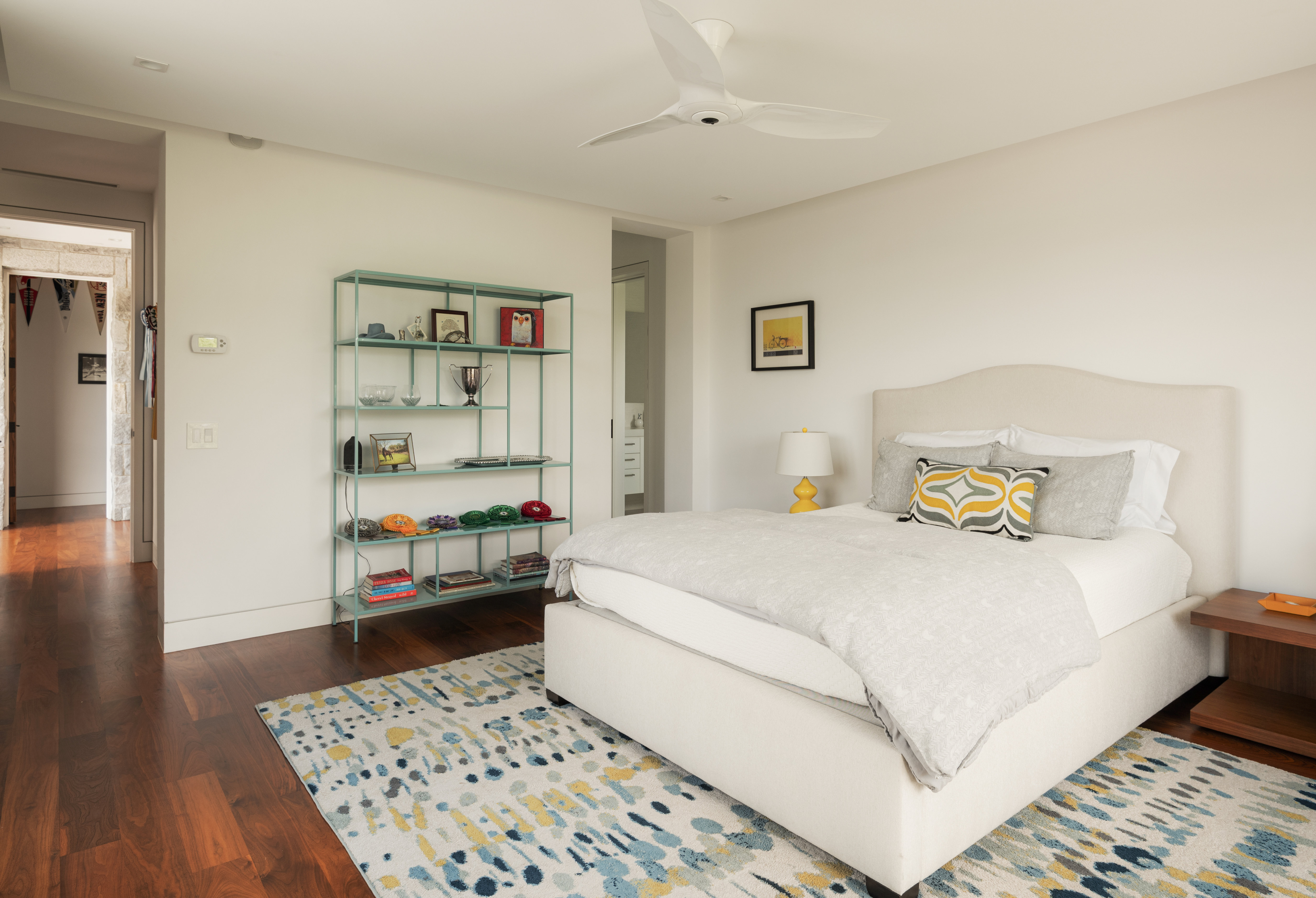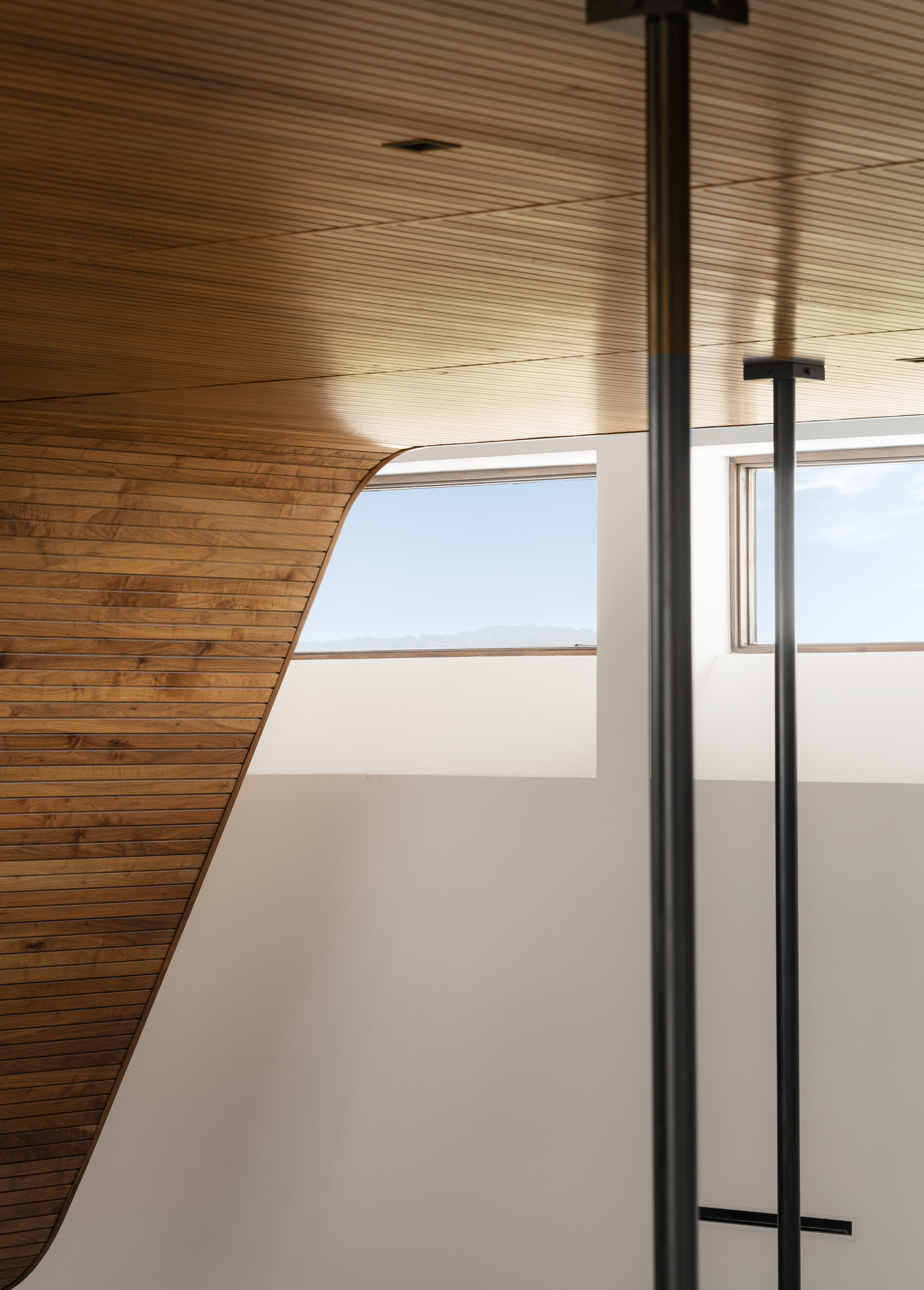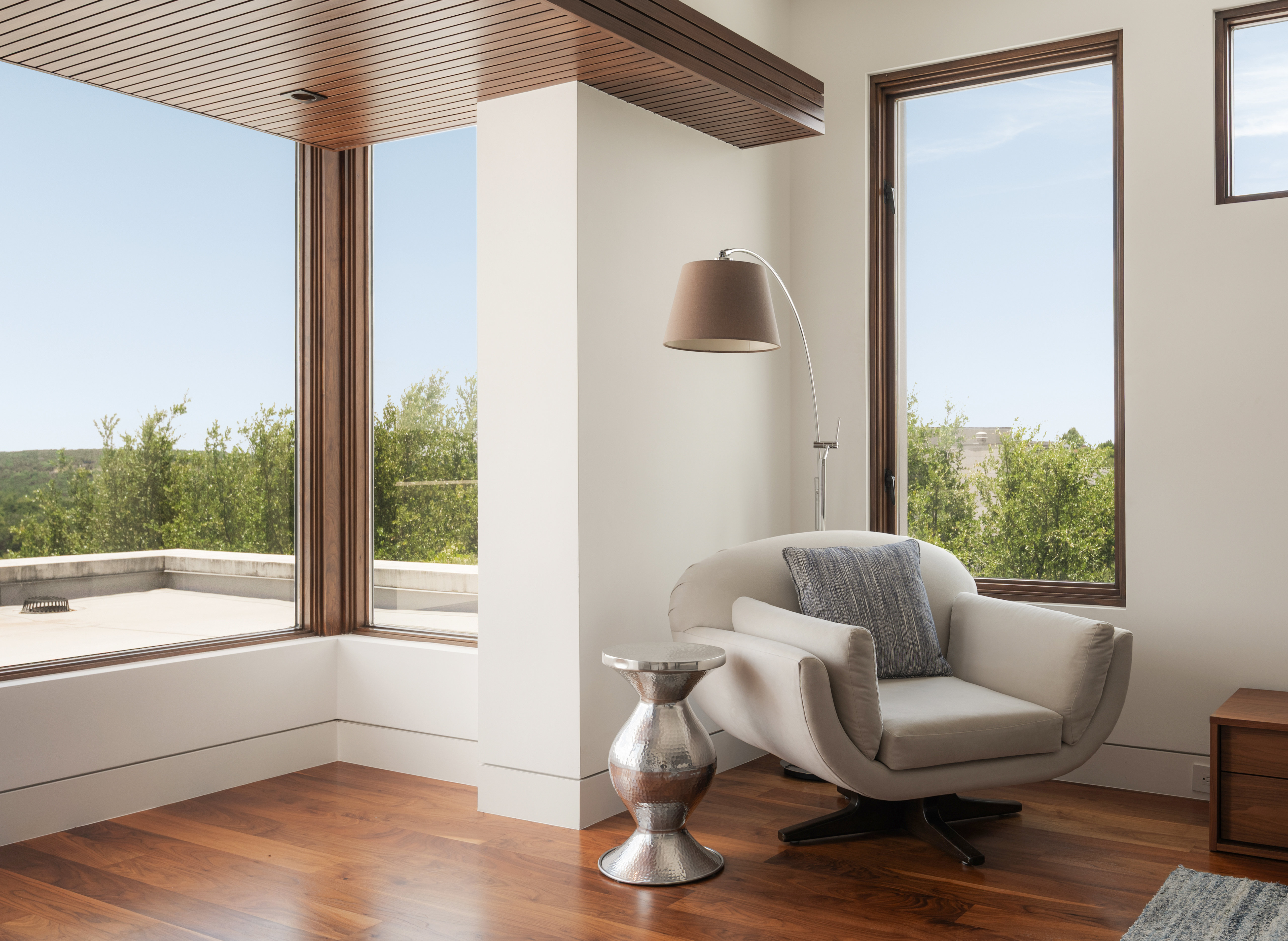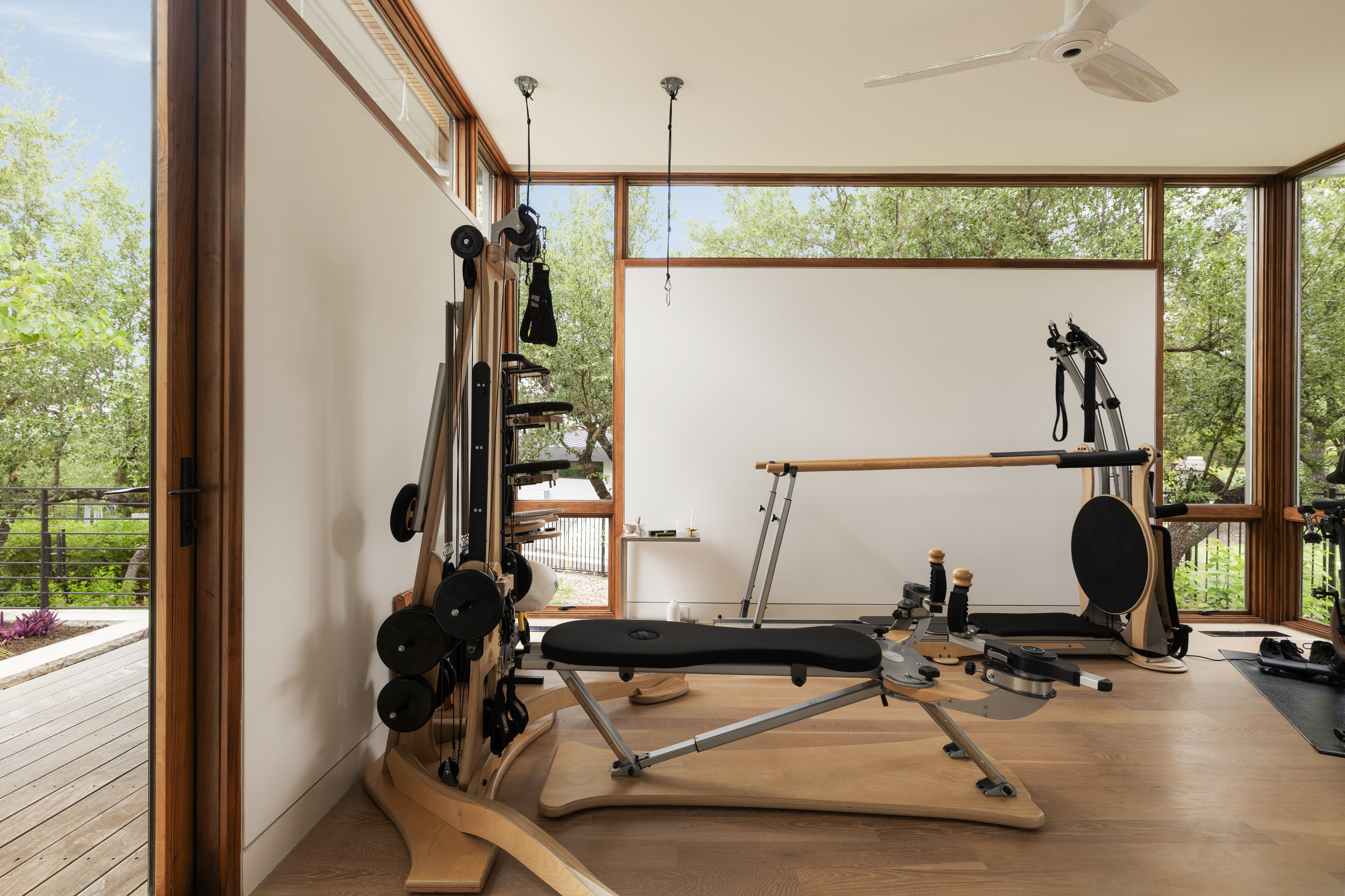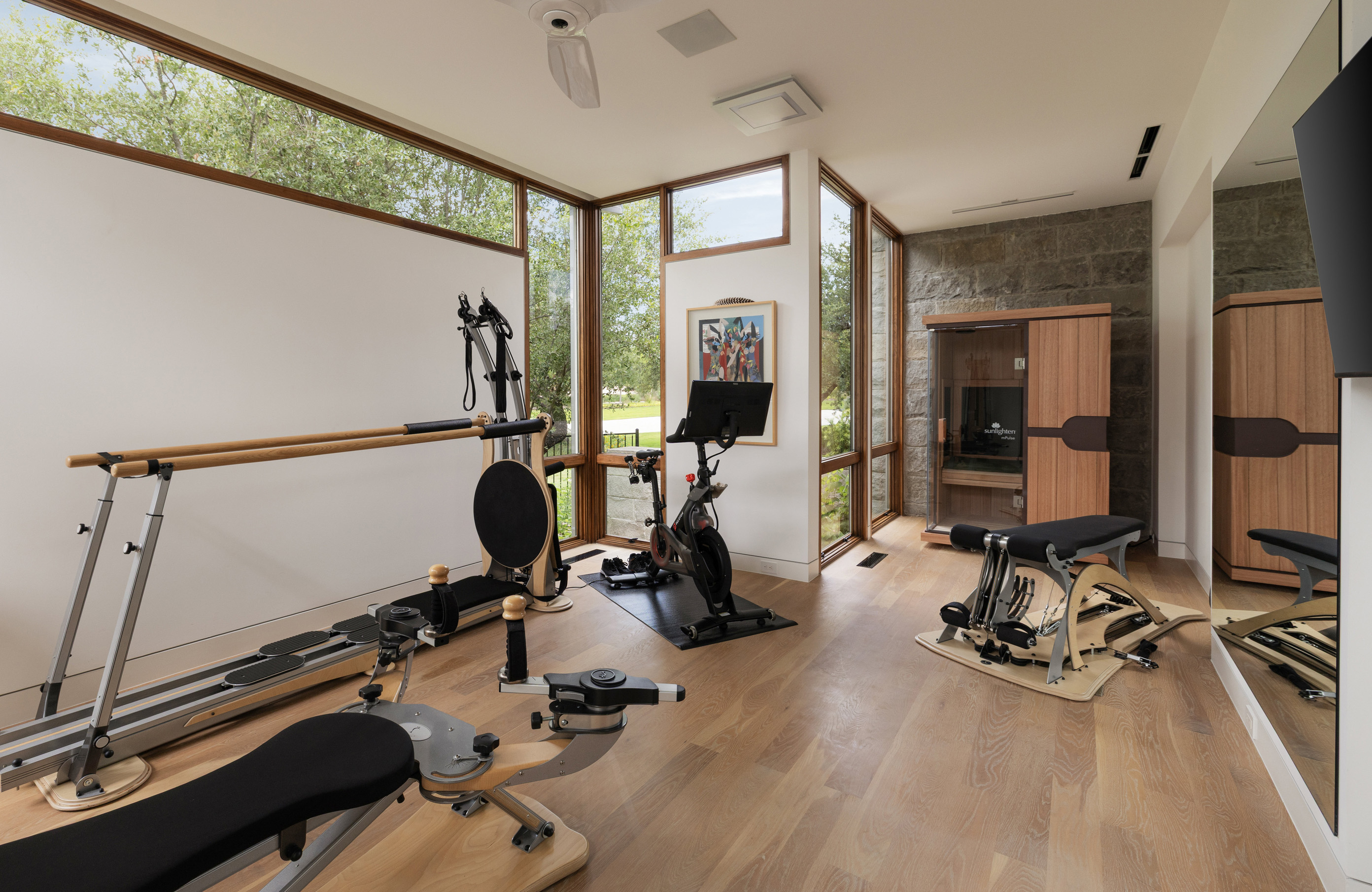 An adjacent home gym—bathed in natural light with floor-to-ceiling mirrors and rift-sawn white oak floors—feels like a modern treehouse.