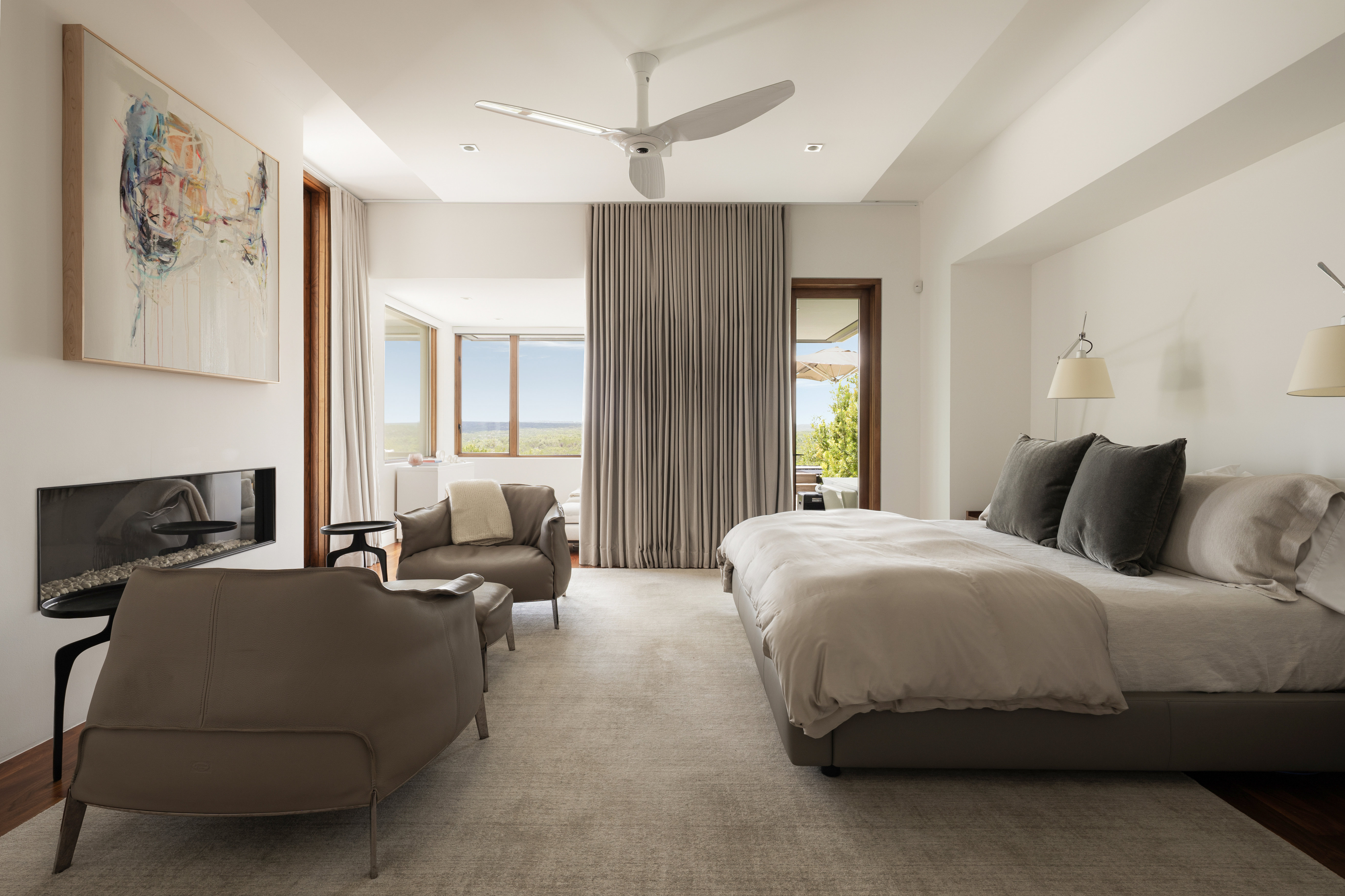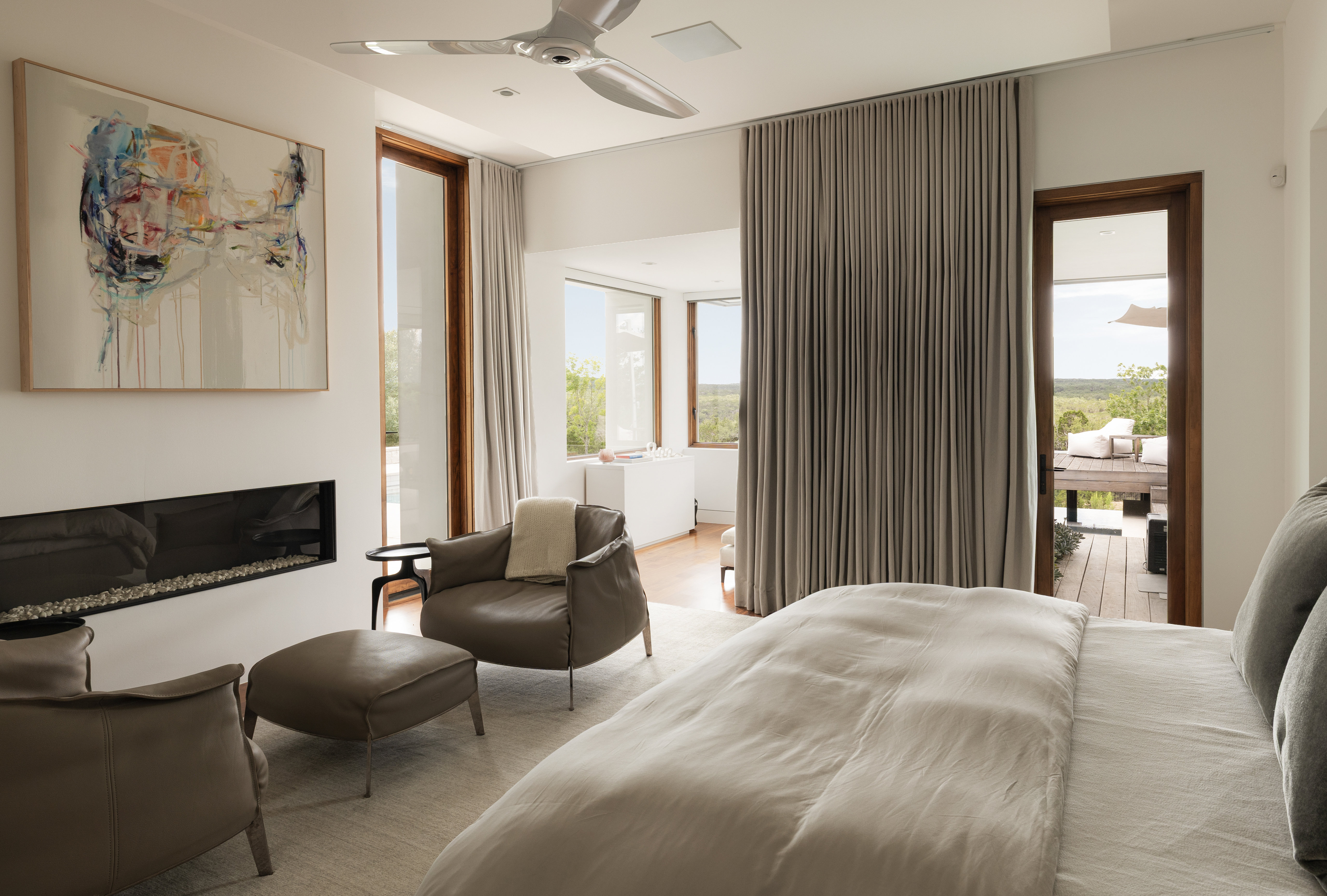 The private owner’s wing is a true luxury retreat, with a gas fireplace, sitting area, lounge area with automated shades and hideaway TV, cove lighting, and blackout drapes.