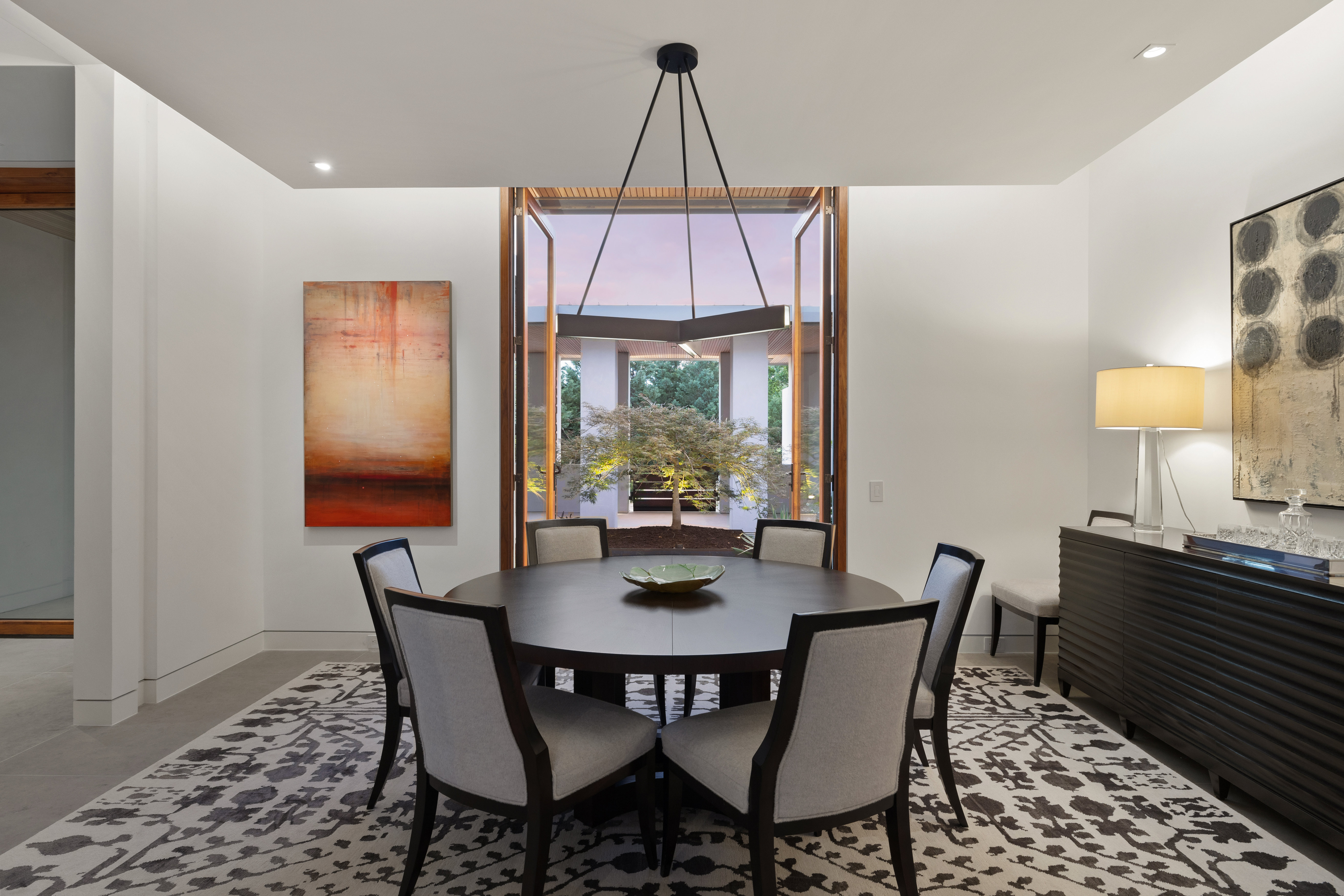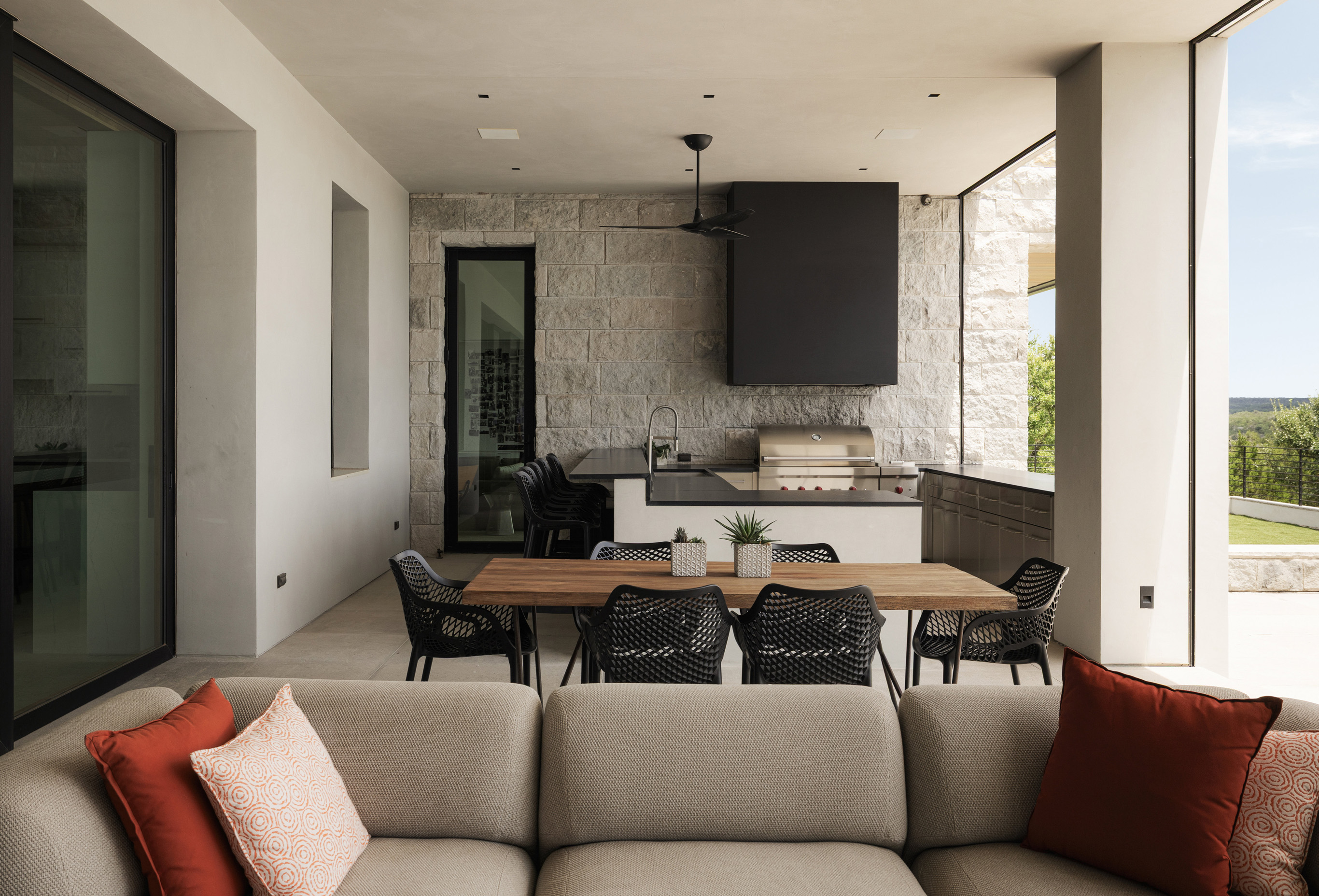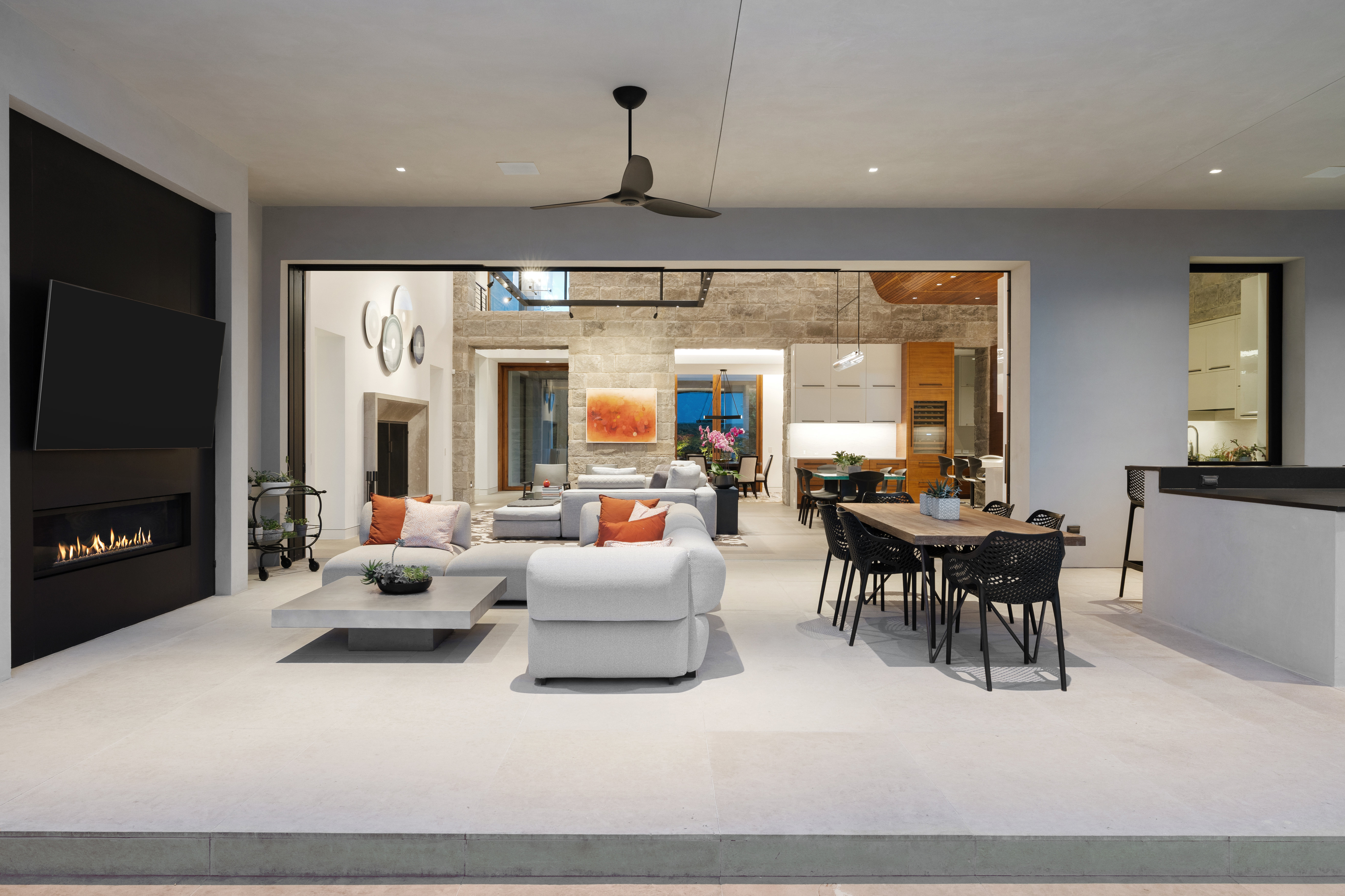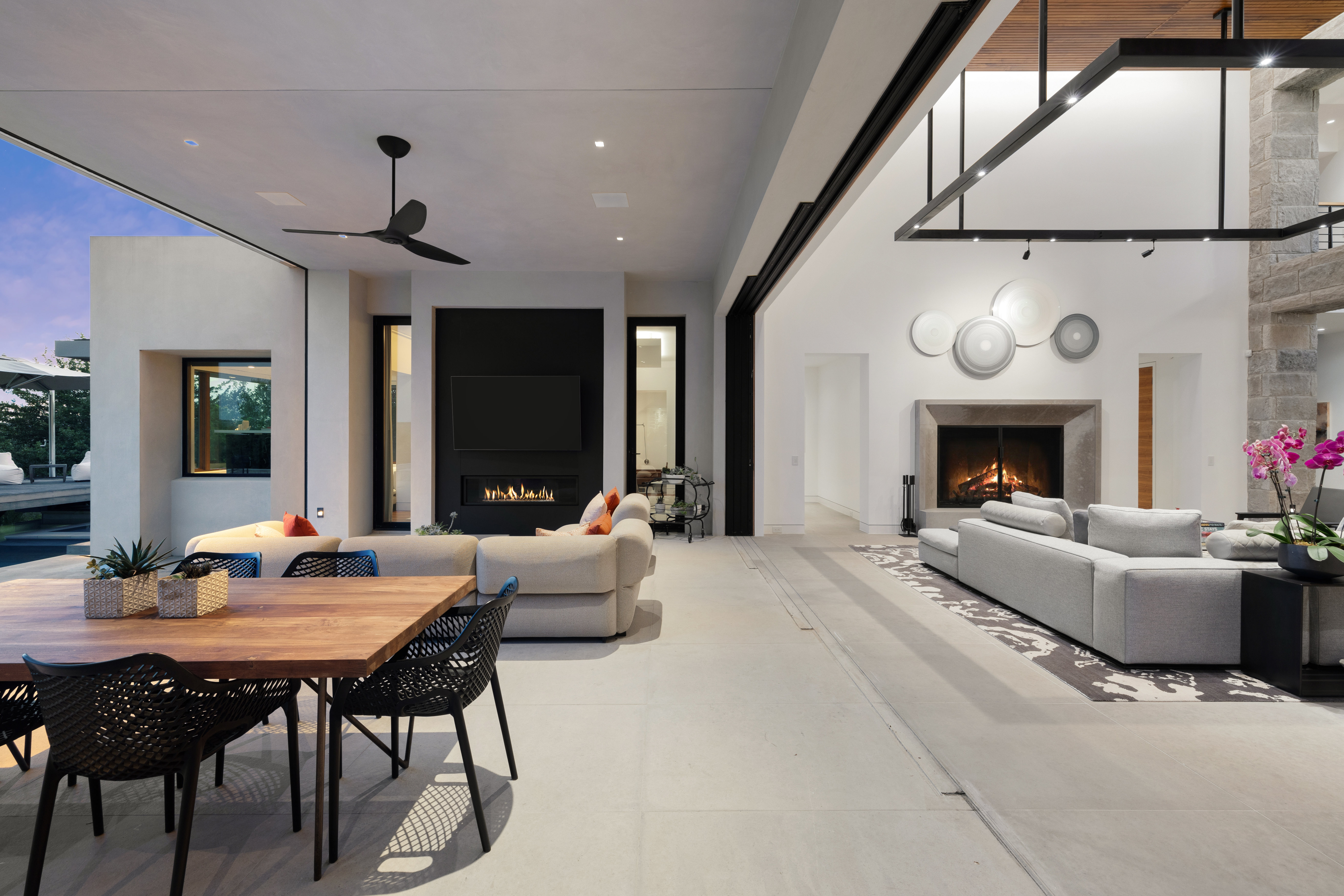 Indoor dining flows effortlessly into multiple entertaining areas, including: